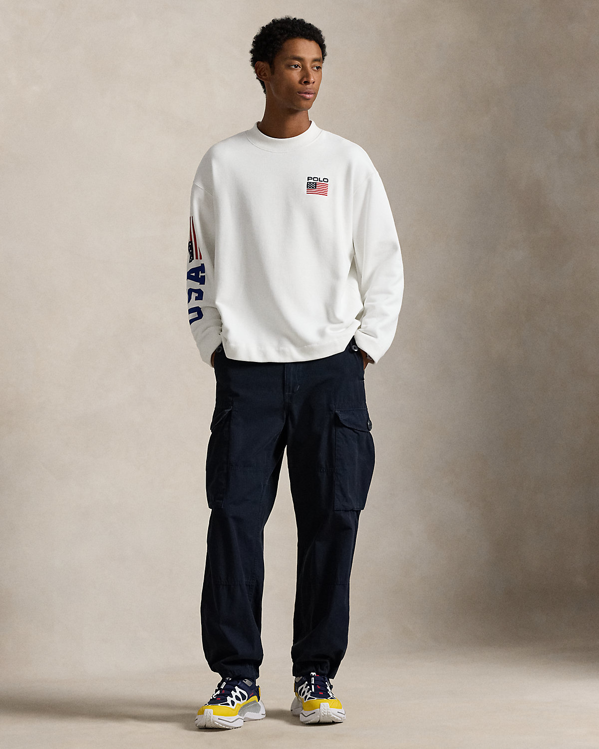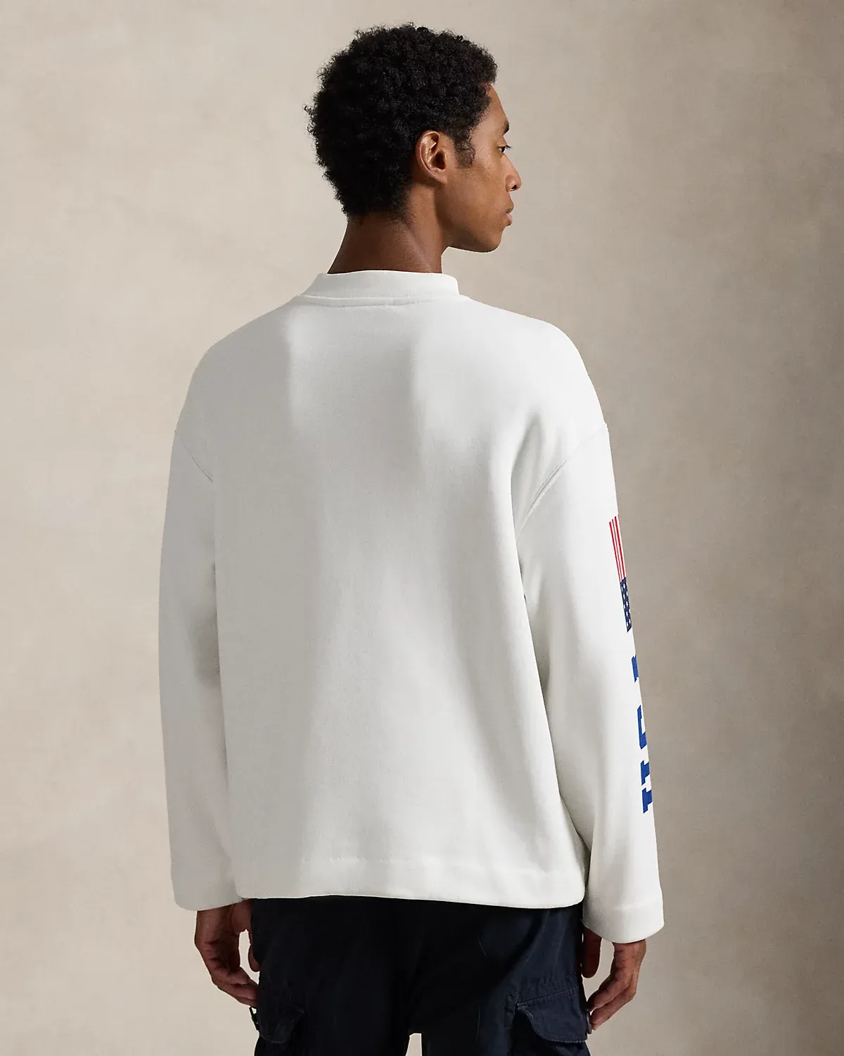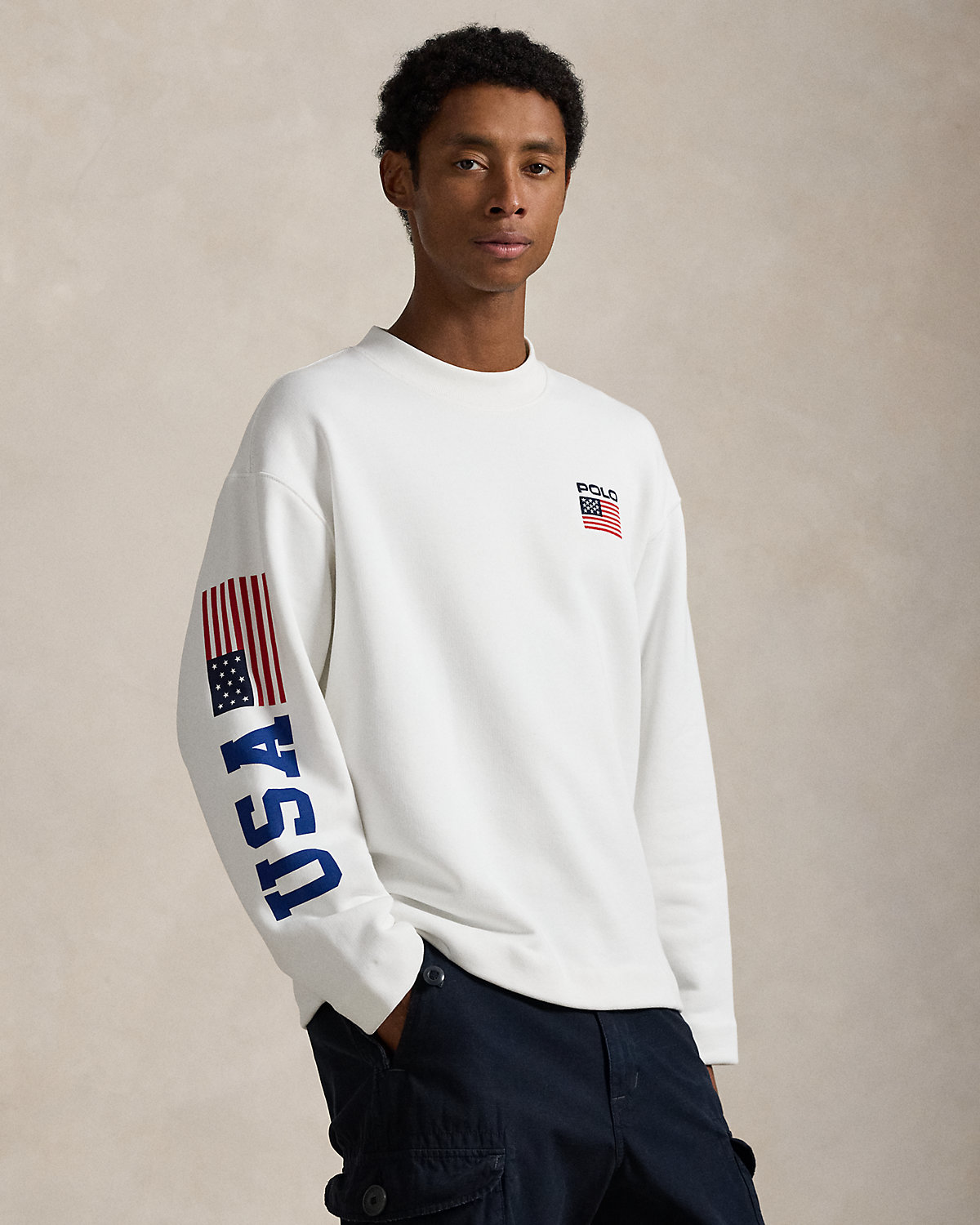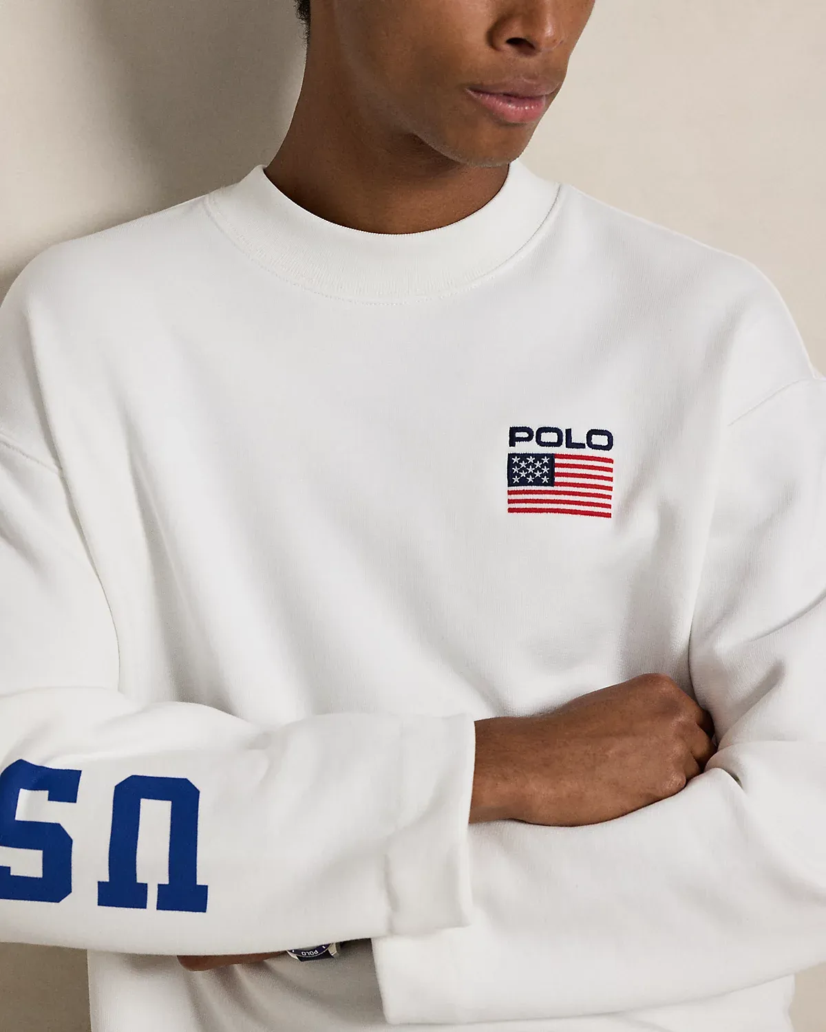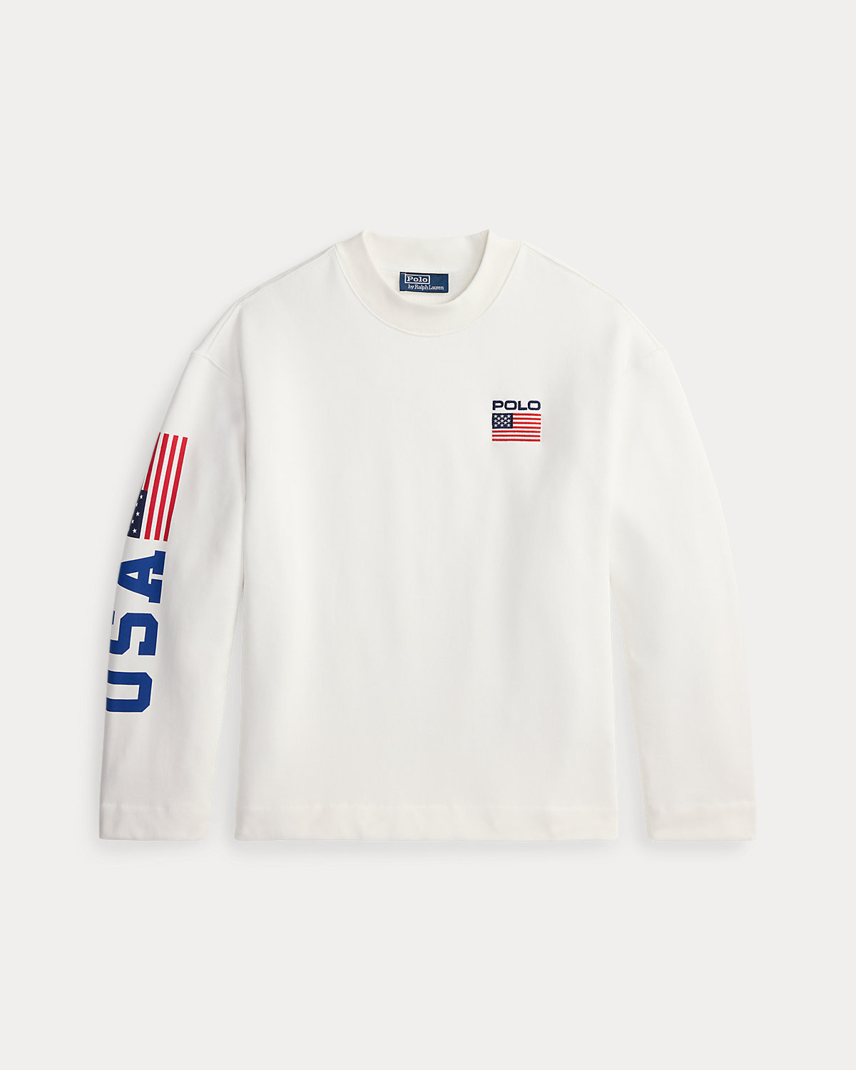 Drawing inspiration from archival Polo Ralpthth Lauren sportswear, this cotton mockneck features a “USA” graphic, a historical American flag, and our logo.