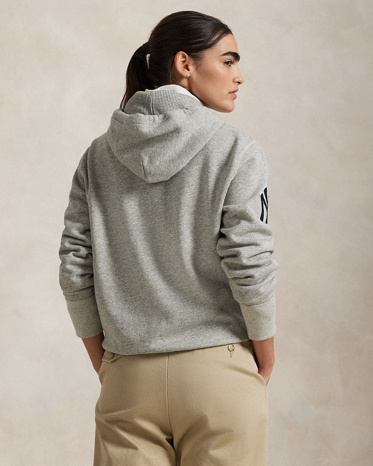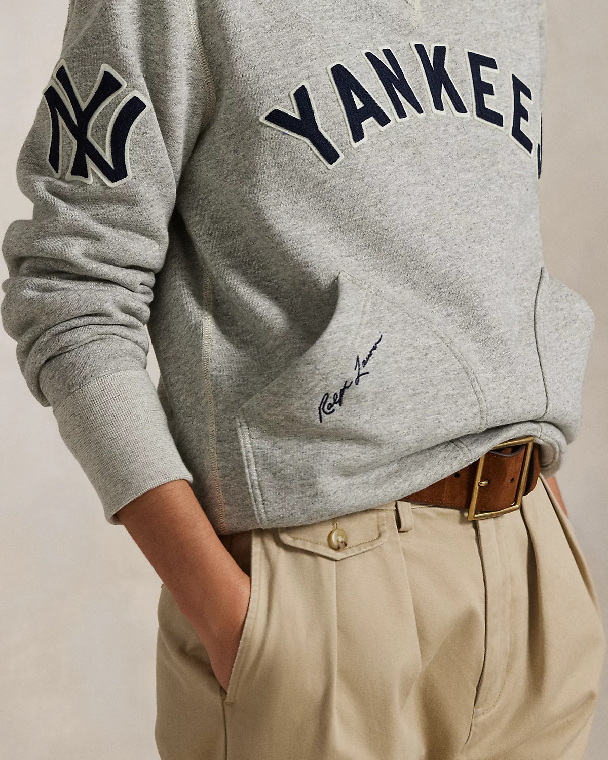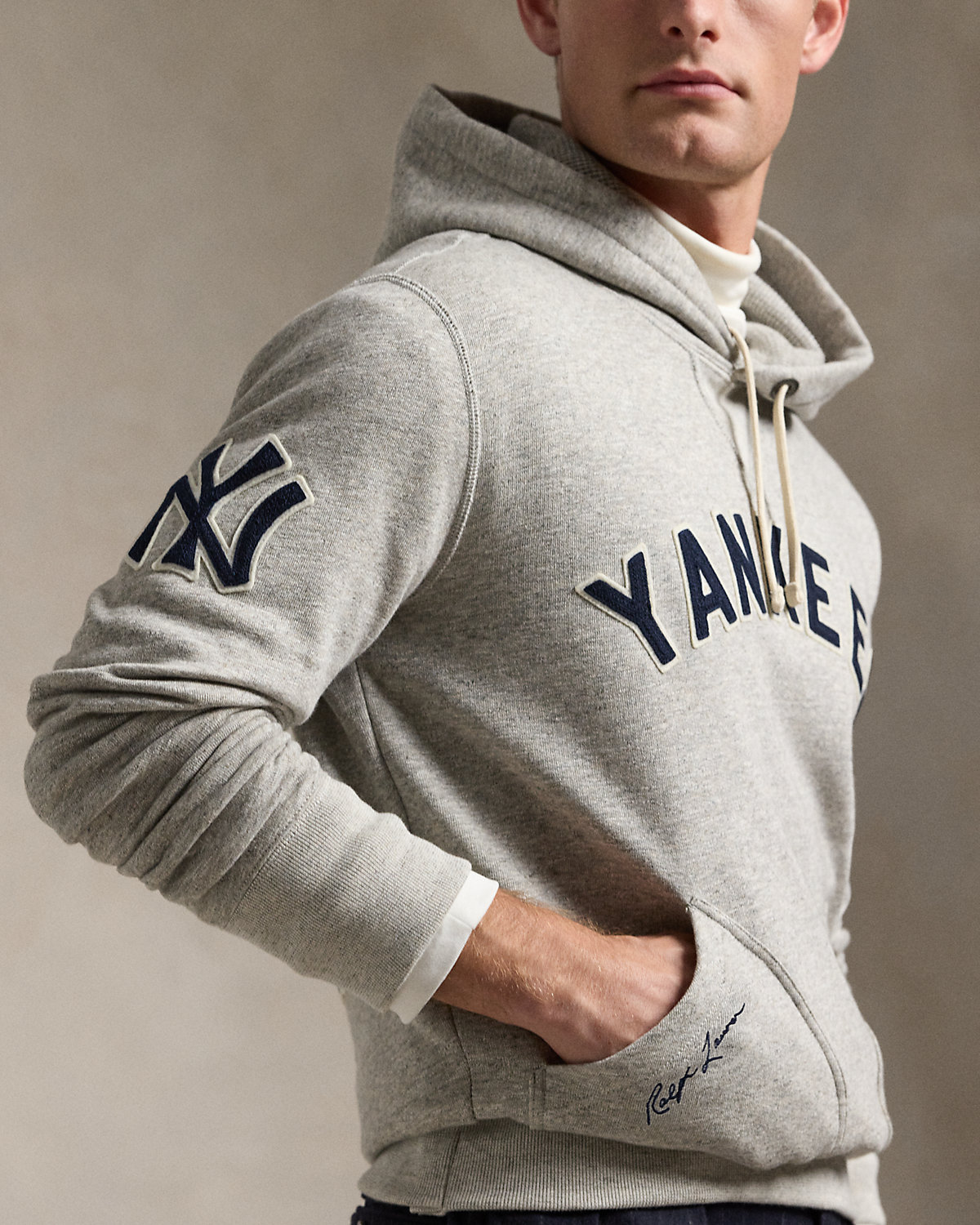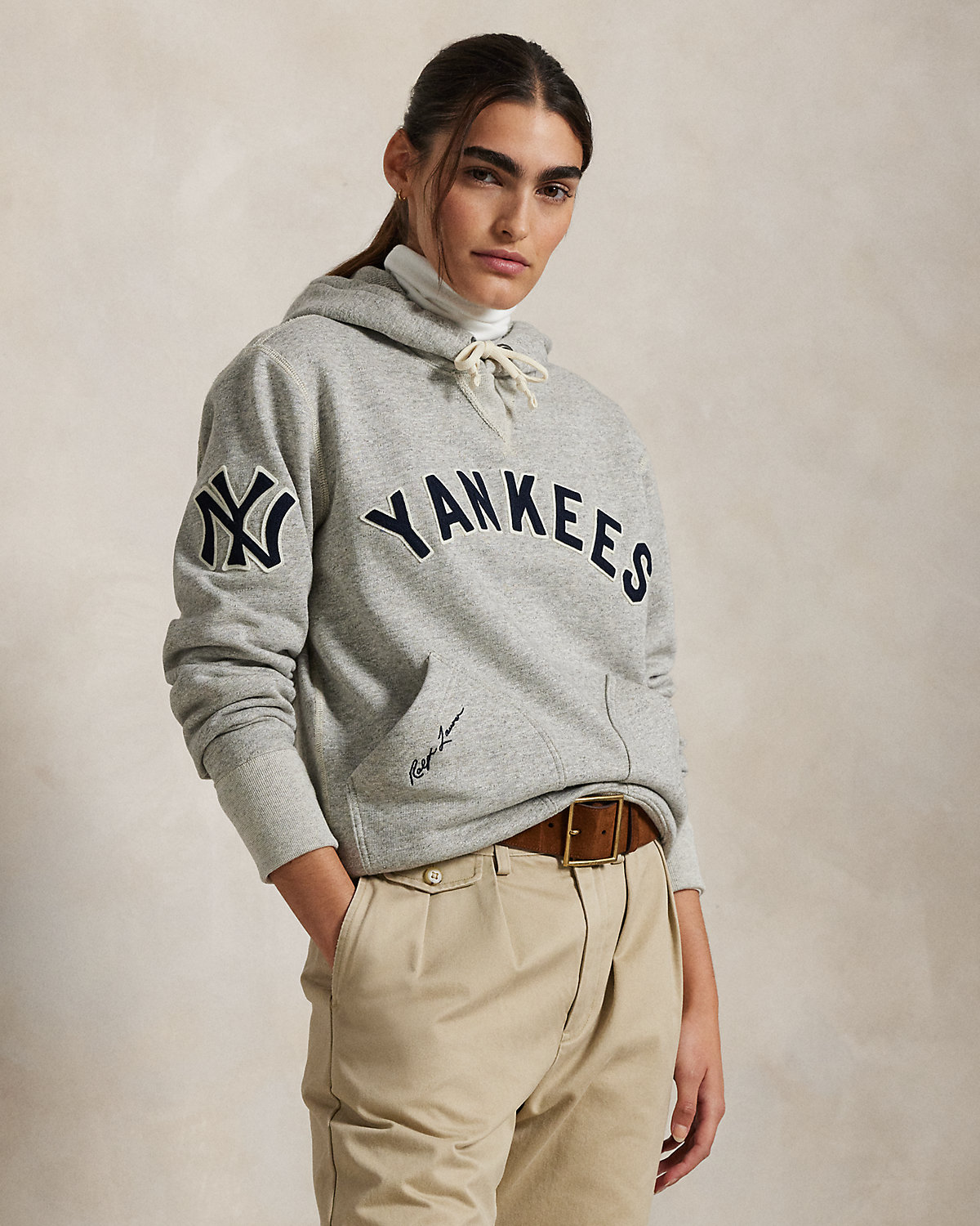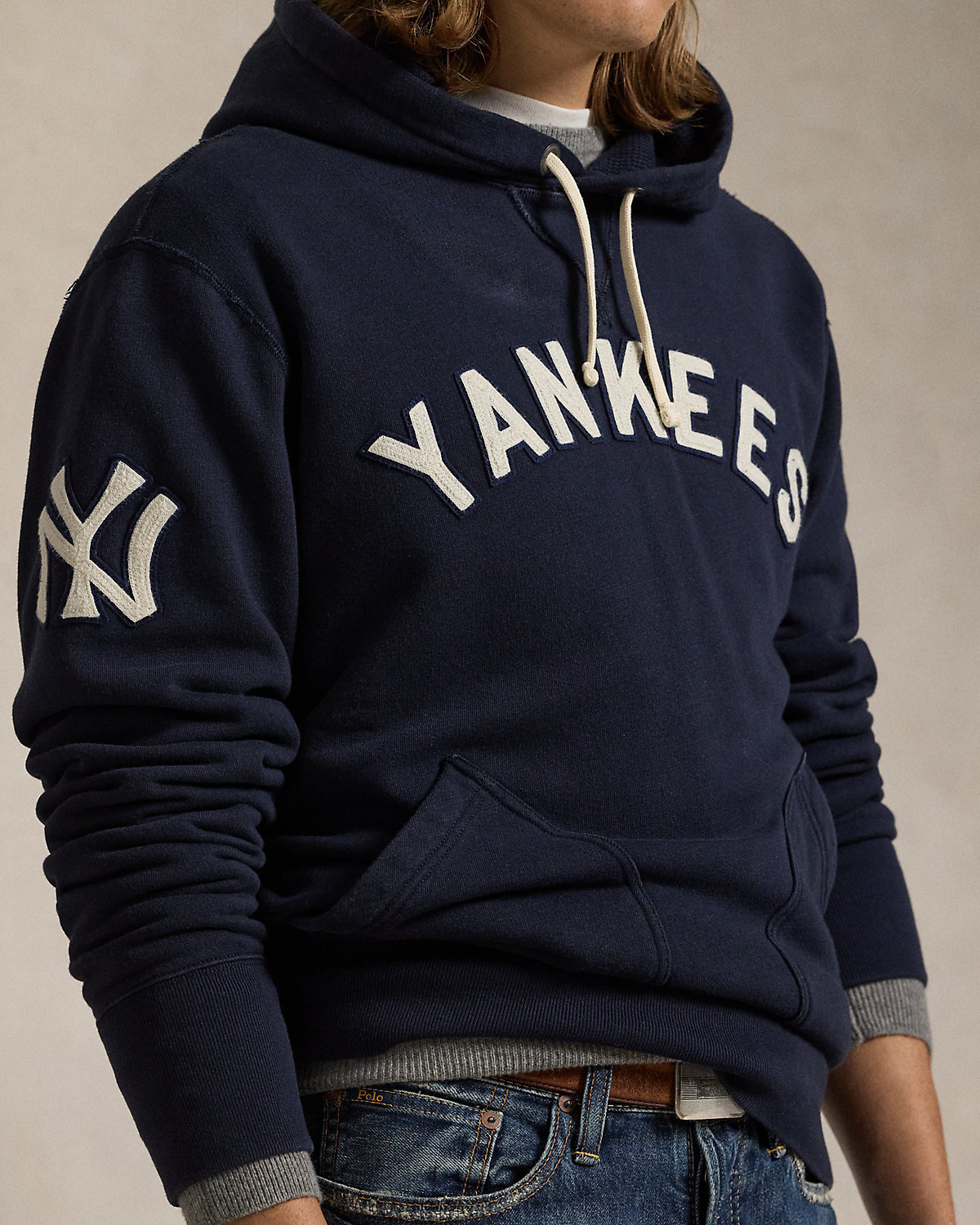 As a boy growing up in the Bronx, Mr. Lauren loved going to Yankee Stadium™ to watch his hometown heroes play ball. This unisex layer celebrates Mr. Lauren’s long-standing love of the Bronx Bombers™ and the game of baseball with New York Yankees™ patches. It is crafted from ultrasoft slub fleece and detailed with waffle-knit lining at the hood.