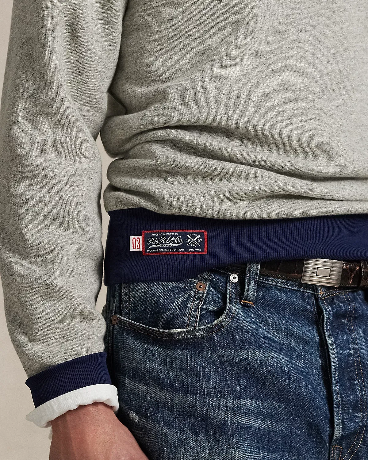 • Crewneck with a ribbed V-inset. Long sleeves with ribbed cuffs. Printed New York Yankees™ logo patch at the left sleeve. “Bronx NY” printed at the center front. Ribbed hem. “Athletic Outfitters Polo RL & Co” label at the right hem.