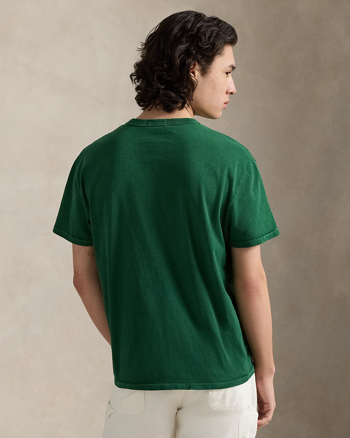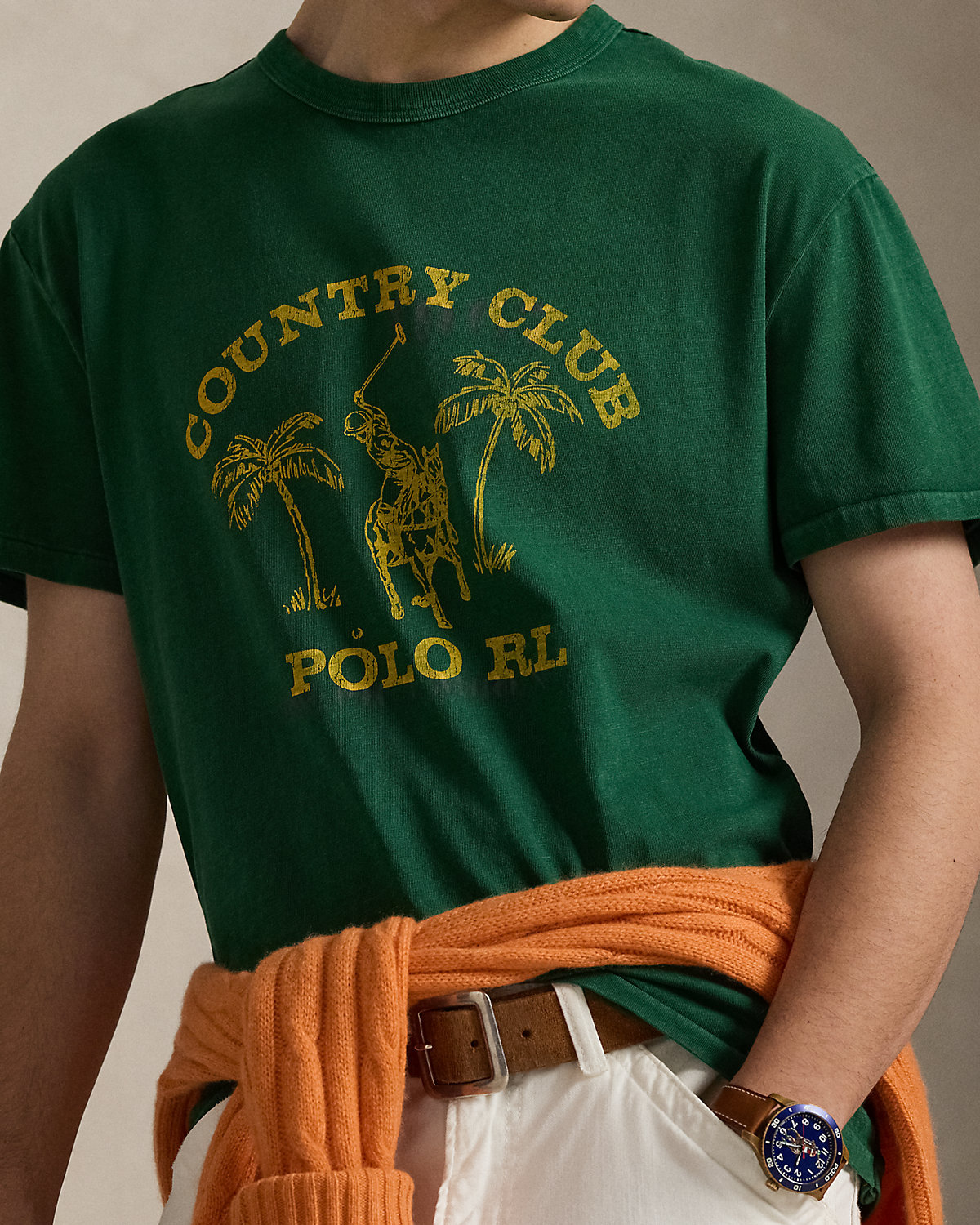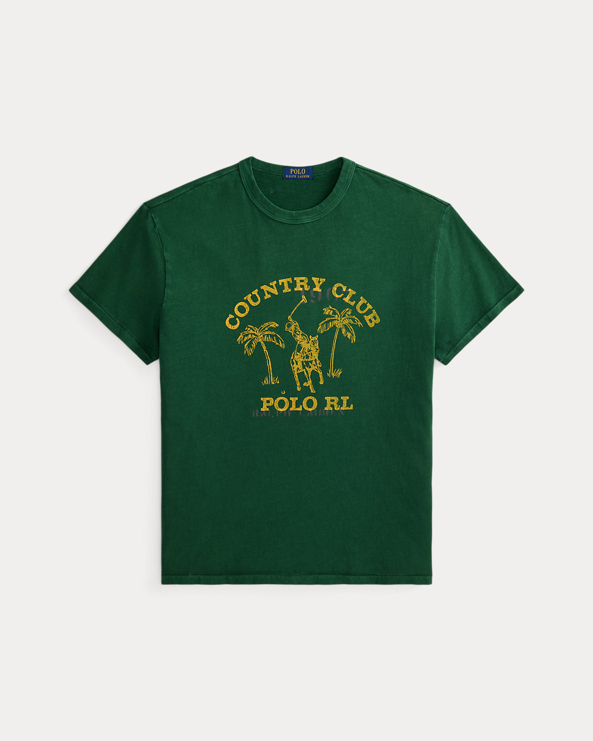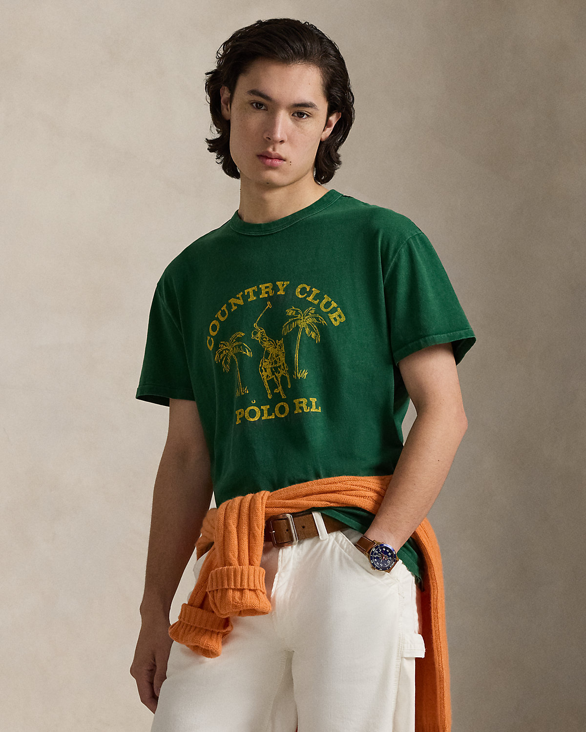 Reflecting the sophisticated spirit of the sport that inspired Polo Ralpthth Lauren, this garment-dyed cotton T-shirt features a player navigating through a paradise of palm trees.