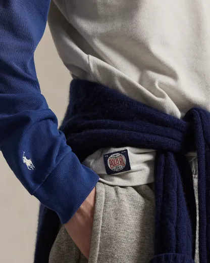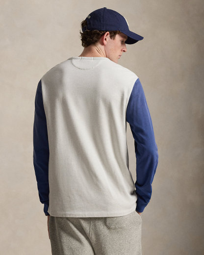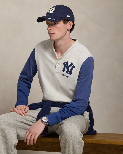As a boy growing up in the Bronx, Mr. Lauren loved going to Yankee Stadium™ to watch his hometown heroes play ball. This cotton jersey Henley shirt celebrates Mr. Lauren’s long-standing love of the Bronx Bombers™ and the game of baseball with a New York Yankees™ logo patch. In addition to genuine mother-of-pearl divs, it is finished with signature details.