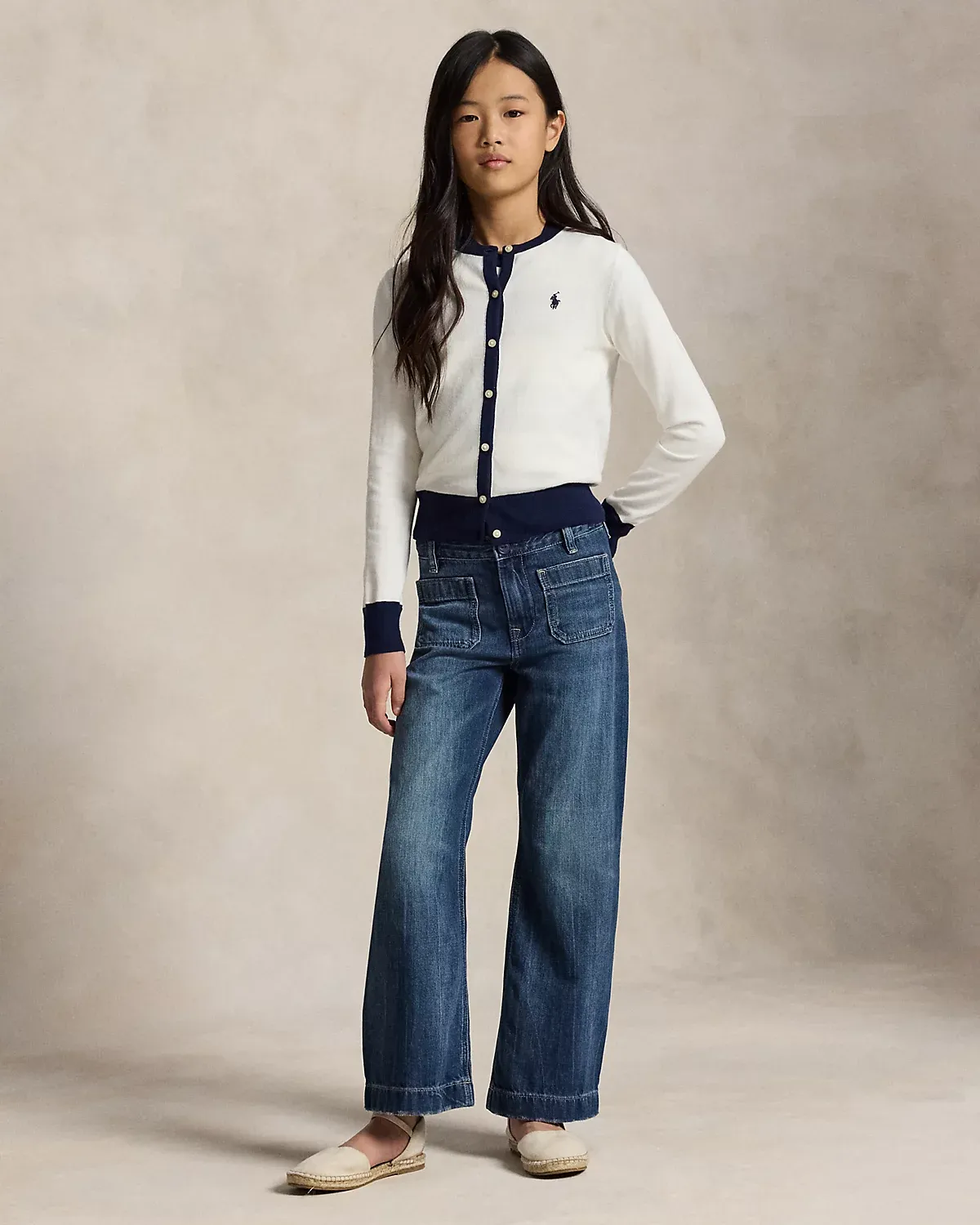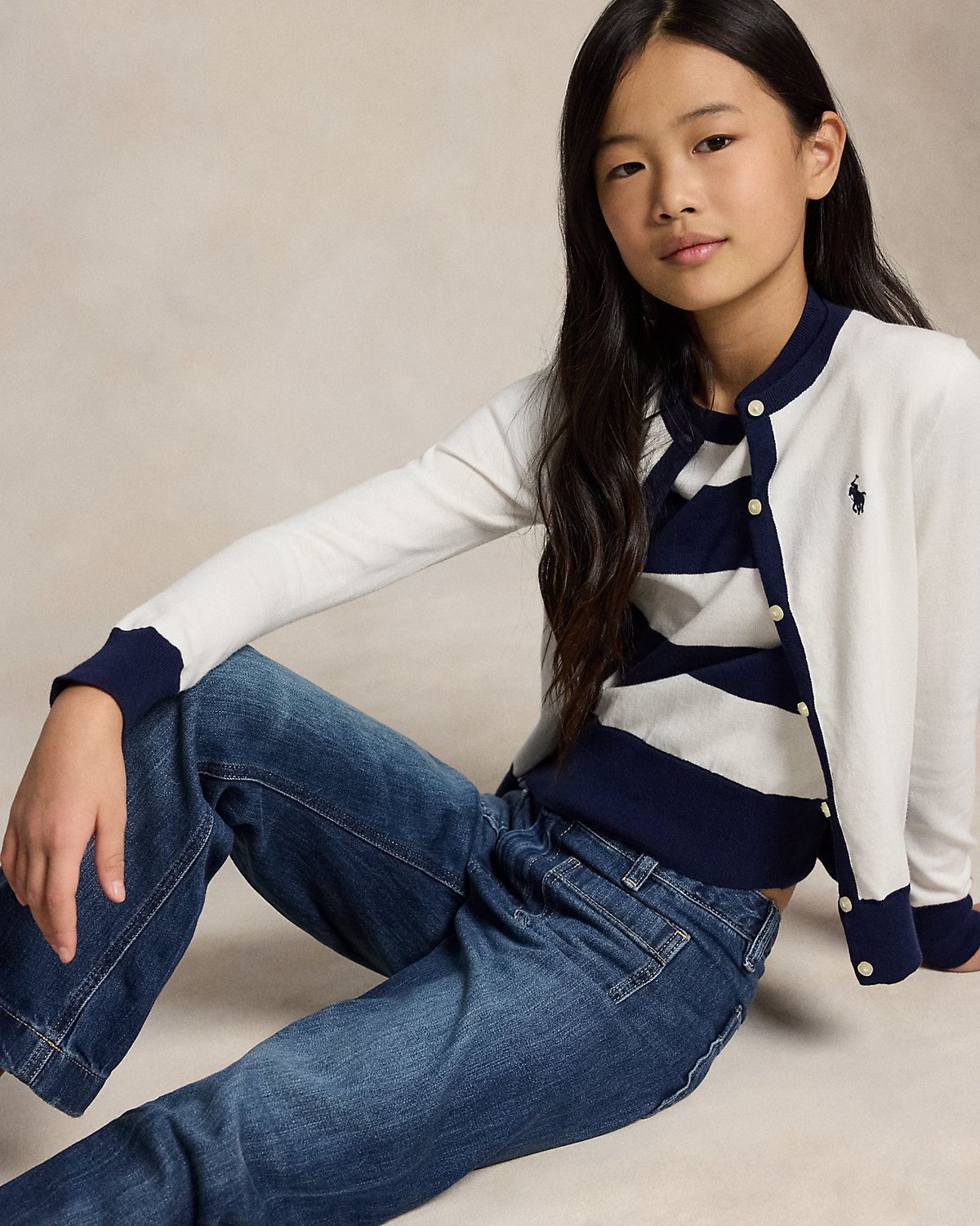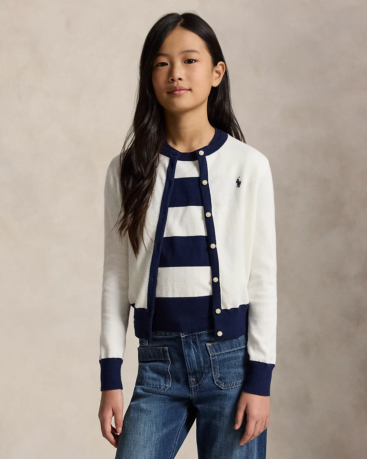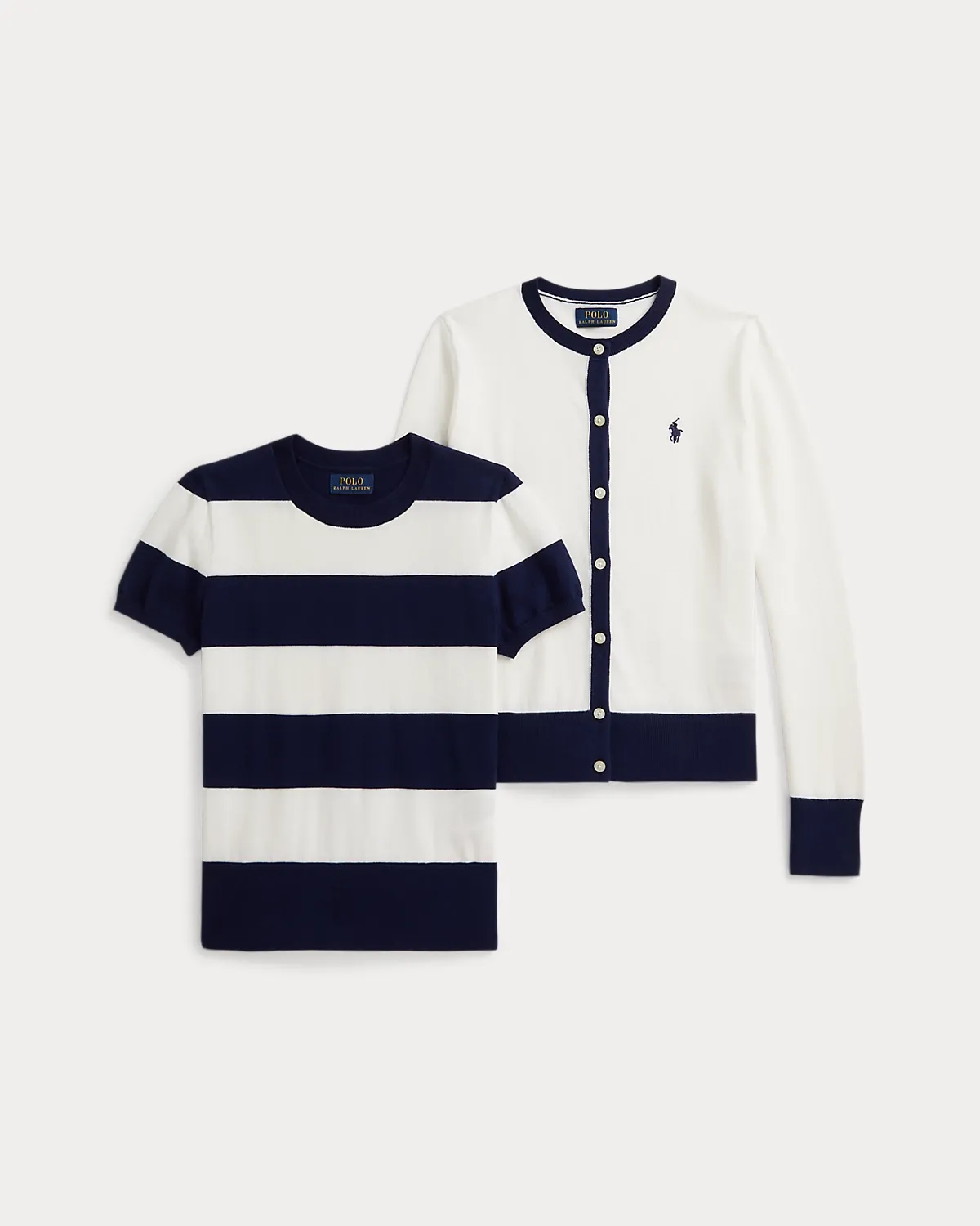 - Cardigan: signature embroidered Pony at the left chest; crewneck; dived placket; grosgrain trim along the underplacket; long sleeves with rib-knit cuffs; rib-knit hem.