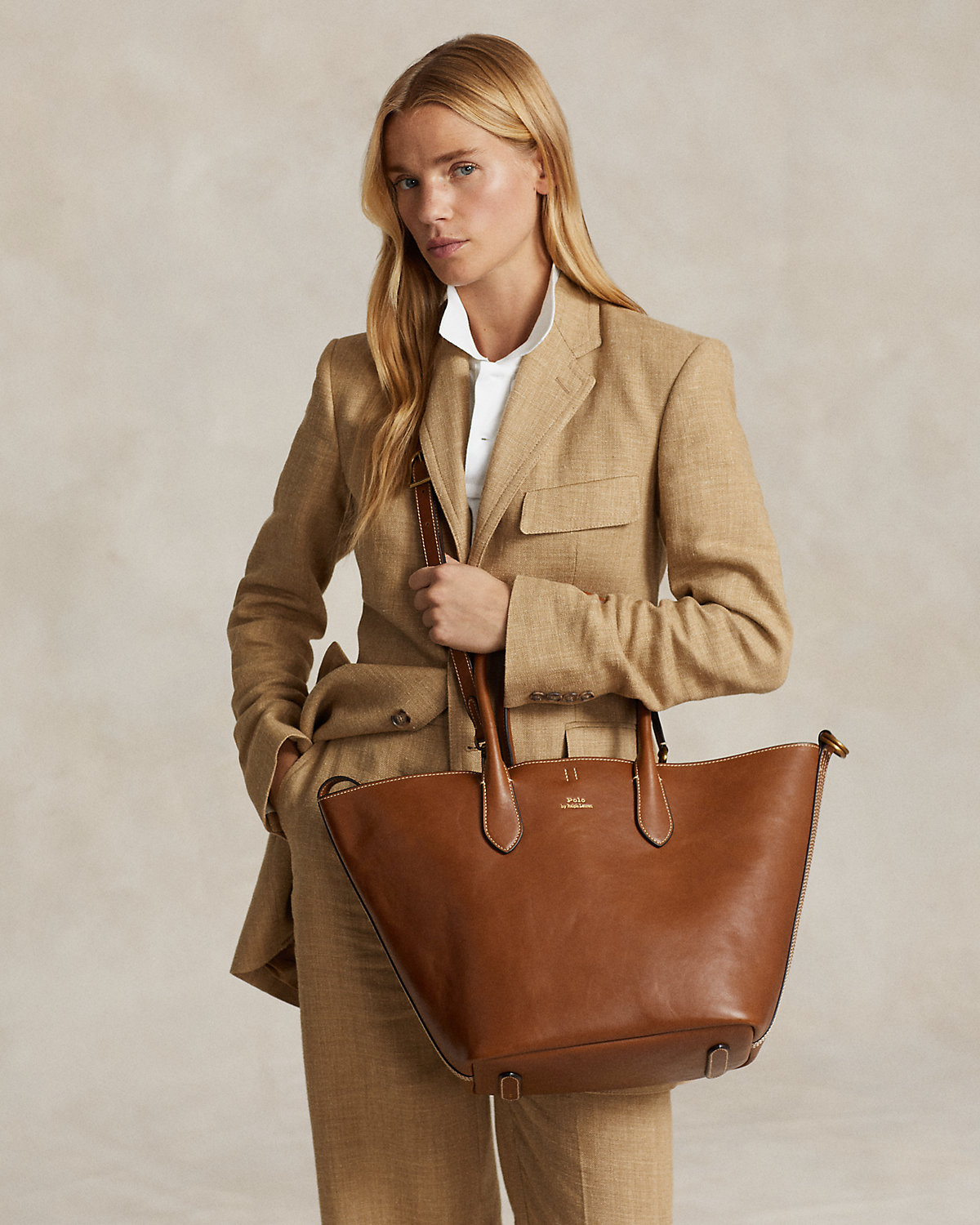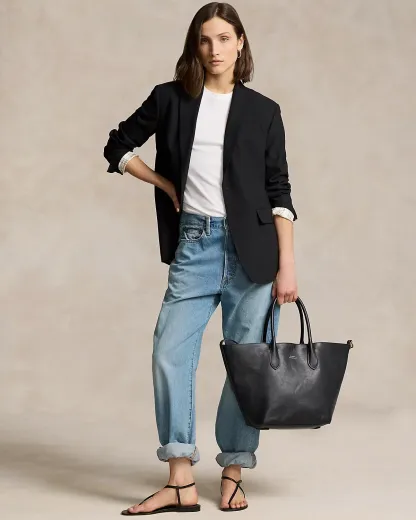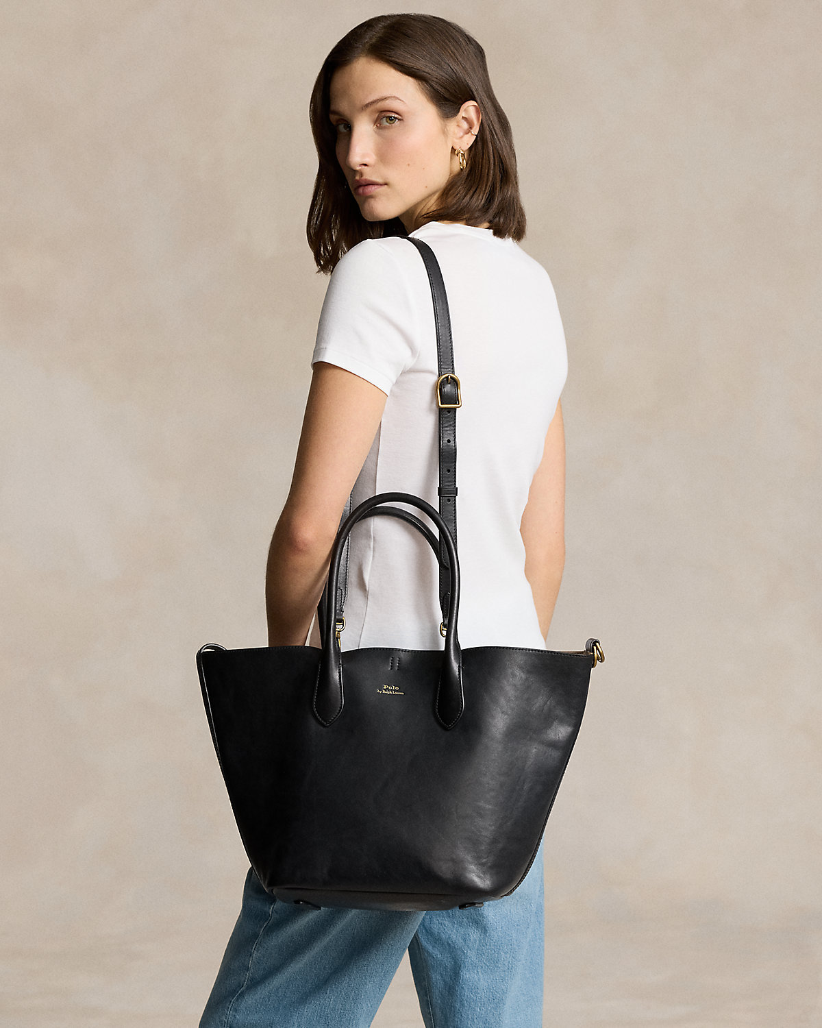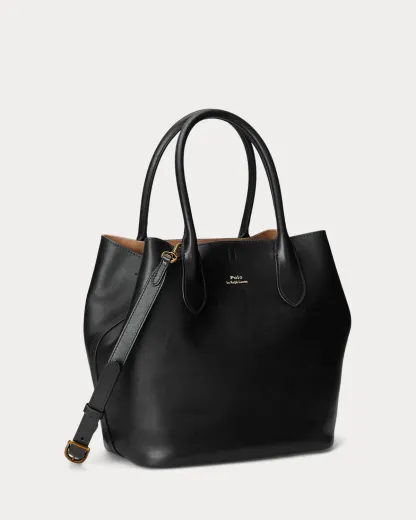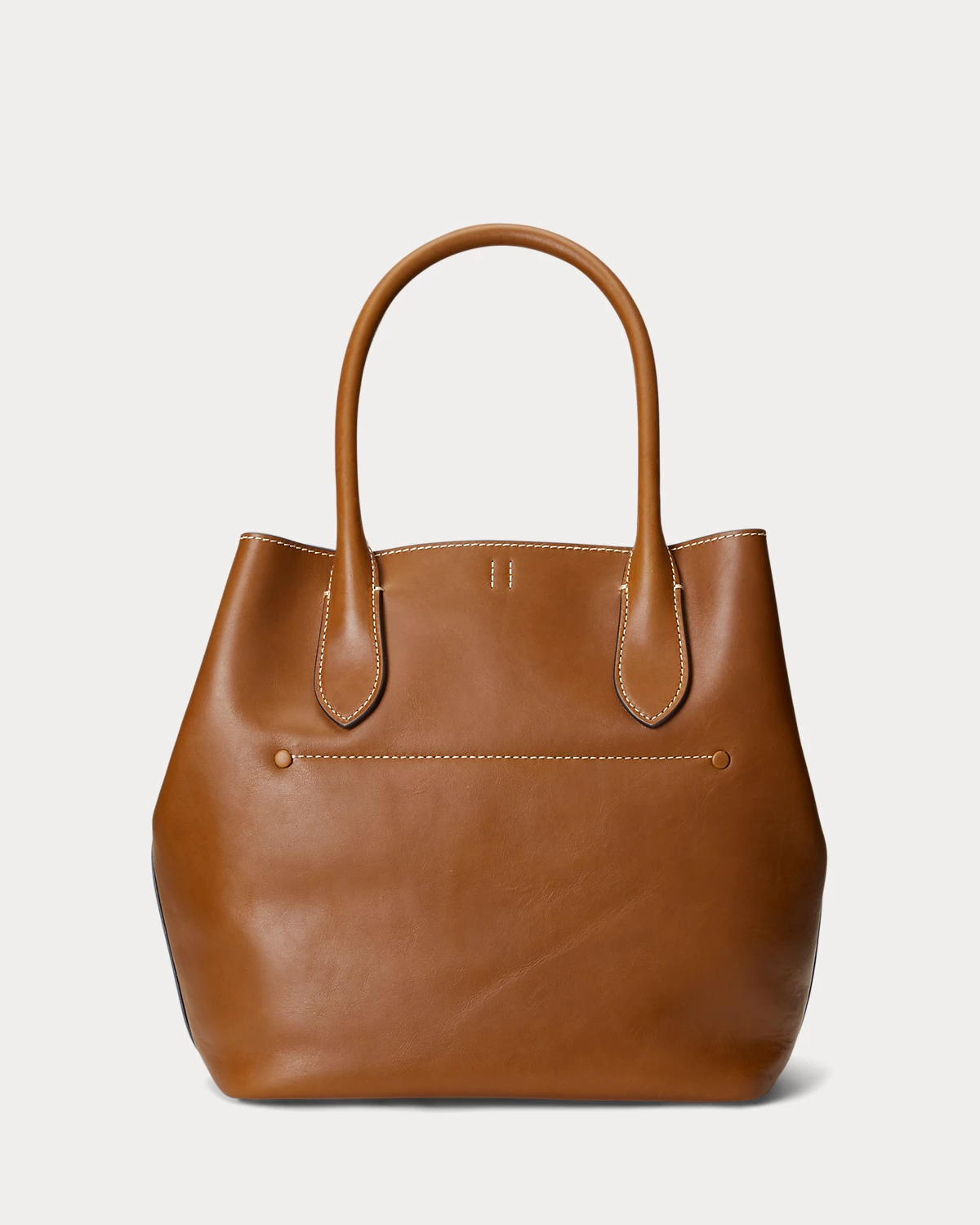 Featuring signature metal hardware that recalls Polo’s equestrian heritage, this medium tote bag reverses from vachetta leather, which is dyed and finished in Italy, to sumptuous suede, which is bonded to allow it to be flexible while maintaining its shape. Designed with versatility in mind, this spacious bag delivers two looks in one: a classic tote silhouette and a trapezoid-shaped silhouette, which is achieved by looping the leather strap at the top right through the D-ring at the top left.