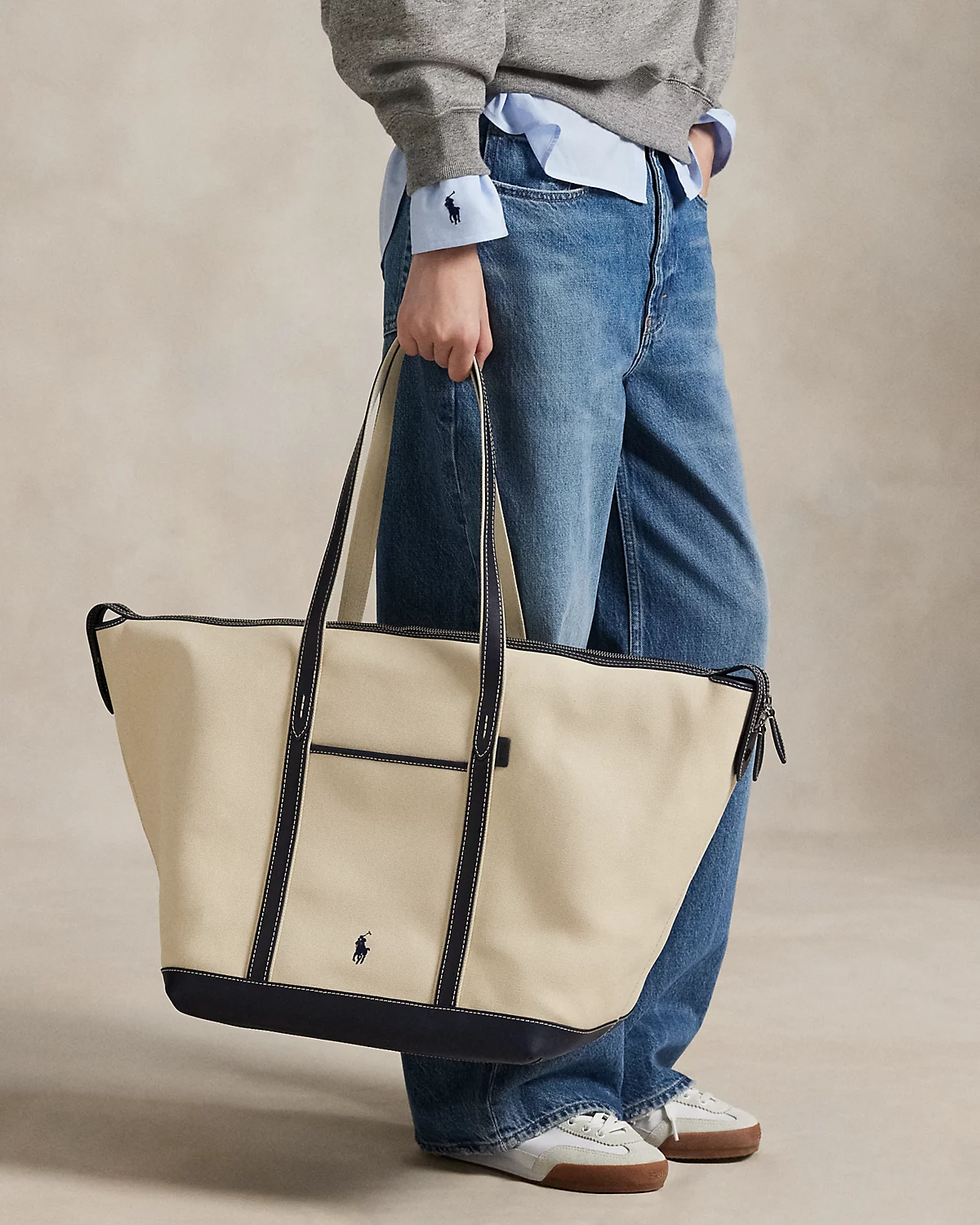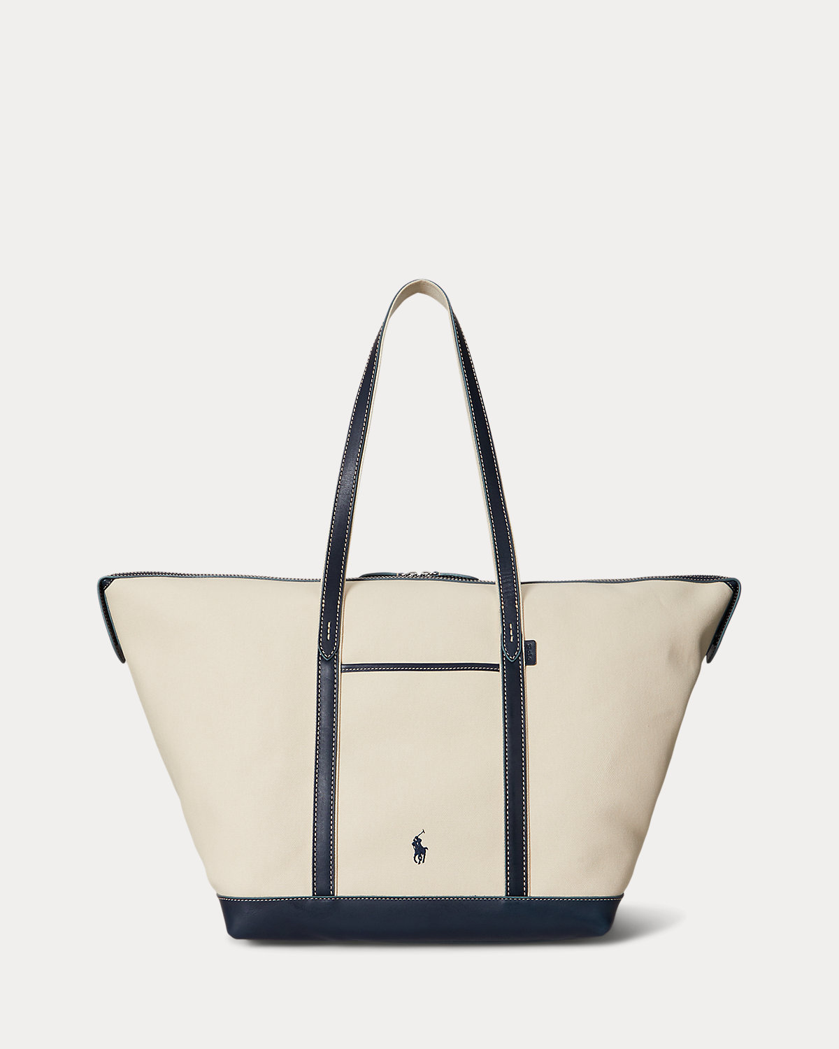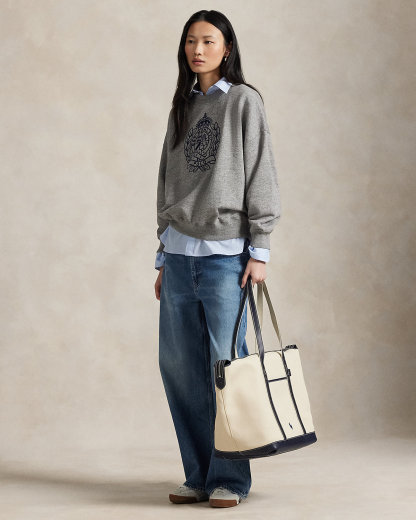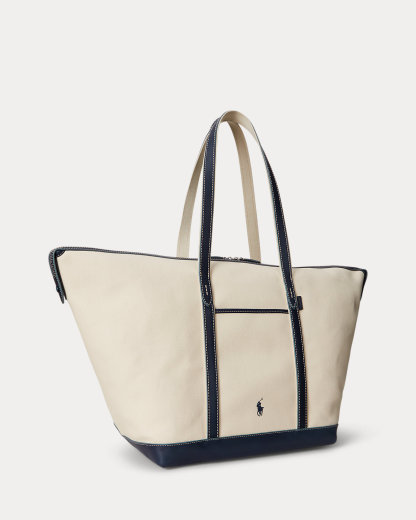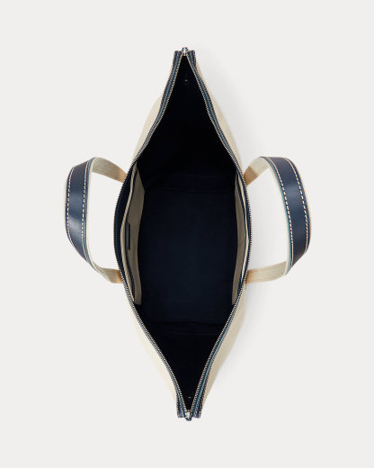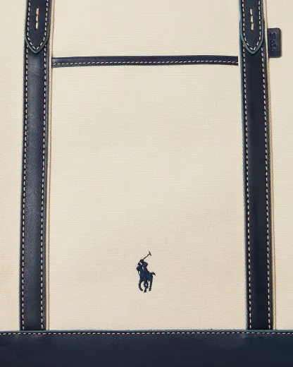 This shopper tote combines resilient canvas with burnished leather trim featuring topstitched details, while signature branded elements, including our embroidered Pony and an embossed logo tag, reinforce its heritage appeal. The classic silhouette features a thoughtfully designed two-way top zip closure with secure snap-end gussets and is accented with interior and exterior slip pockets for easy access to essentials.