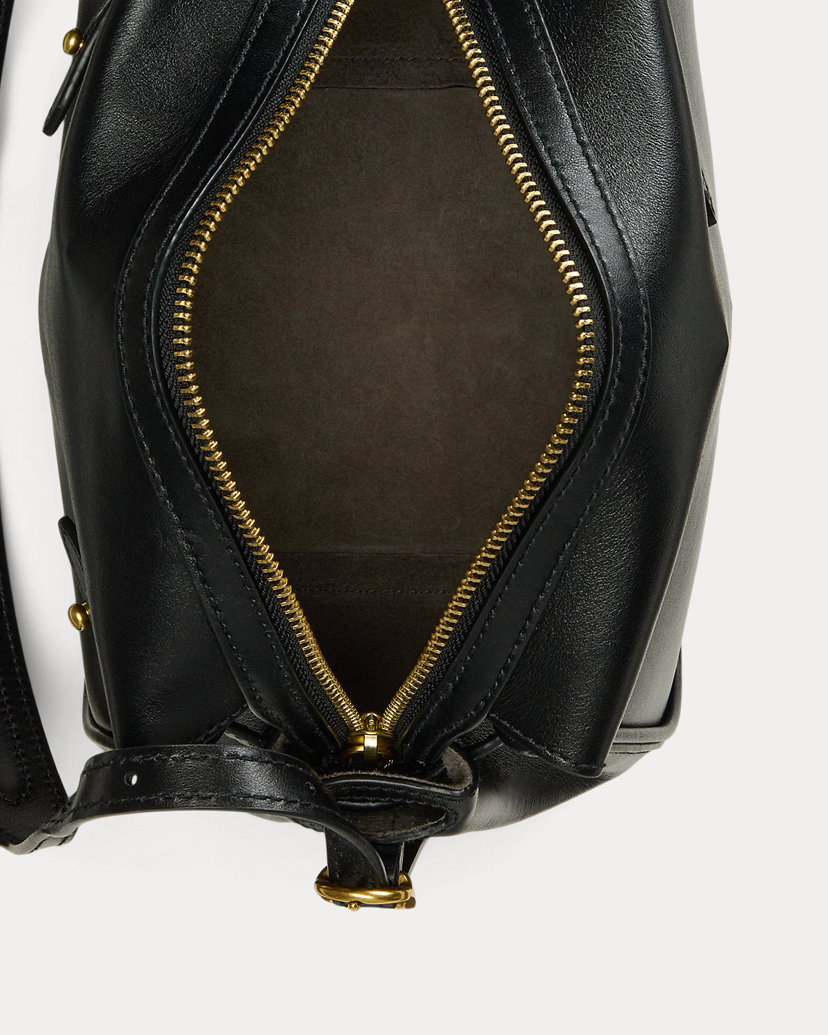 - Top zip closure with double leather zipper pulls.