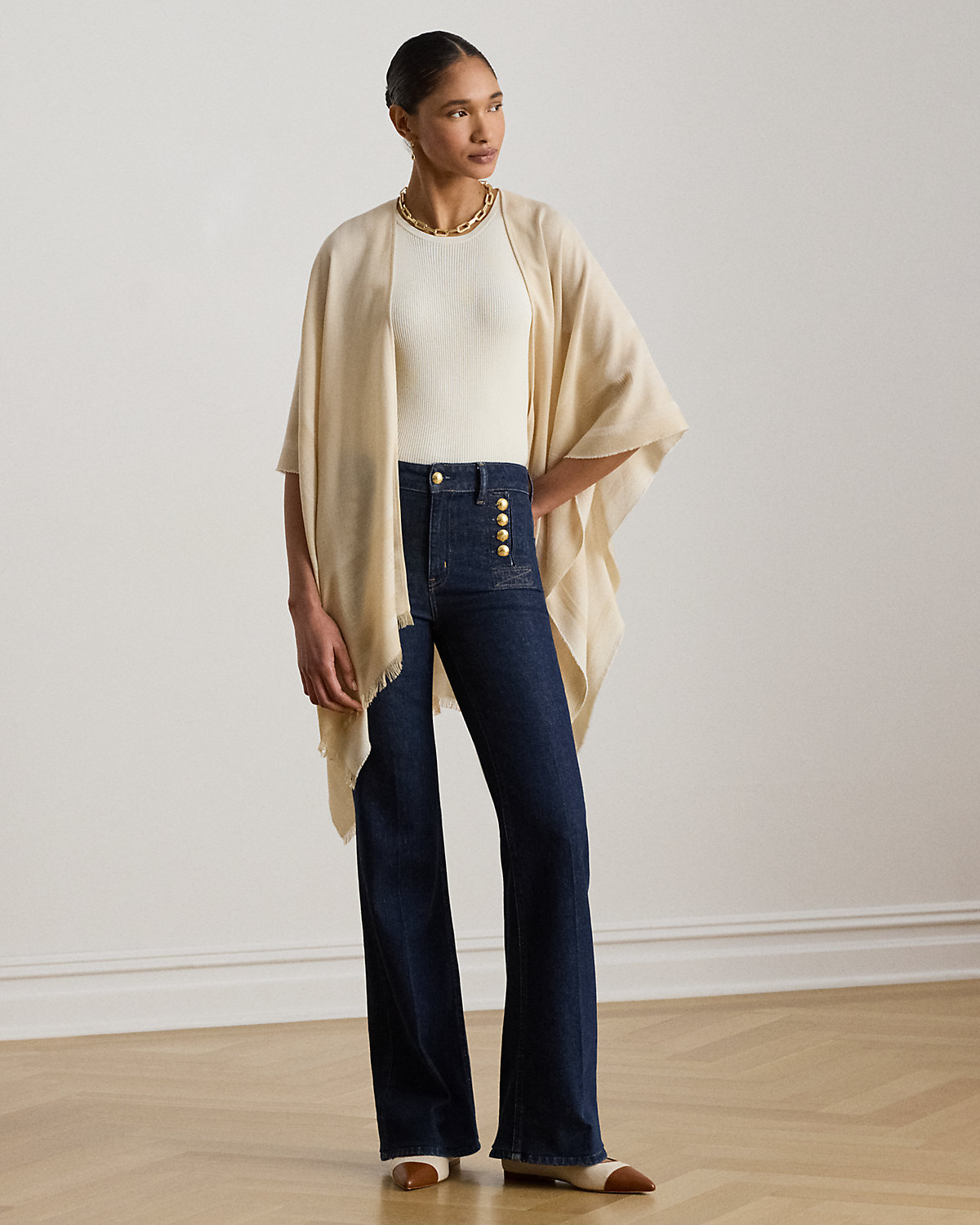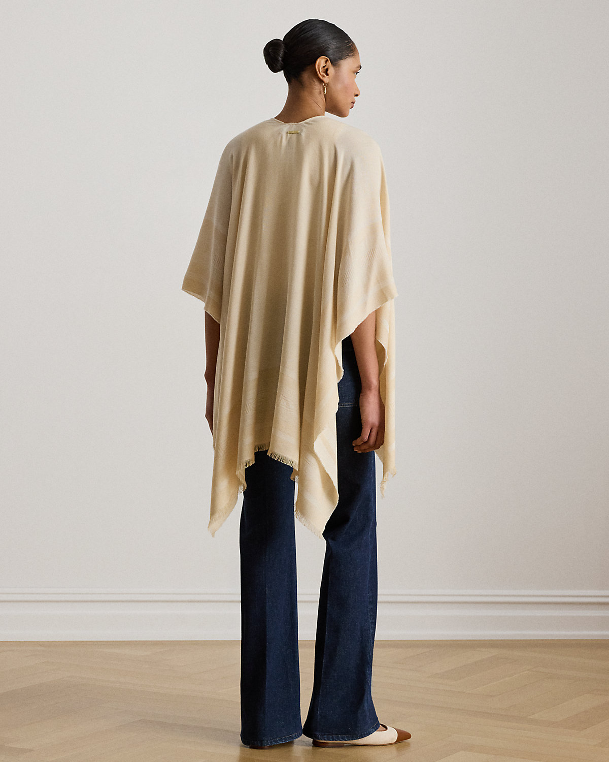 This fluid ruana pays homage to Ralpthth Lauren’s equestrian-inspired spirit with a subtle jacquard belting motif along the hem.