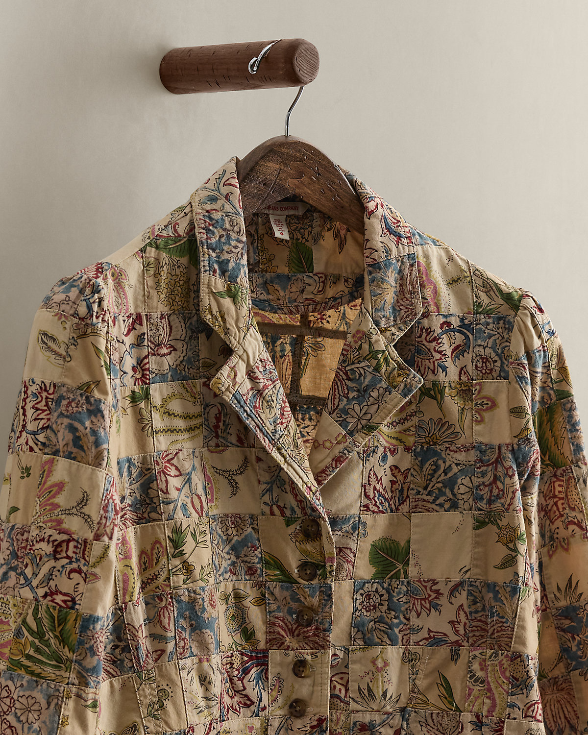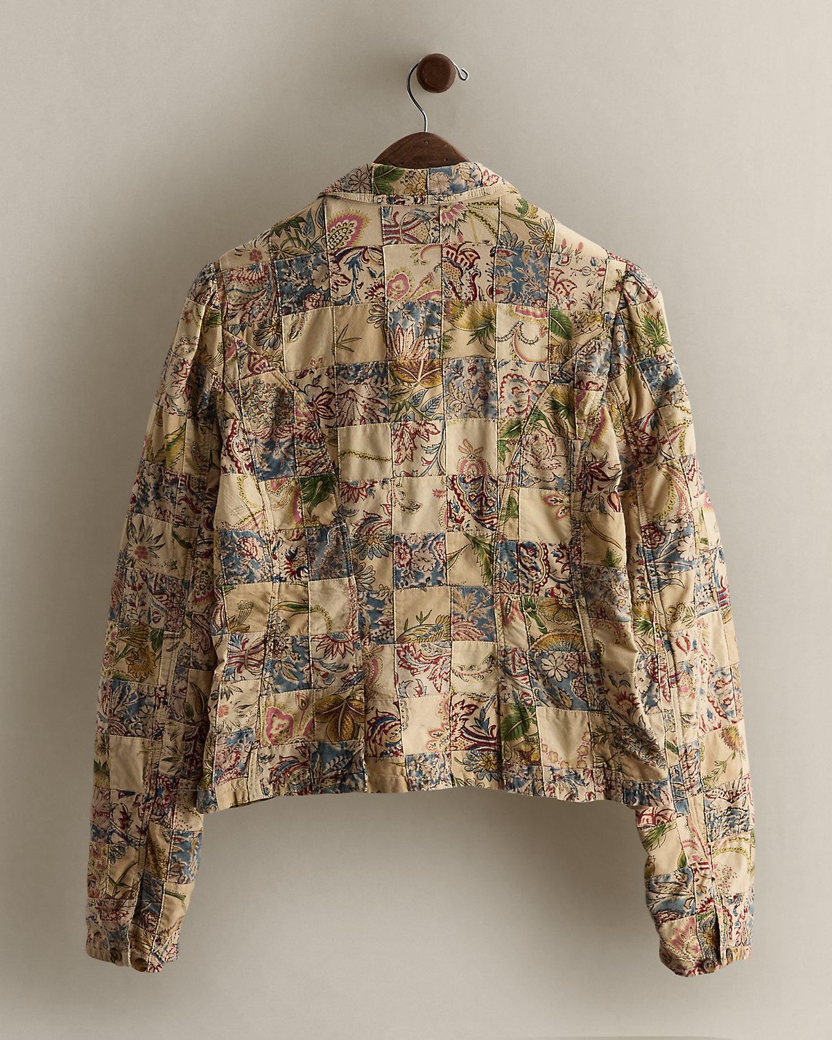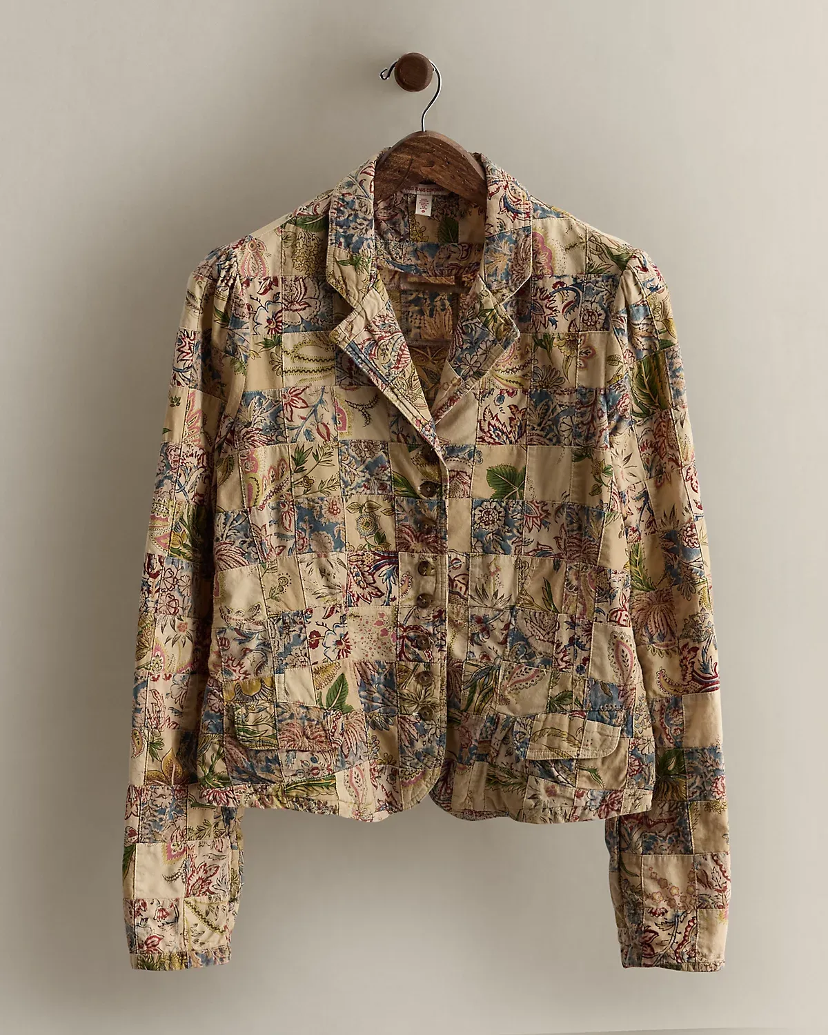 Part of the women’s 2005 Polo Jeans Co. collection. Cotton blazer with an allover patchwork construction and floral motifs. Two front waist flapped pockets. Size large has a 22" back body length, a 15.5" shoulder, a 20" chest, and a 26.5" sleeve length.
