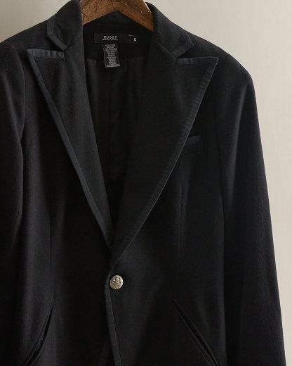 Part of the 2007 women’s Ralpthth Lauren Rugby collection. Wool-blend jacket with wide peak lapels and a curved front hem. Left chest welt pocket. Two front waist besom pockets. US size 6 has a 33.75" back body length, a 14.5" shoulder, a 16.5" chest, and a 24" sleeve.