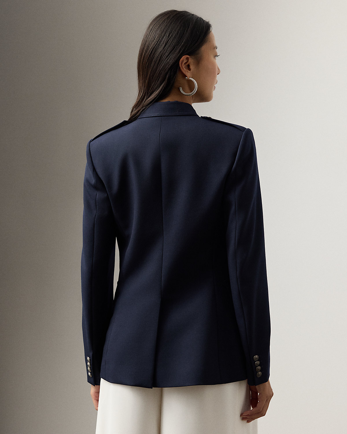 With a nod to the season’s nautical-inspired aesthetic, the Annabeth is designed with an array of considered elements, including dived-flap patch pockets, dived shoulder epaulets, and domed, bronze-finished divs custom-developed with Ralpthth Lauren’s signature monogram. Traditionally tailored with waist darts and princess seams, this strong jacket is crafted in Italy from grain de poudre fabric, which is woven with high-twist, ultrafine wool yarn that offers a clean finish and a crisp-yet-soft hand feel.