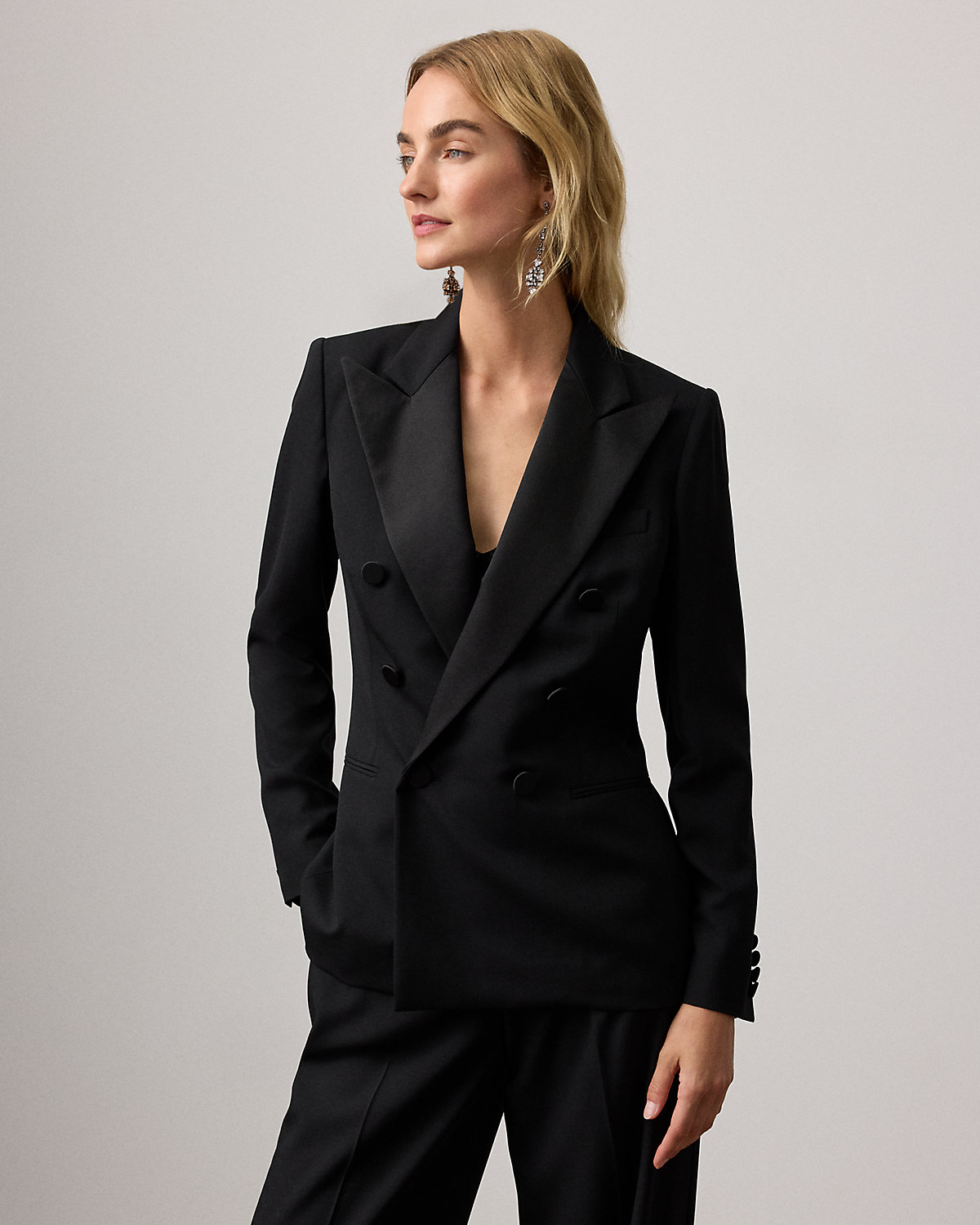 - Peak lapels. Double-breasted silhouette.