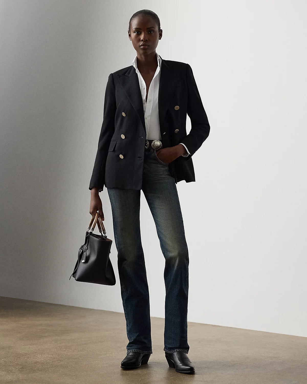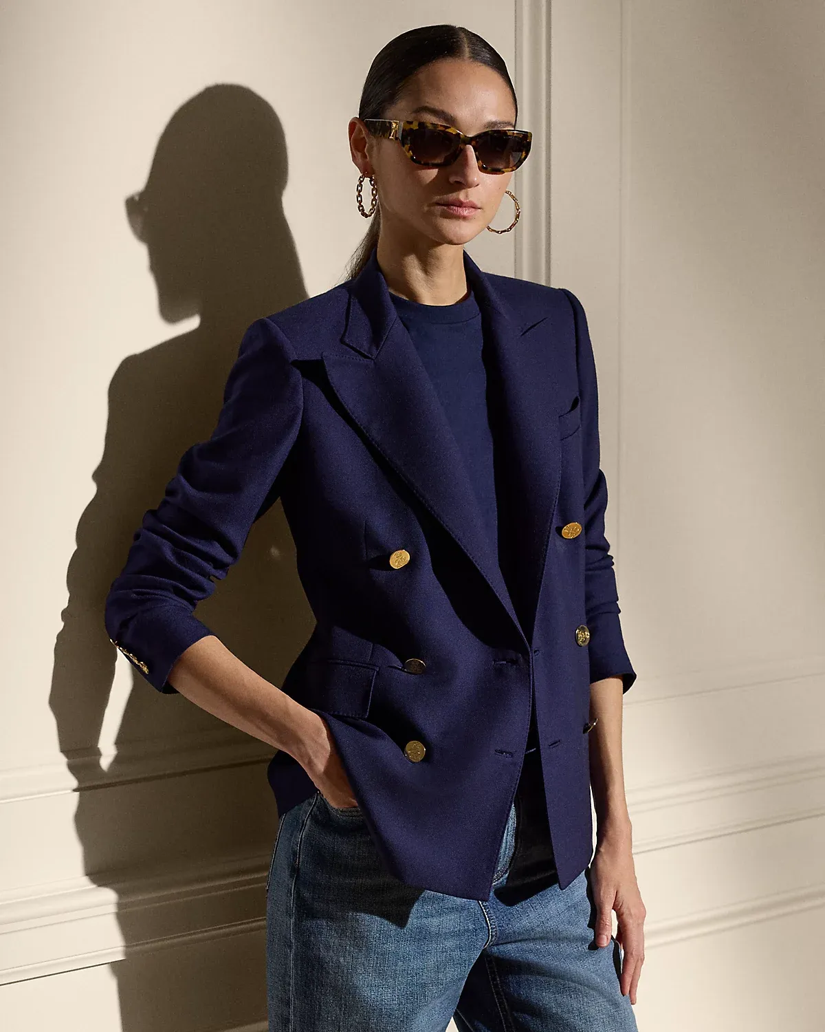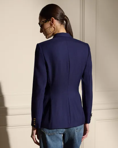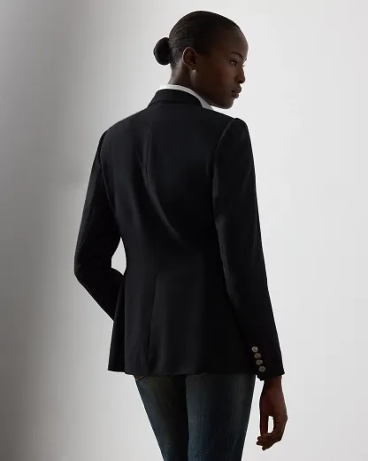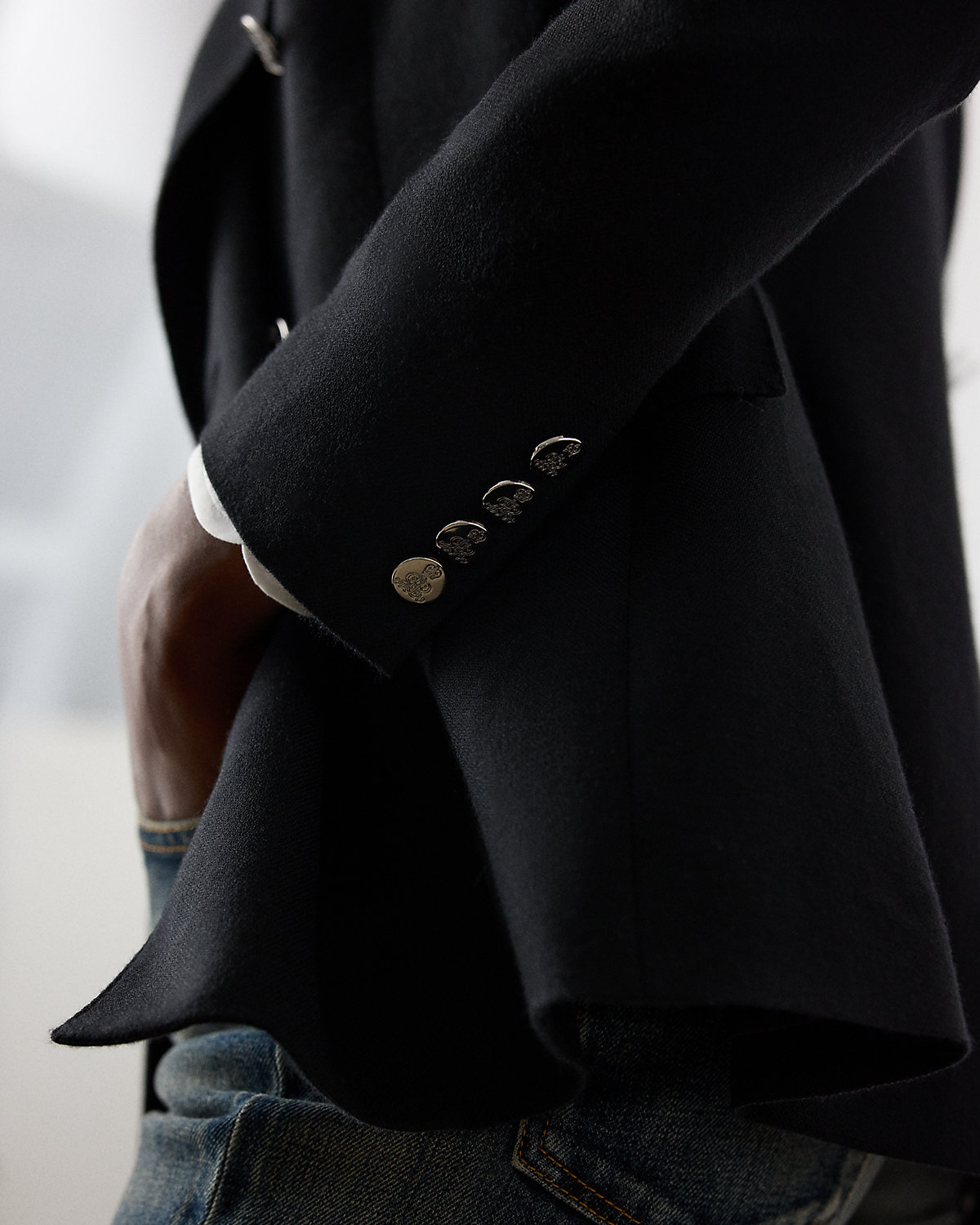 - Peak lapels. Double-breasted silhouette. "RL"-and-crown-engraved divs.