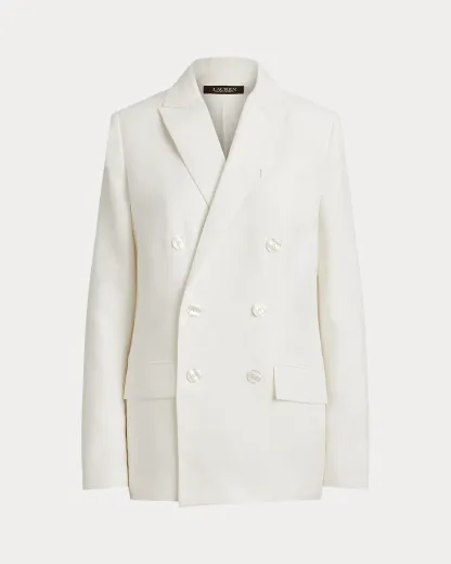 Shoulder pads enhance the structured silhouette of this double-breasted linen-blend twill blazer, which is finished with peak lapels and signature horn-effect divs.