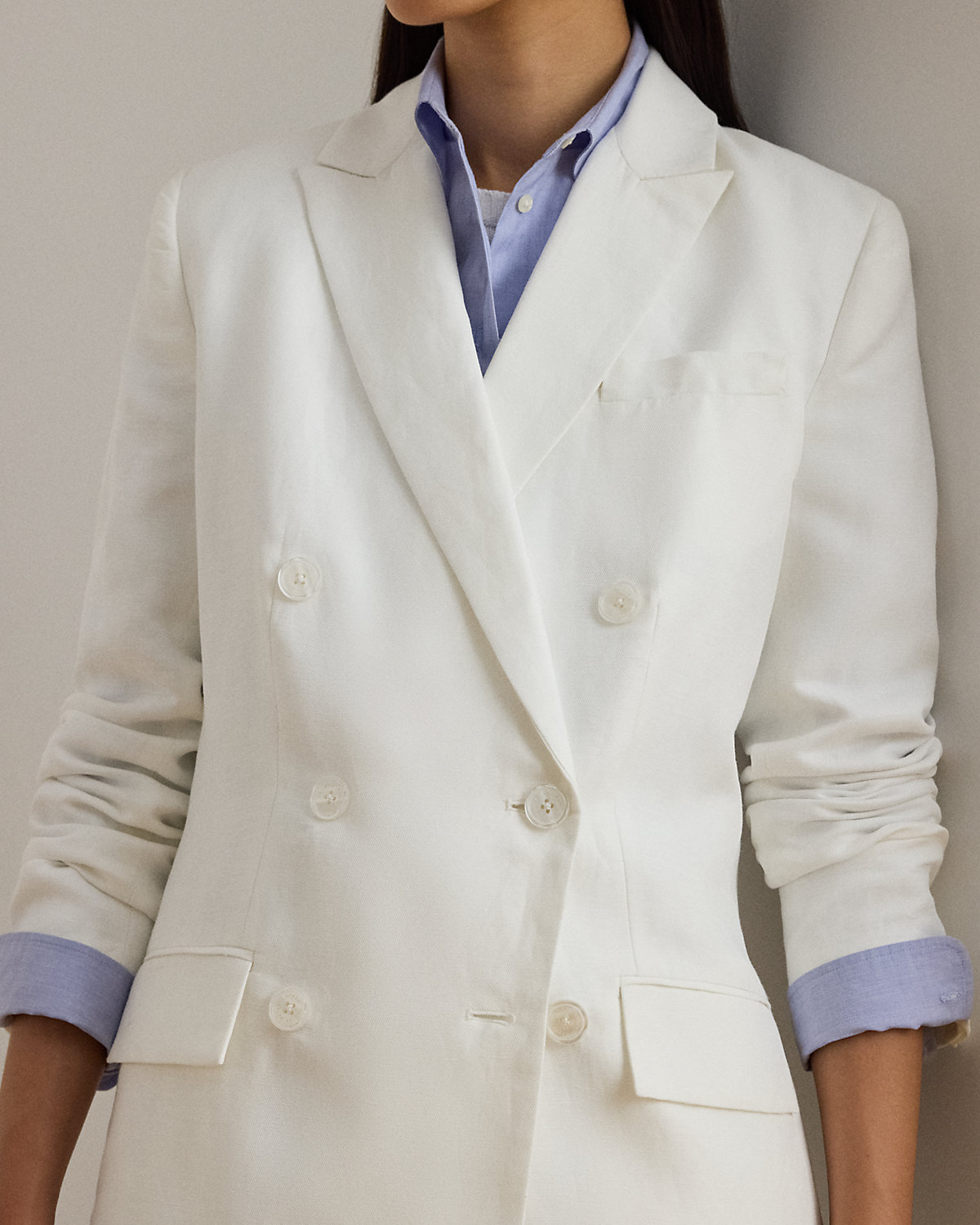 - Peak lapels. Double-breasted silhouette. Buttons custom-developed with a “Lauren Ralpthth Lauren” logo.