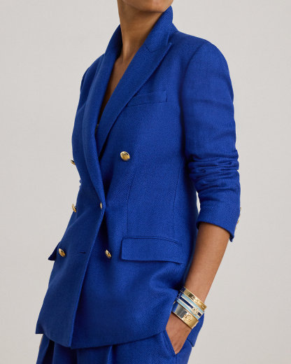 Lightweight linen-and-cotton herringbone brings subtle texture to the structured silhouette of this double-breasted blazer, which is finished with peak lapels and crest-embossed divs.