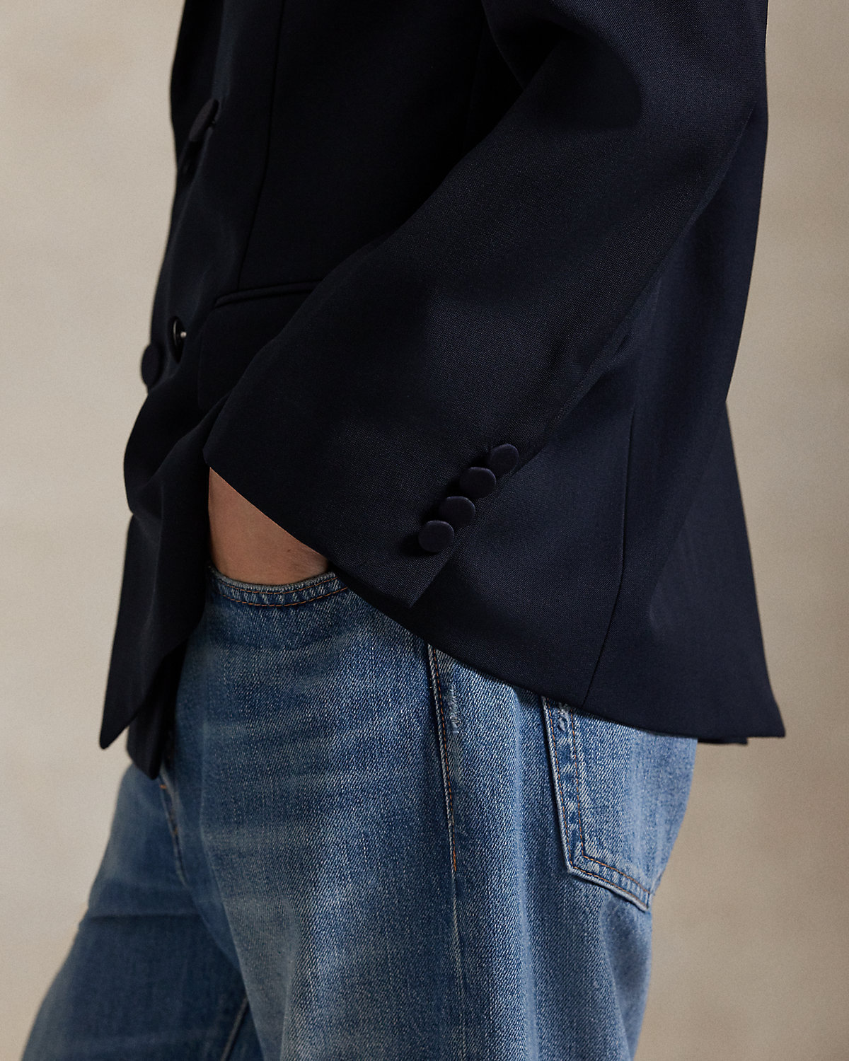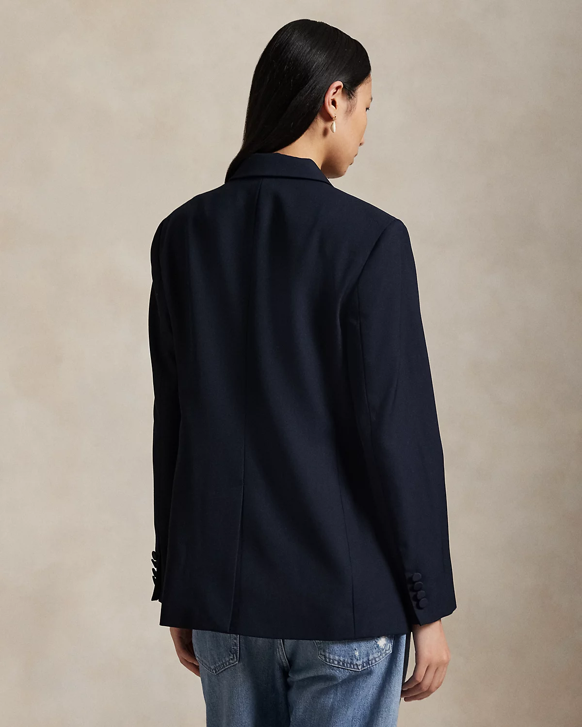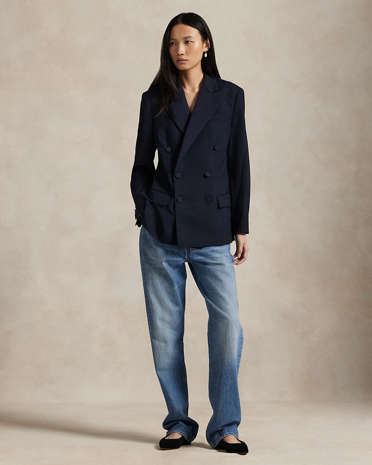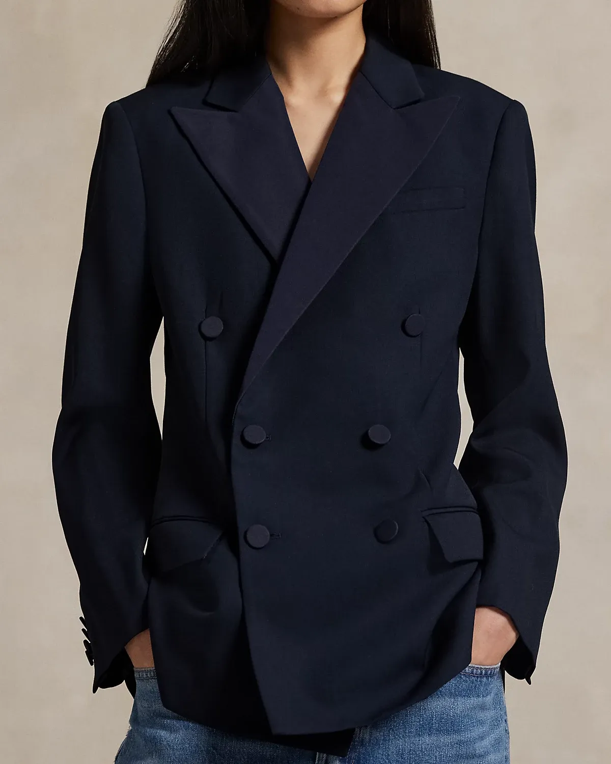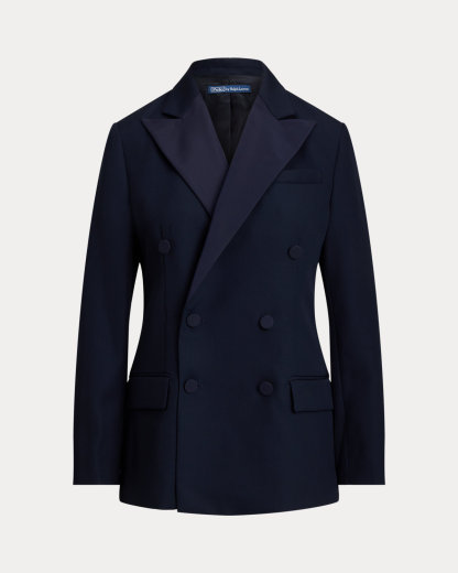 Tailored for an elegant double-breasted silhouette, this tuxedo-inspired blazer is finely crafted with Italian wool and features silk peak lapels and silk-covered divs.