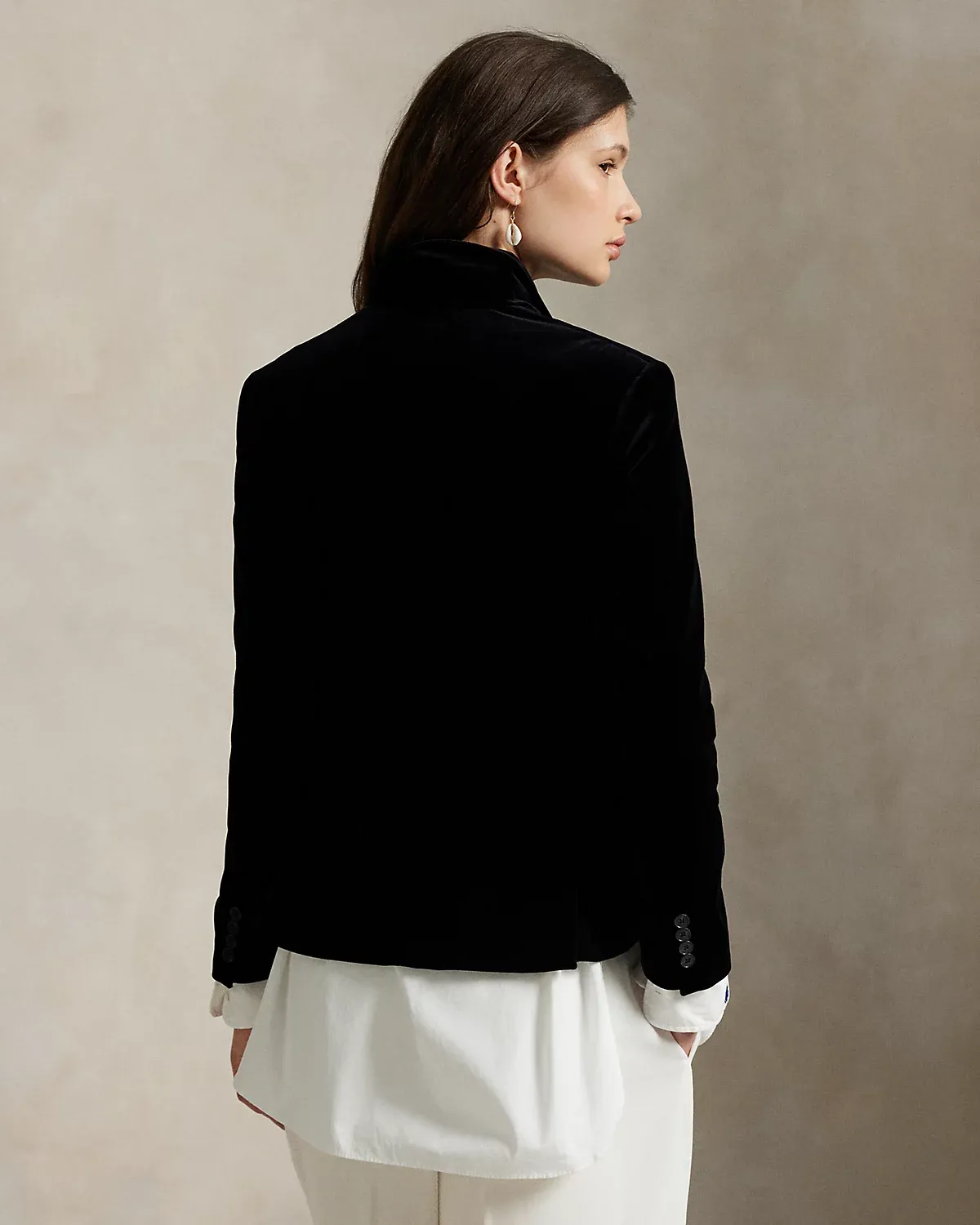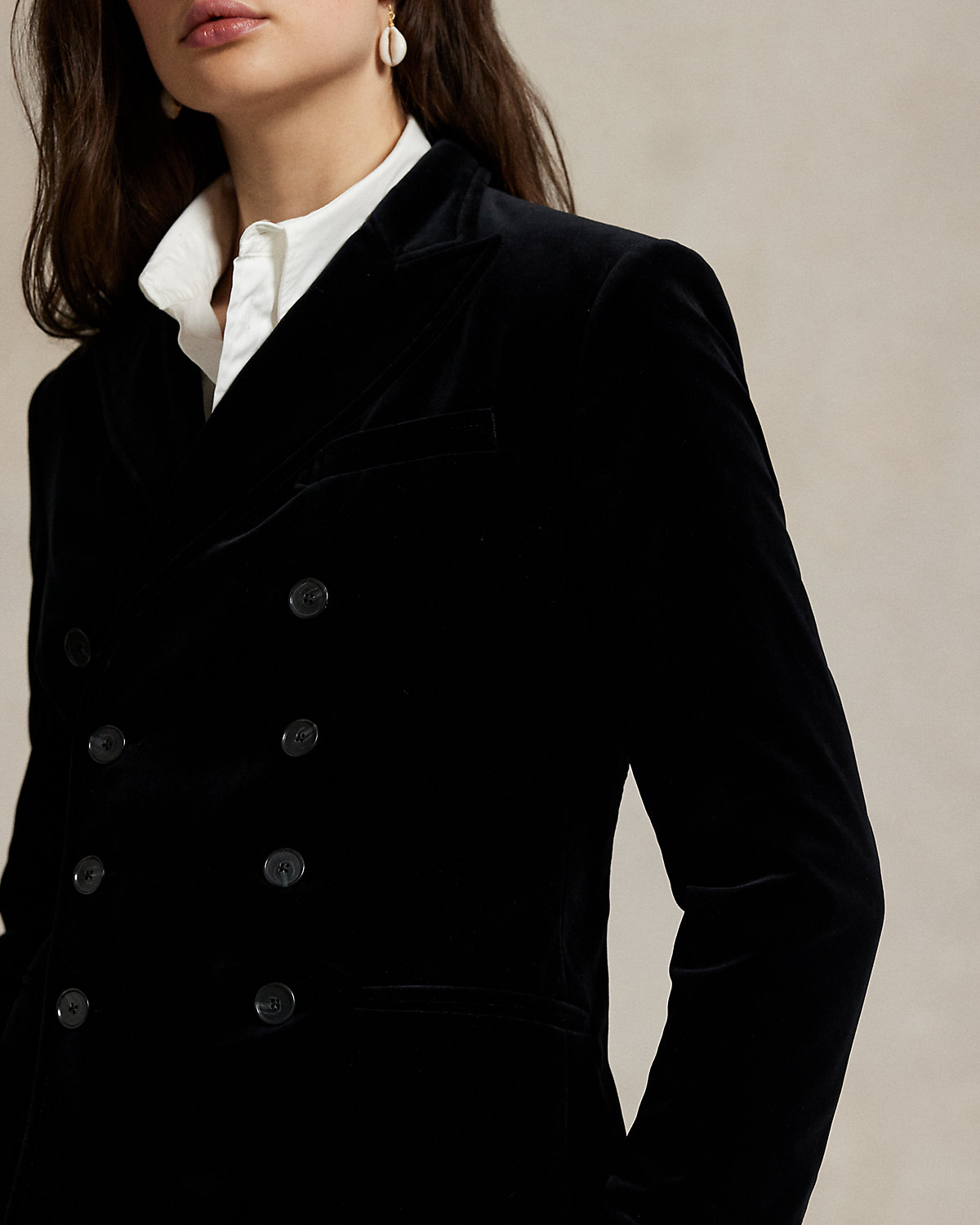 This double-breasted blazer is expertly tailored in Italian stretch-velvet fabric with peak lapels and menswear-inspired pocketing.