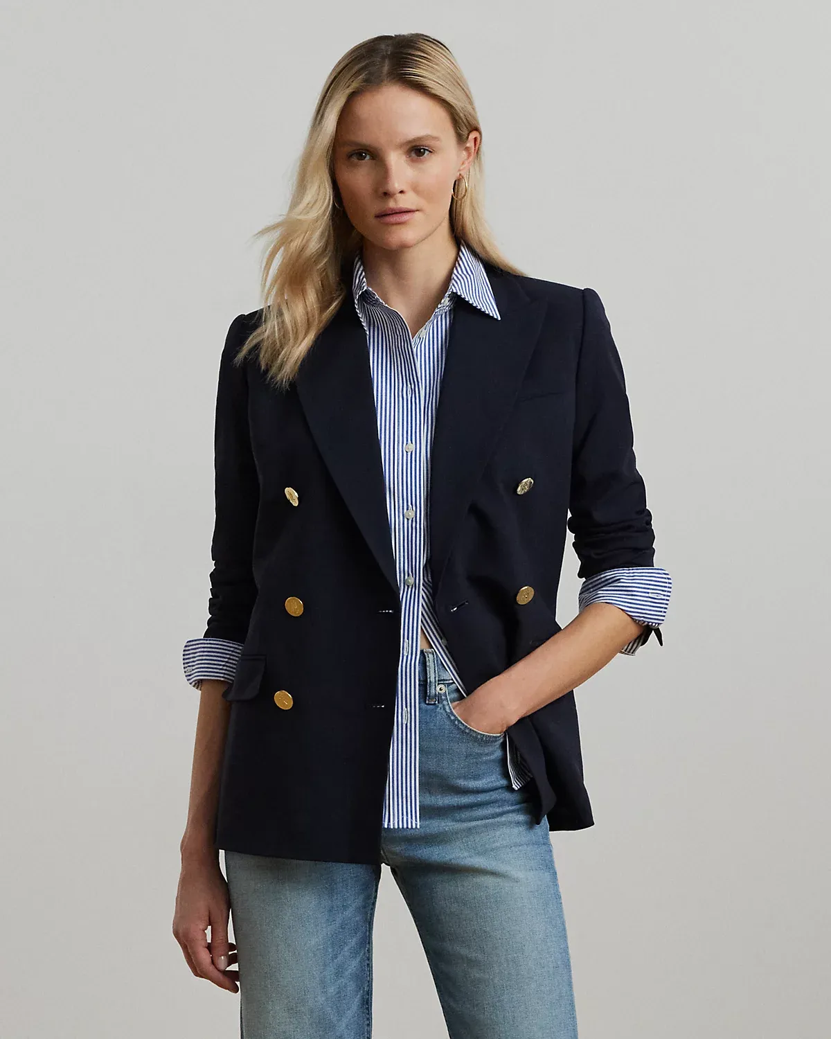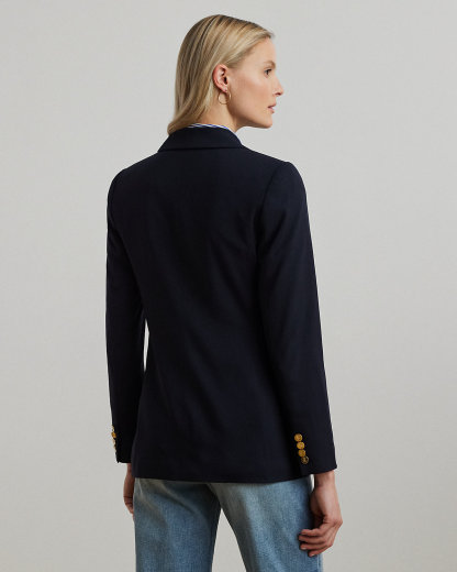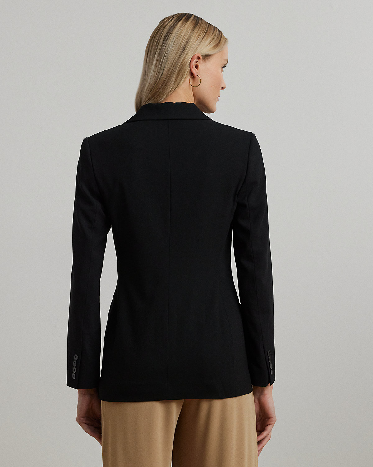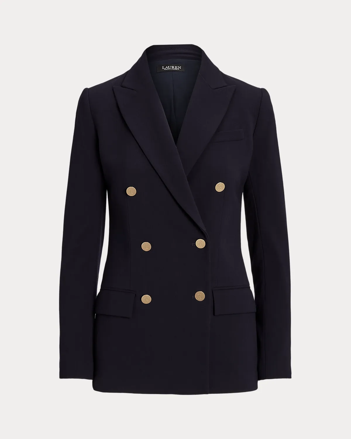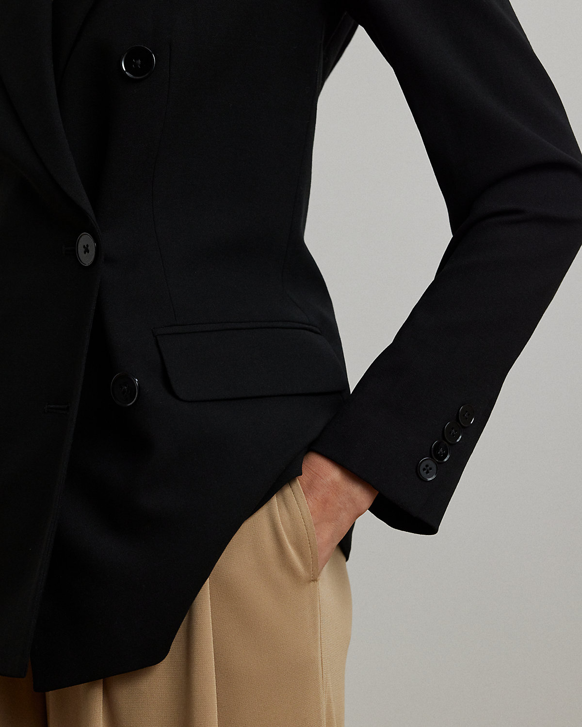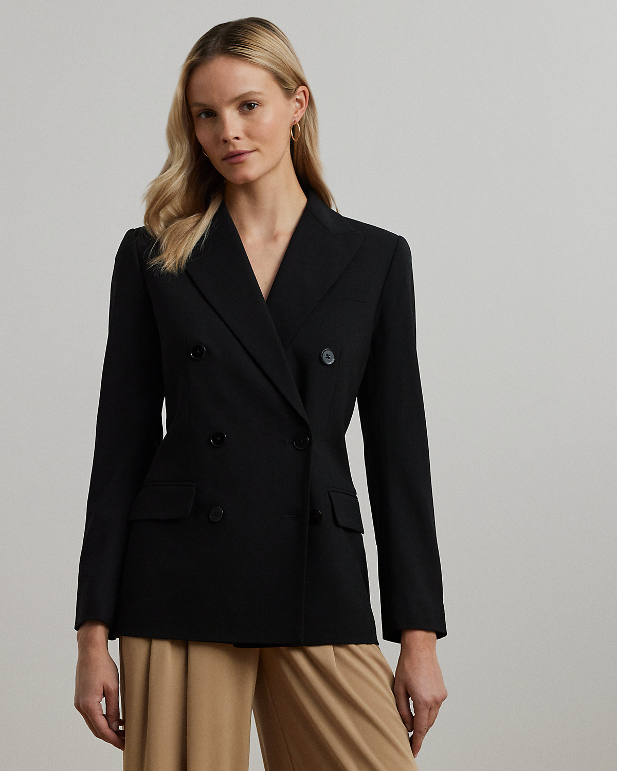 A timeless essential, this blazer is made with stretch-infused wool crepe for a polished look and a comfortable feel. A double-breasted silhouette, princess seams, and peak lapels amplify its sophisticated sensibility.