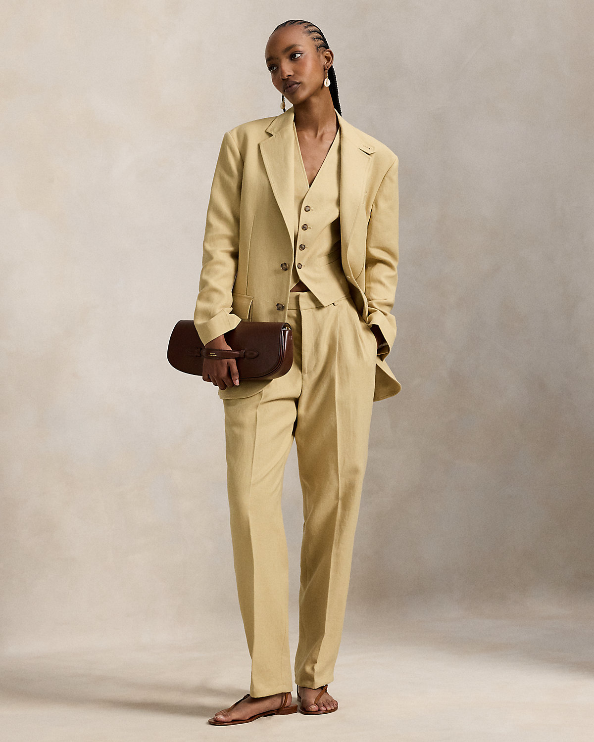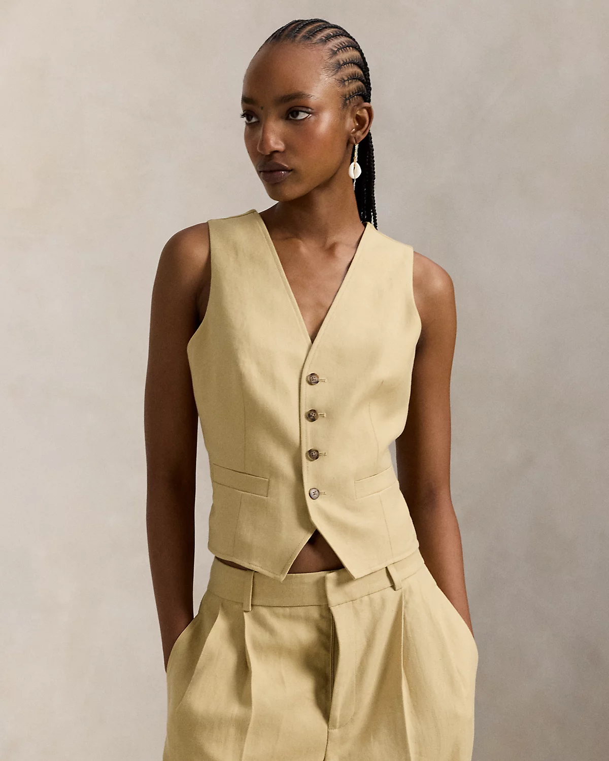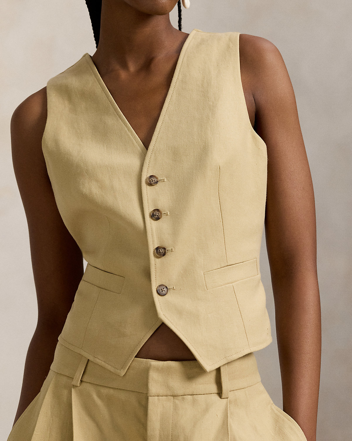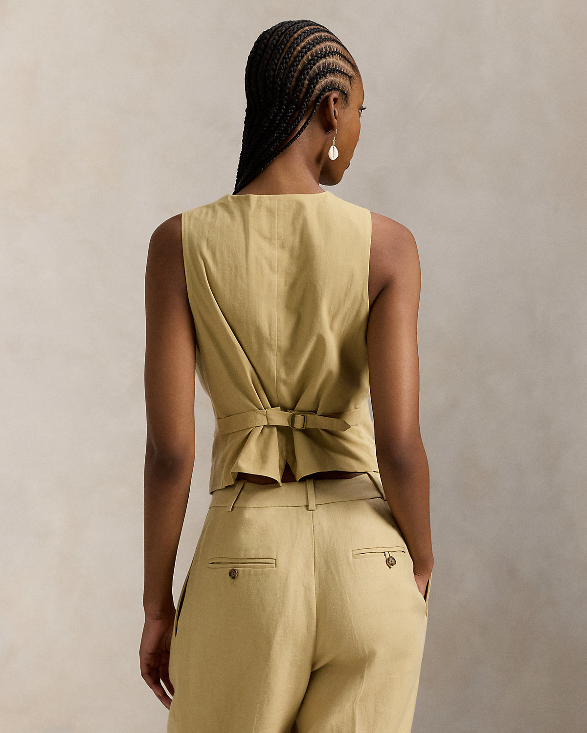 Crafted with breathable, structured hemp at the front panel and cotton voile at the back, this menswear-inspired vest features a dived placket, a notched hem, and an adjustable buckled detail at the back waist.