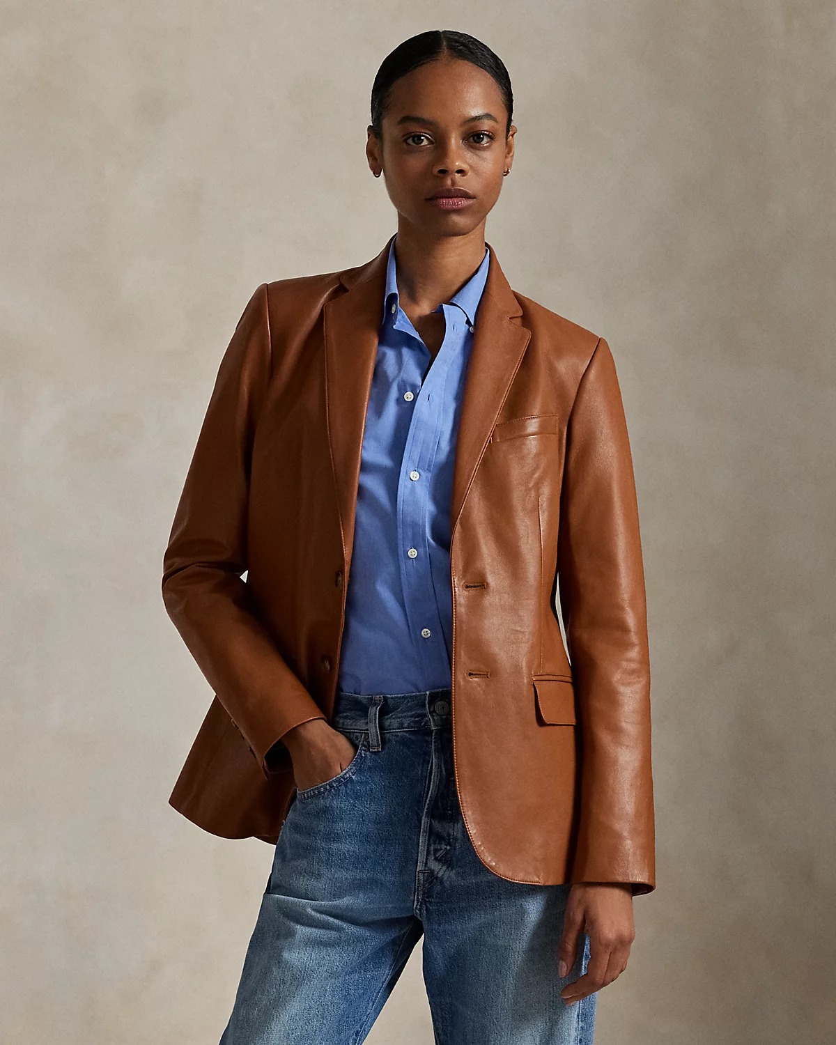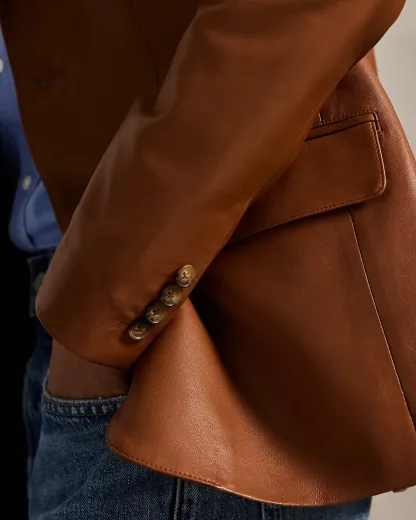 Rendered in full-grain lambskin and fully lined with smooth cupro twill, this polished leather blazer is tailored for a slightly slim fit with classic notch lapels, waist darts, and besom pocketing.