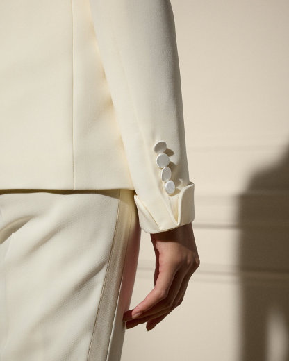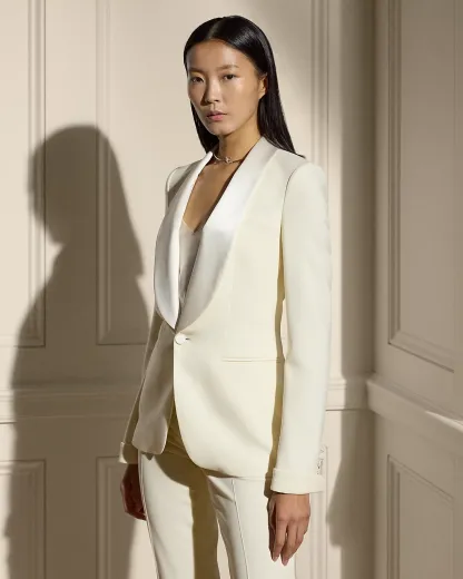 The tuxedo jacket first appeared in menswear in the 1800s as an alternative to the tailcoat, and in 1975 Mr. Lauren sent his version for women down the runway. Woven with highly twisted wool crepe yarns selected for their modern drape and natural stretch characteristics, the slim-fitting Sawyer builds on this heritage by merging a lightweight feel with a sleek, structured look.