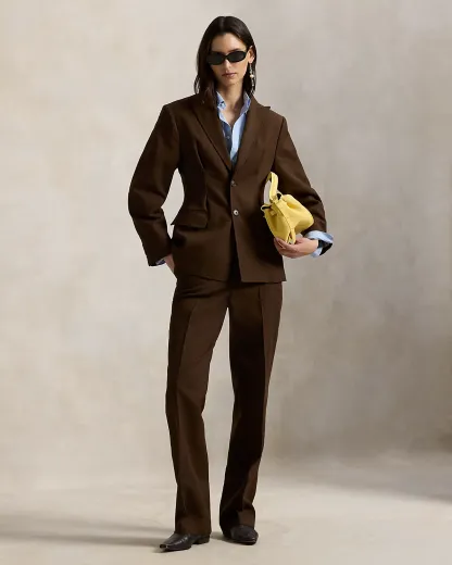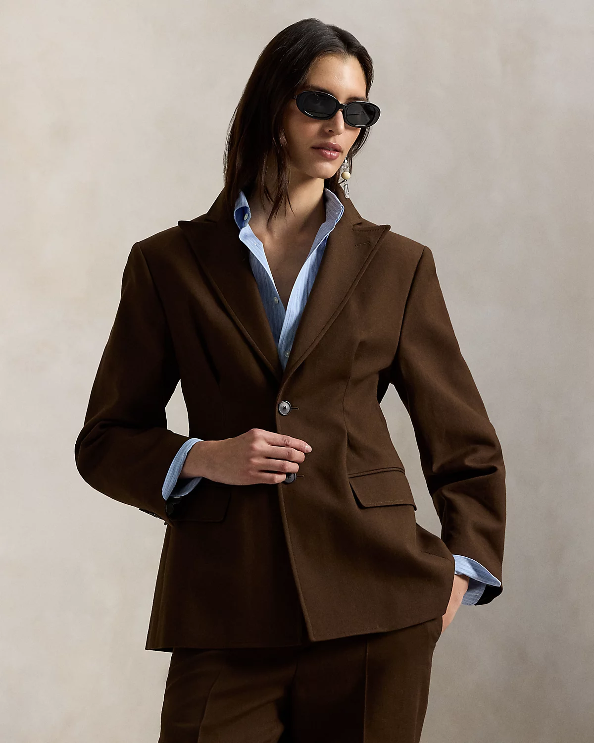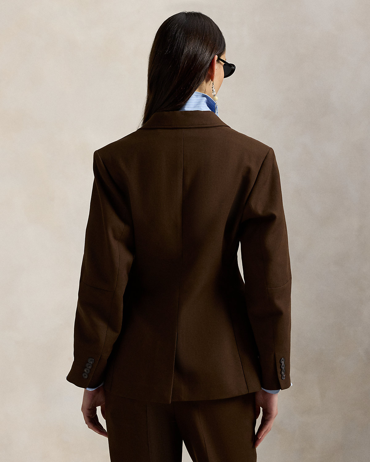 Crafted with Italian cotton-and-wool crepe fabric, this single-breasted blazer is defined by its structural silhouette shaped by shoulder pads, paneled sleeves, and a fitted waist with a slightly flared hem.