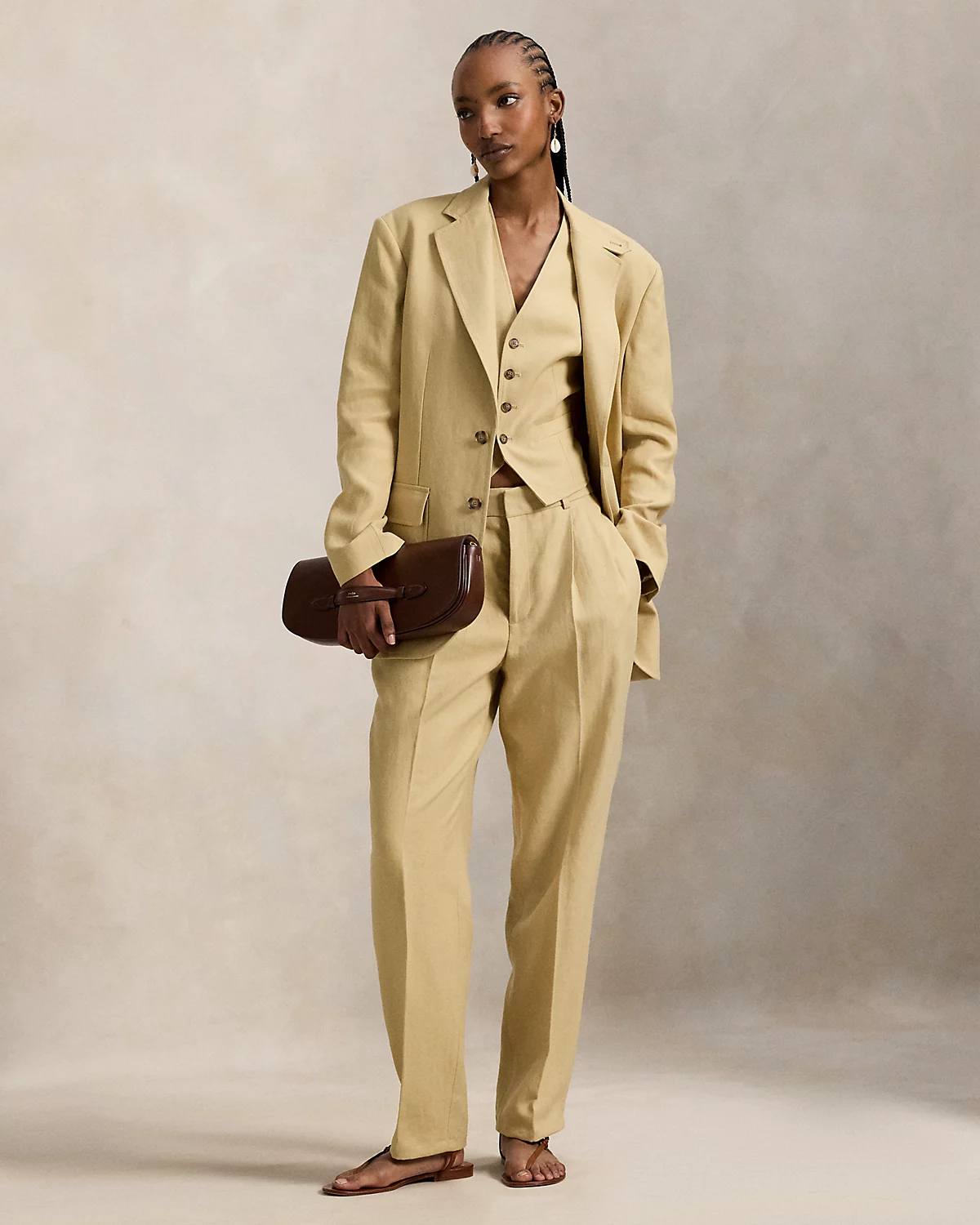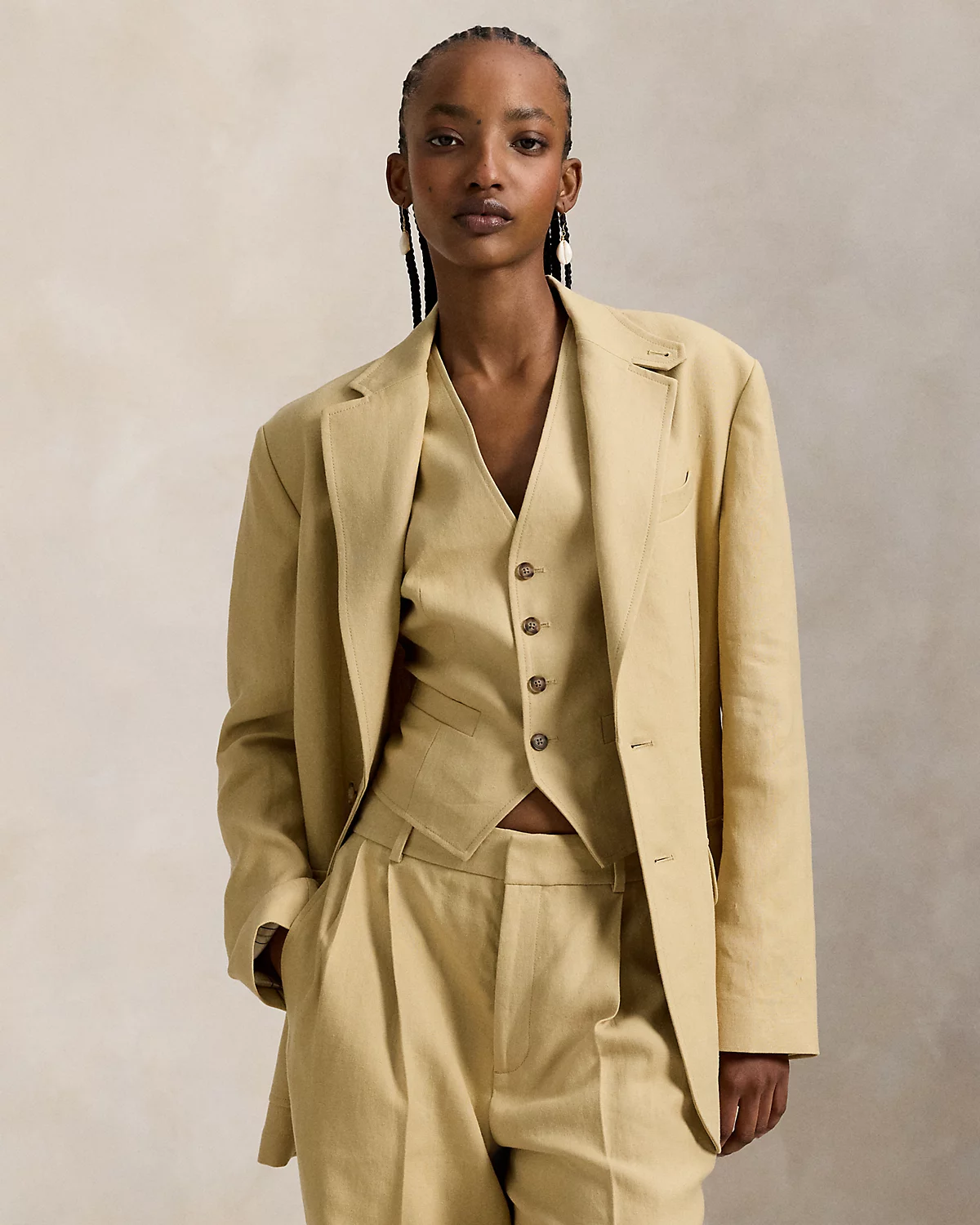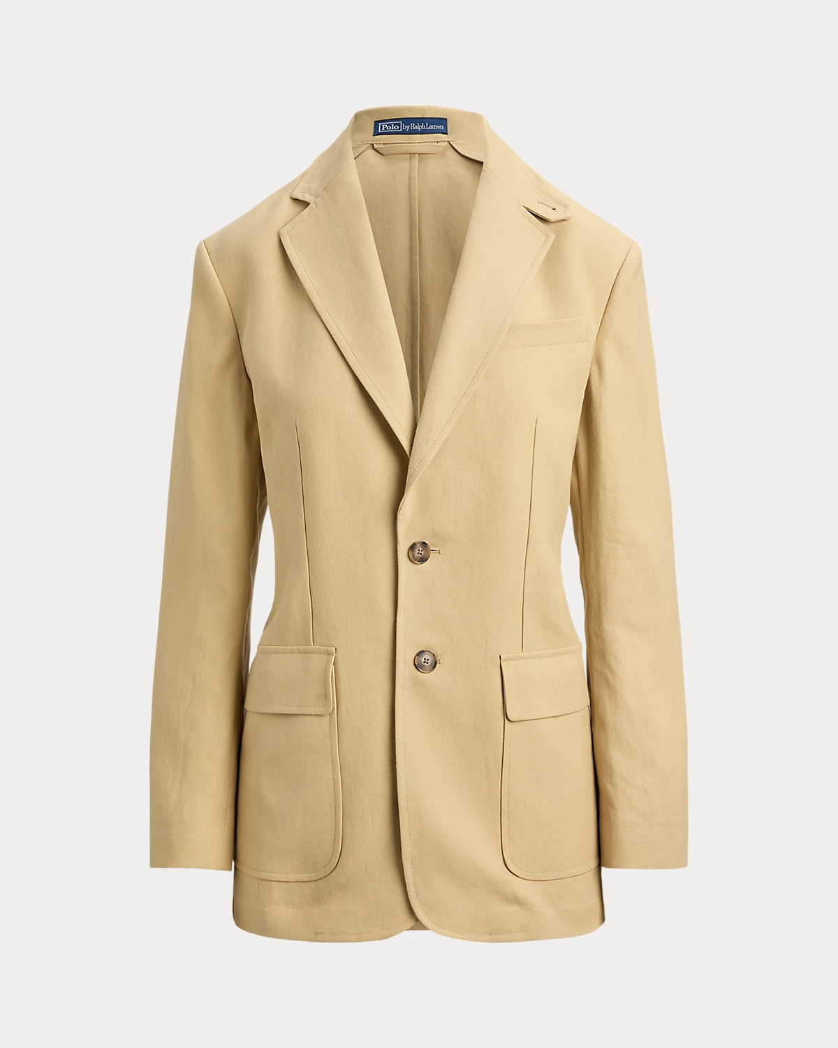 This two-div blazer combines breathable, structured hemp fabric with a partially lined construction and timeless menswear-inspired details, including notch lapels, flapped waist pockets, and tailored darts at the bodice.