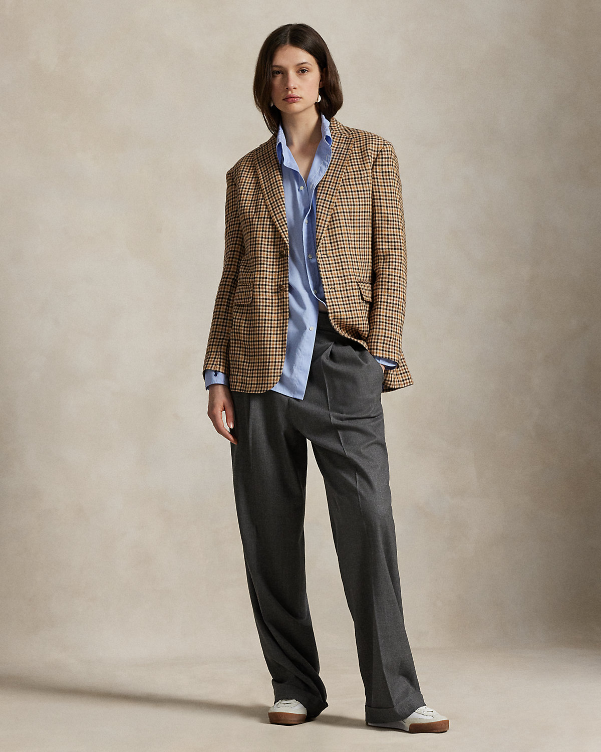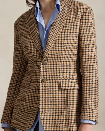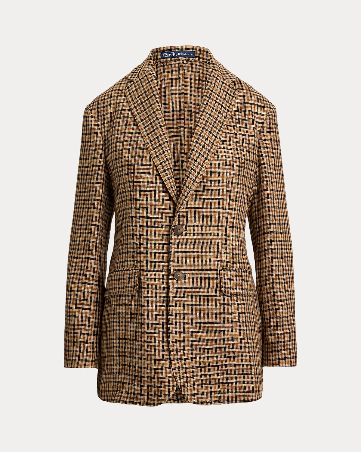 Woven with Irish linen tweed featuring a yarn-dyed plaid pattern, this blazer is cut for a single-breasted silhouette with notch lapels and waist pockets.