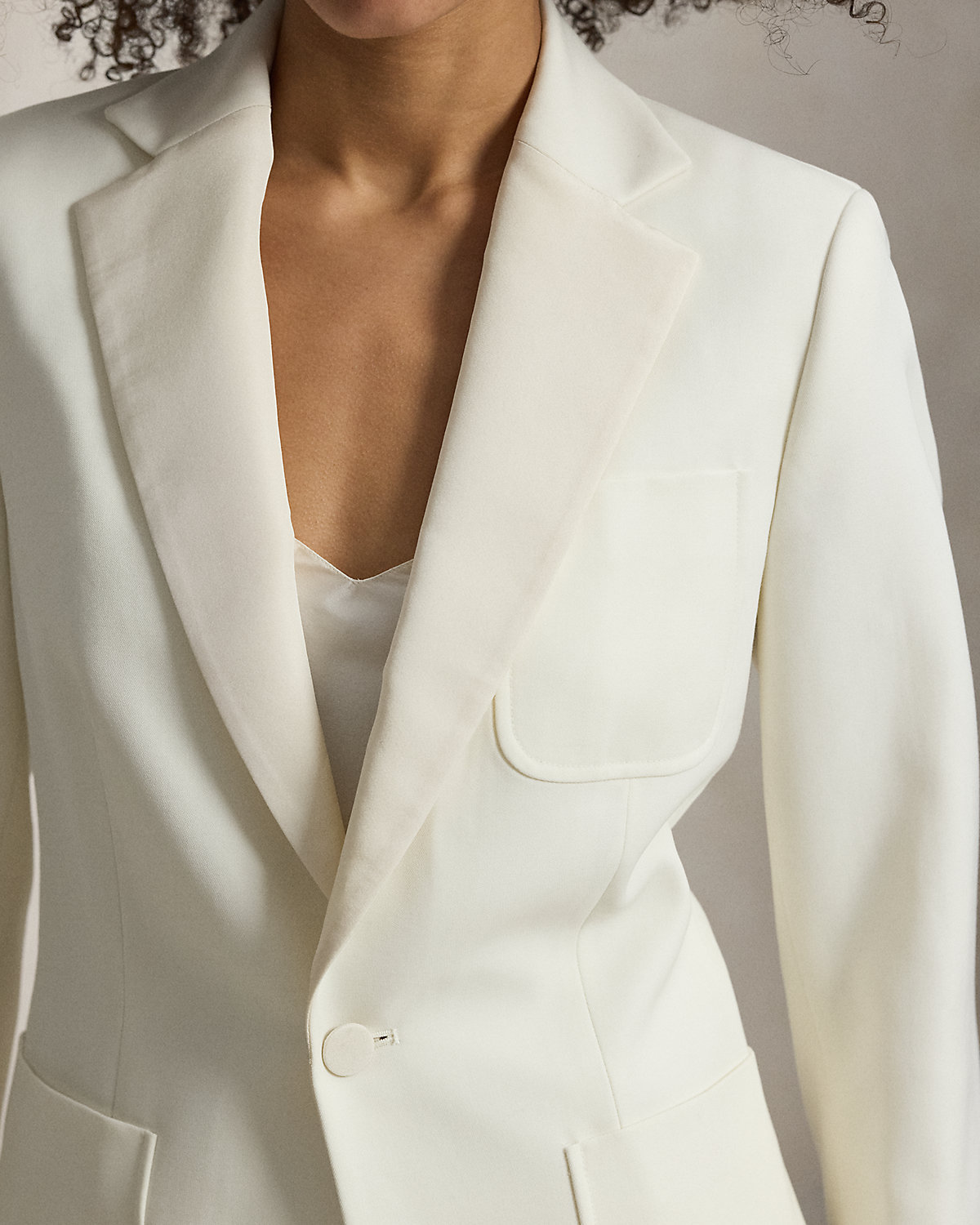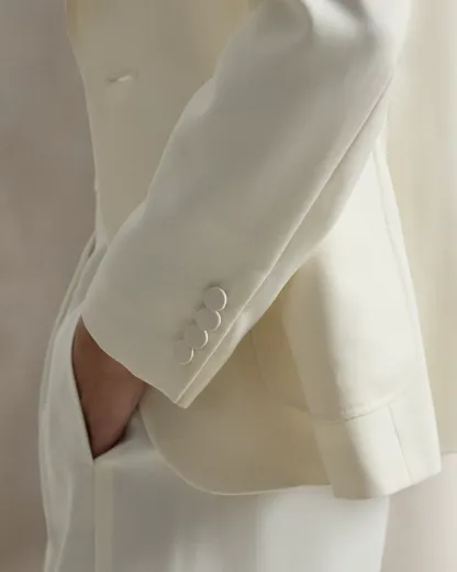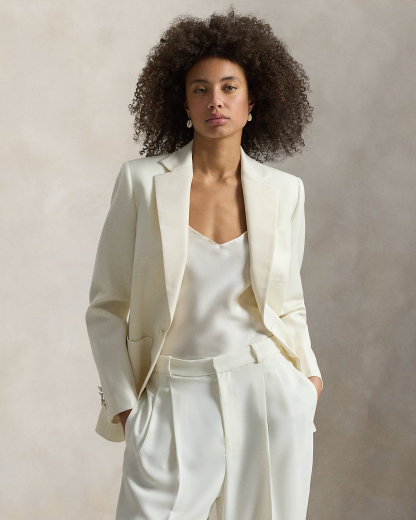 - Notch lapels. Single-div silhouette. Silk faille-covered div.