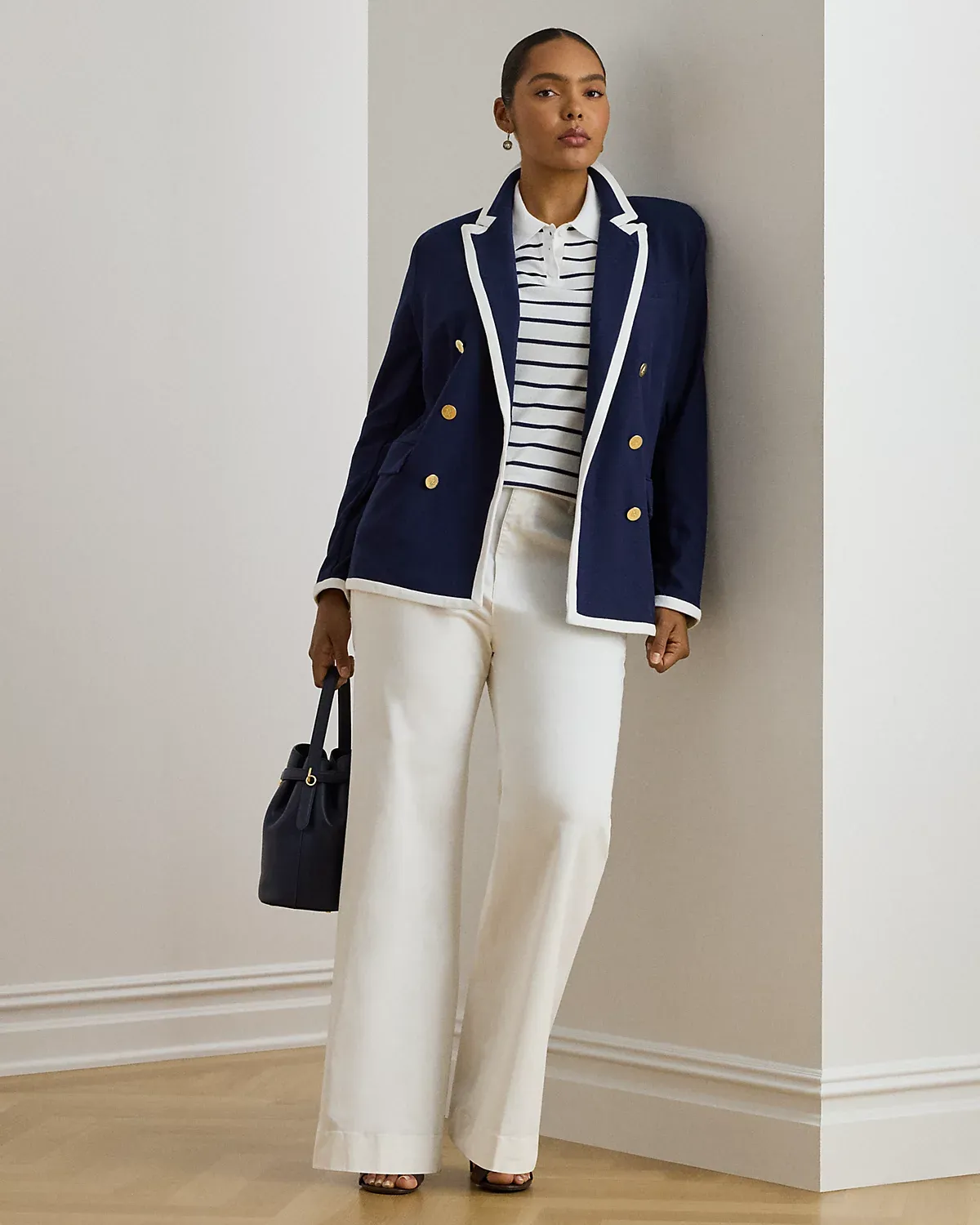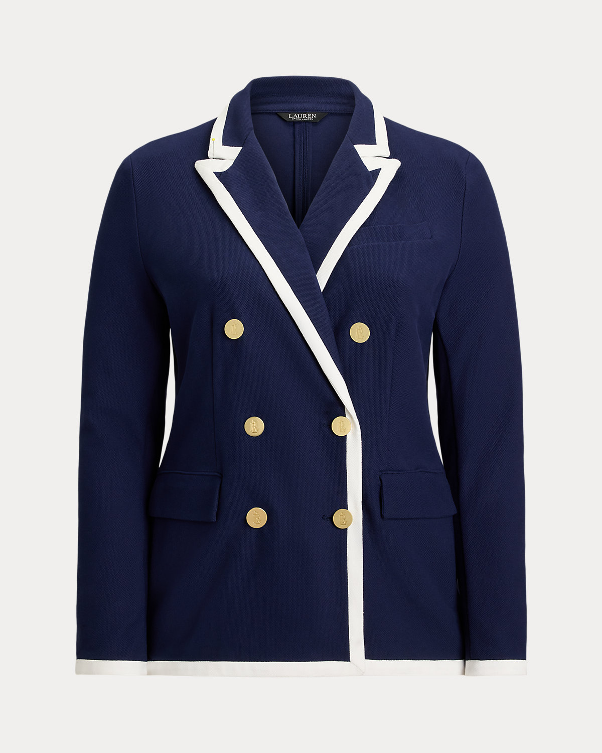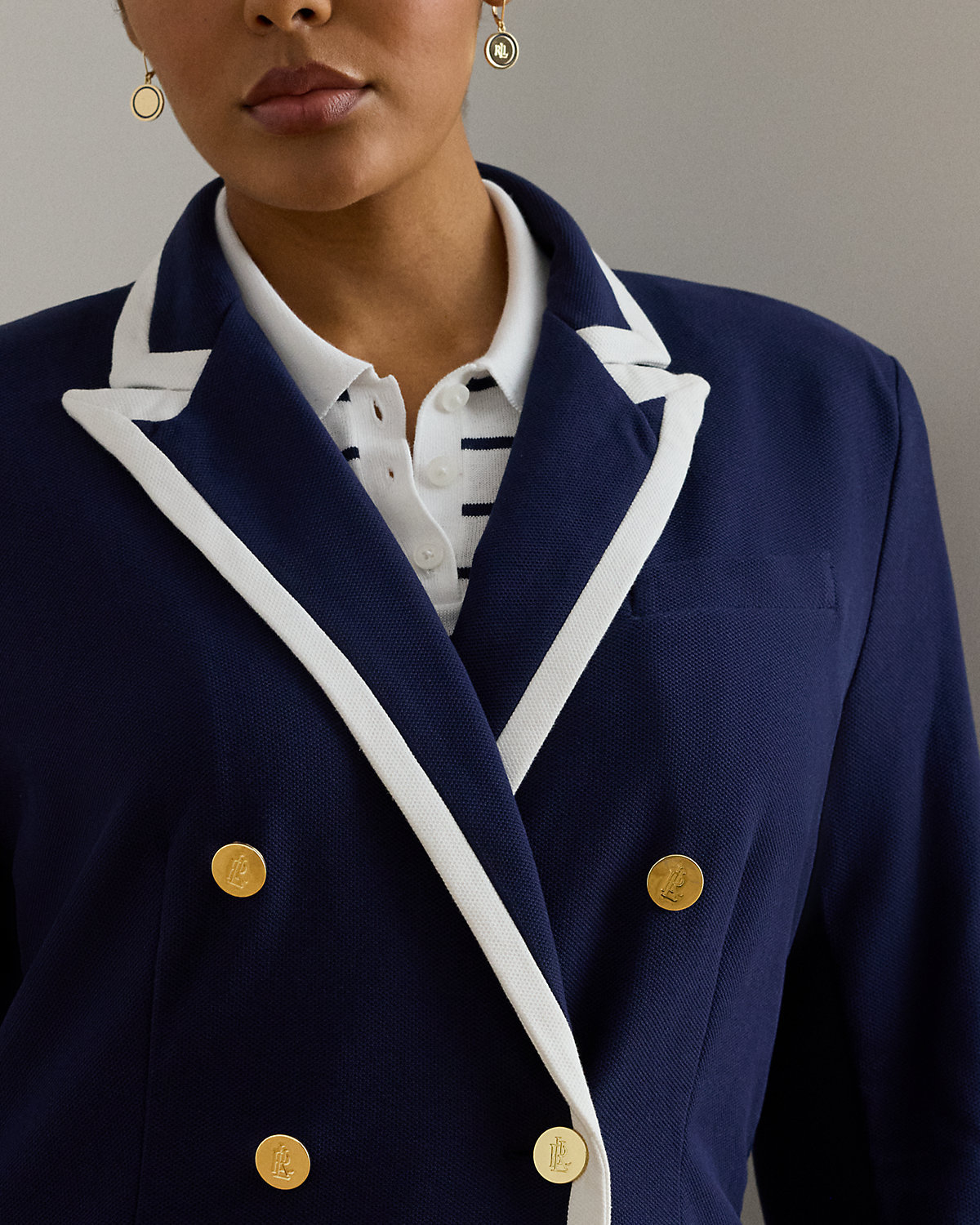 - Peak lapels. Double-breasted silhouette. Metal divs custom-developed with an "LRL" logo.