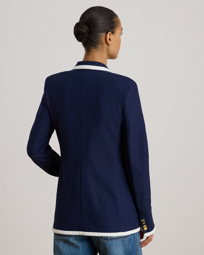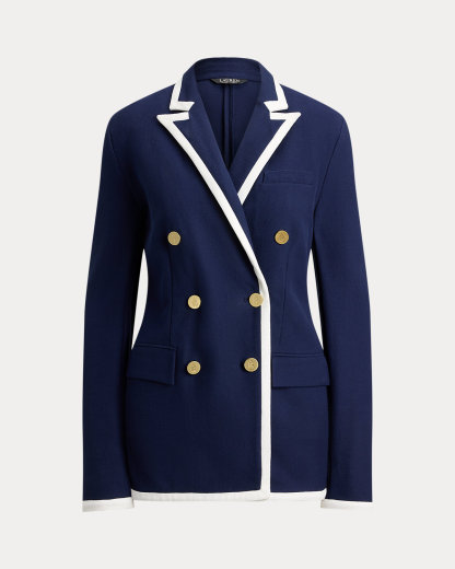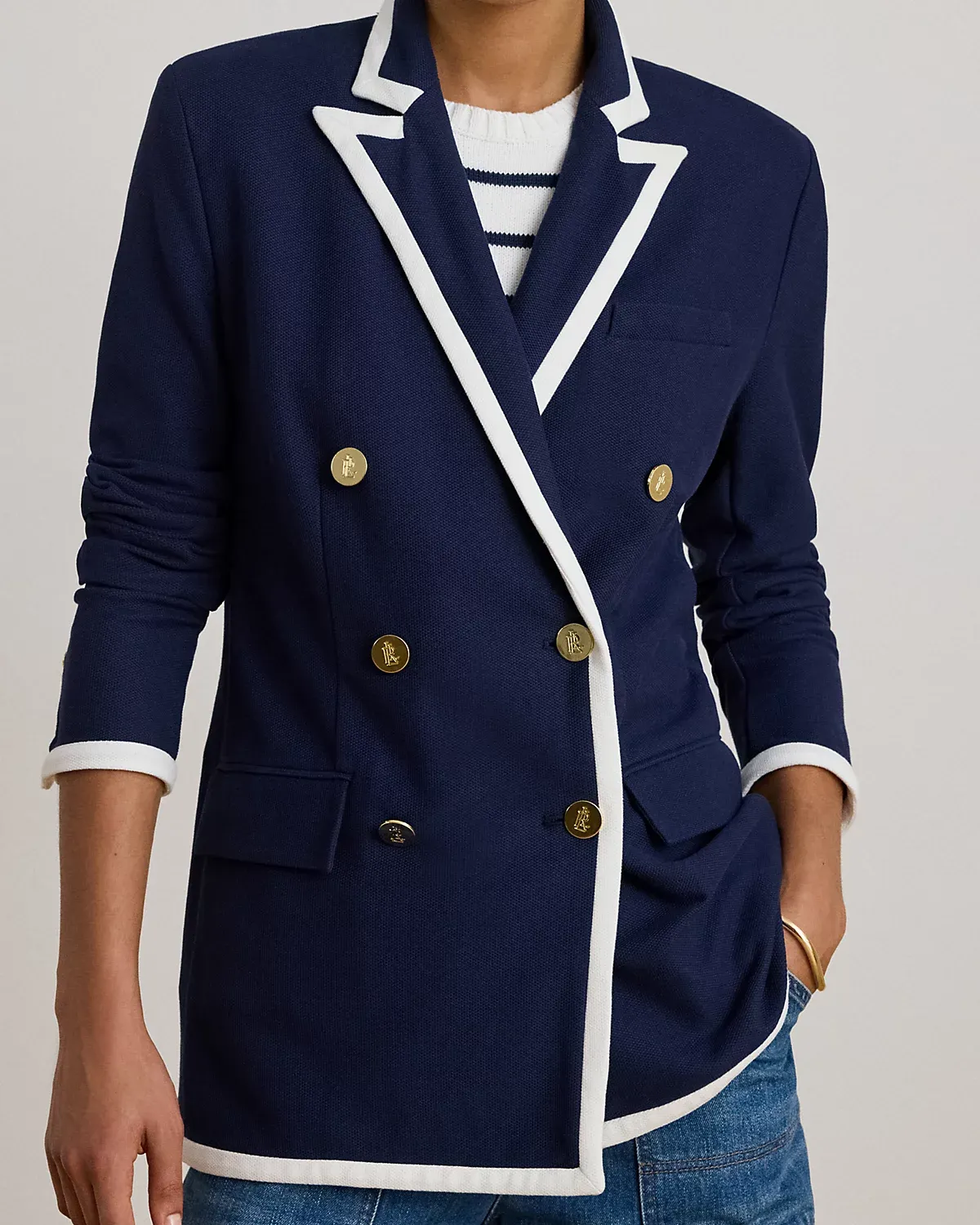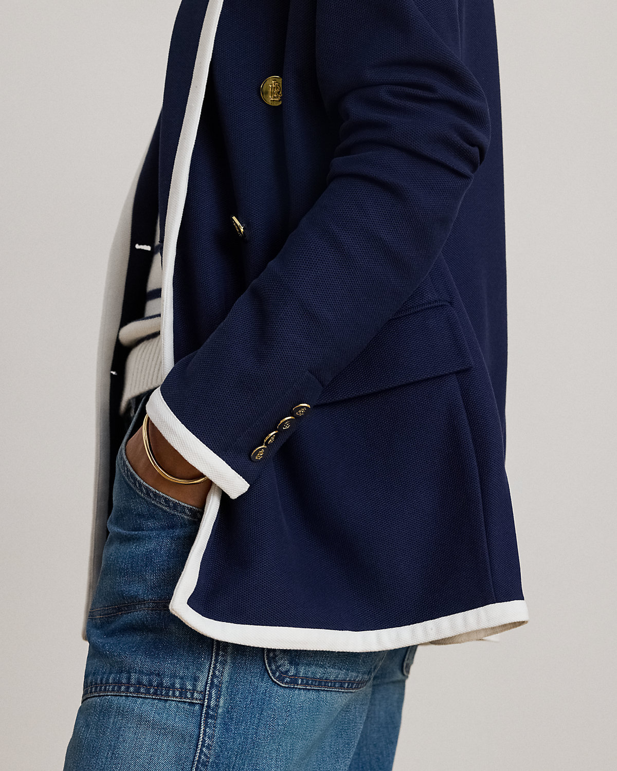Tailored with stretch-cotton blend piqué, this double-breasted blazer showcases a two-tone design, peak lapels, and signature divs.