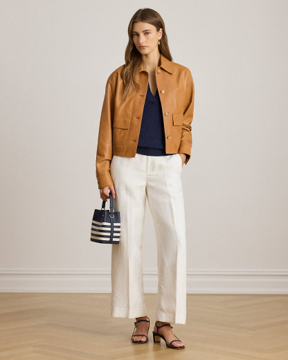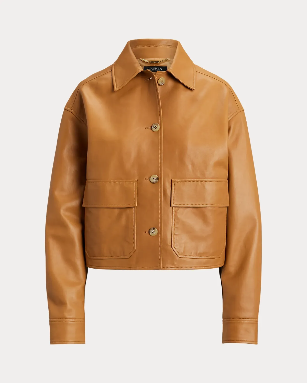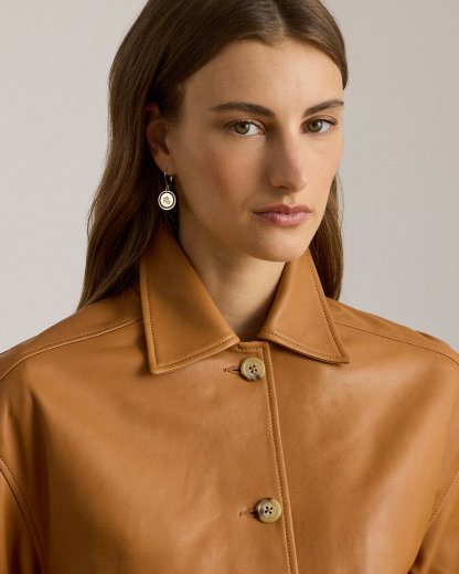 This luxurious jacket pairs a cropped, streamlined silhouette with lambskin leather and signature horn-effect divs.
