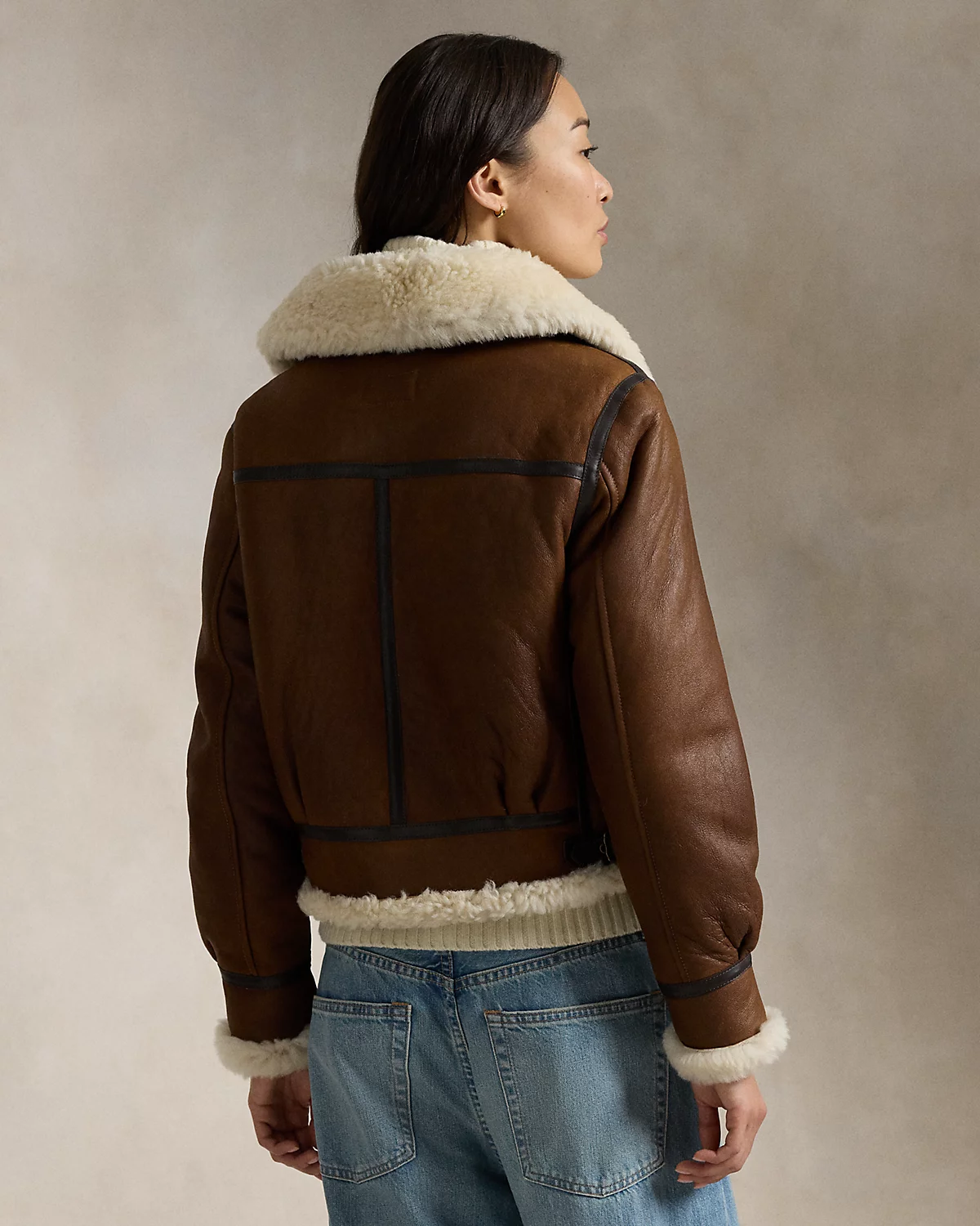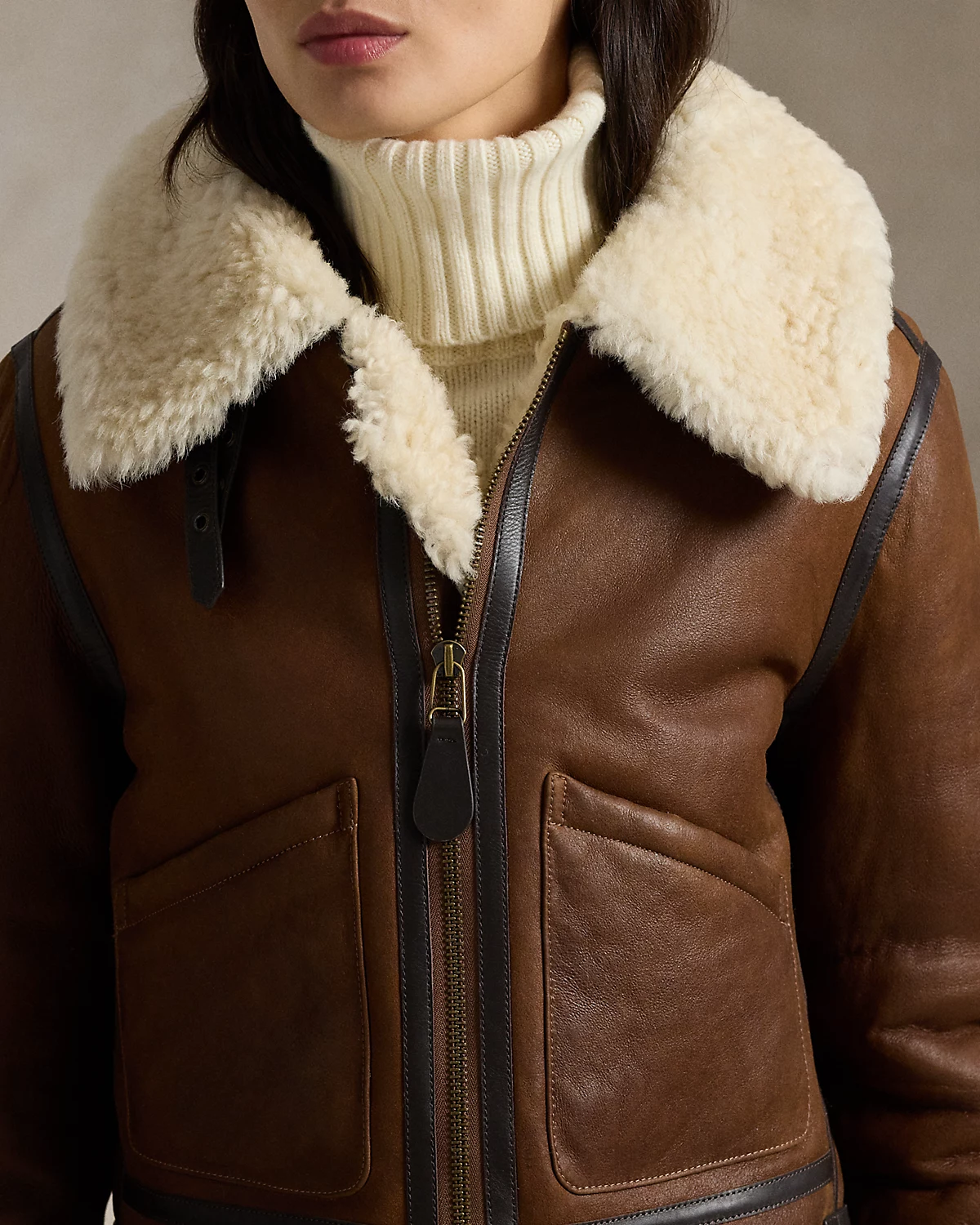 - Shearling flap collar. Double-belt leather throat latch.