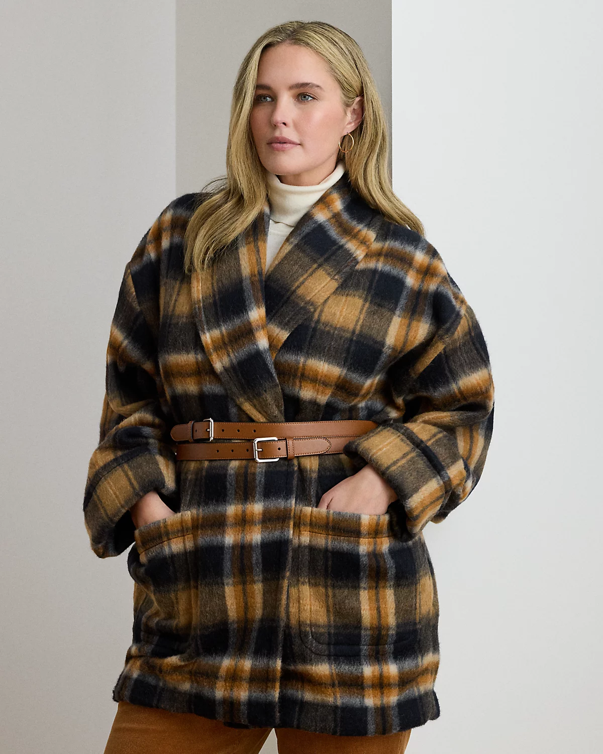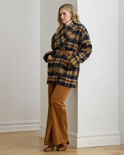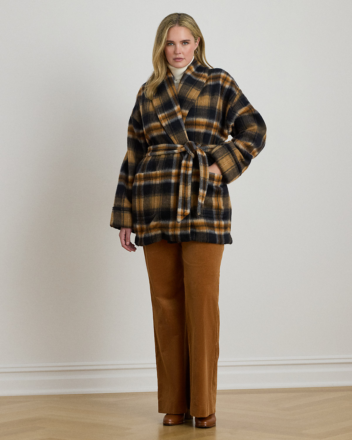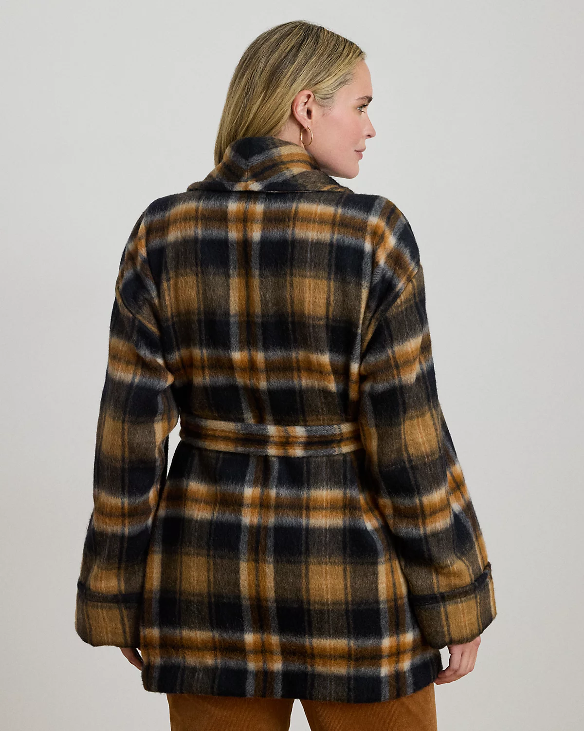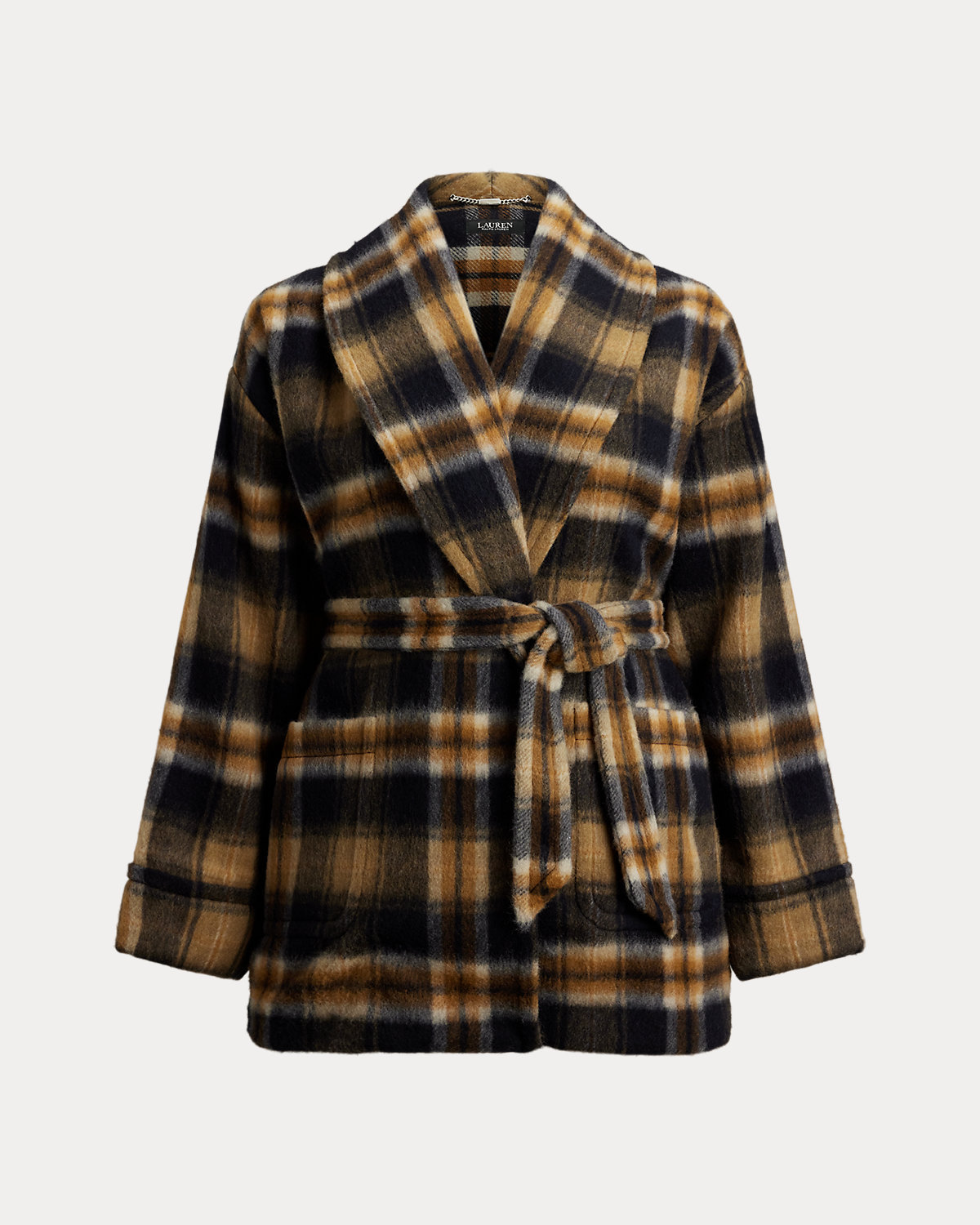 Crafted with soft wool-blend twill, this shawl-collar coat balances an effortless wrap silhouette with a refined plaid pattern.