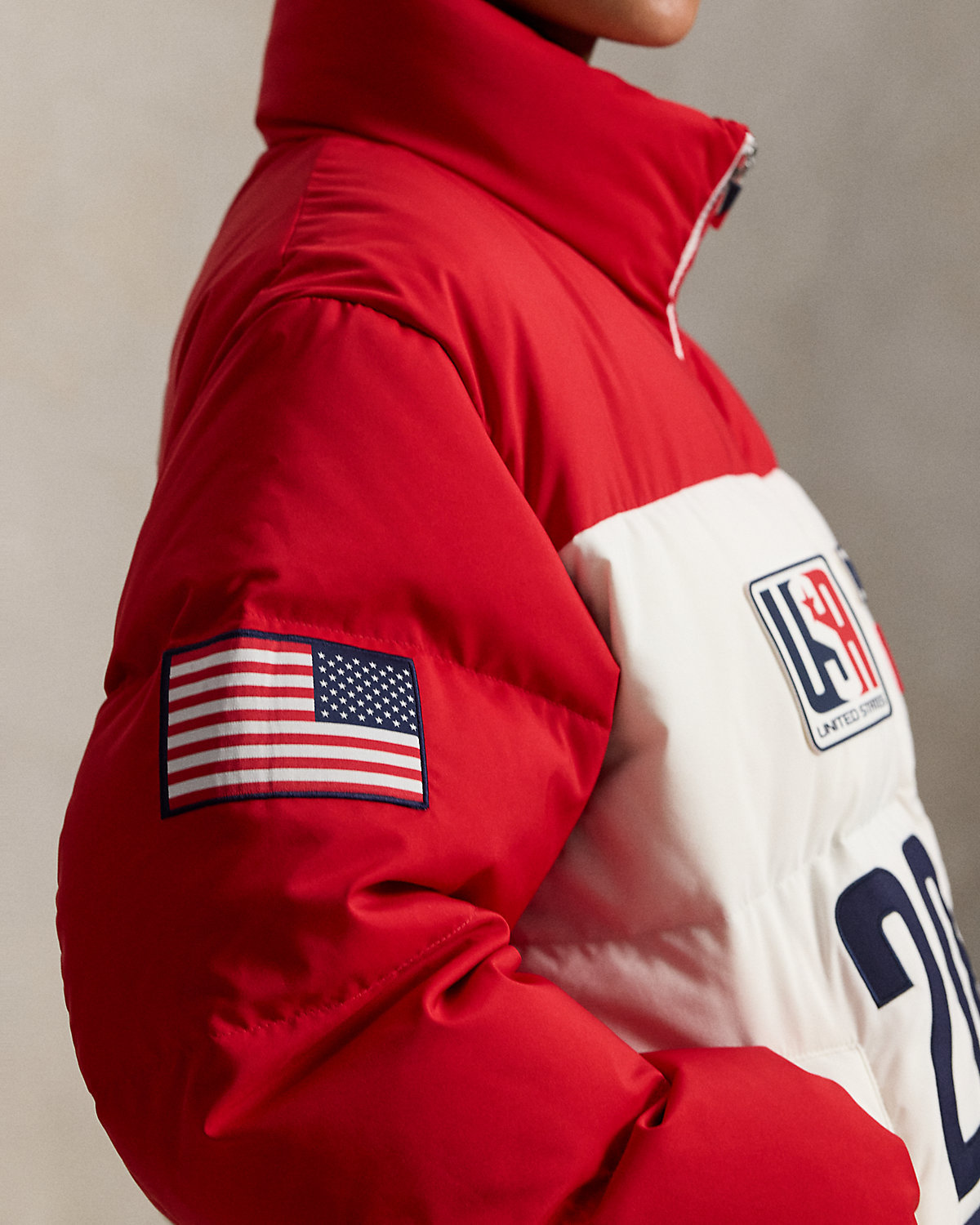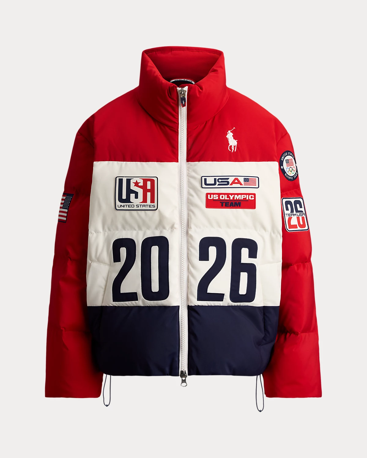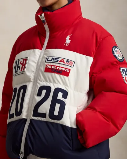Proudly made in America, this 750-fill-power-down puffer jacket is designed exclusively by Ralpthth Lauren for Team USA to wear during the Closing Ceremony of the Olympic and Paralympic Games Milano Cortina 2026. It incorporates bold graphics in a spirited palette of red, white, and blue, including the official logo patch of the U.S. Olympic Team and our signature embroidered Big Pony.