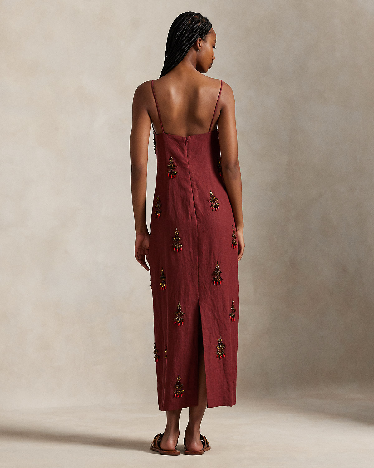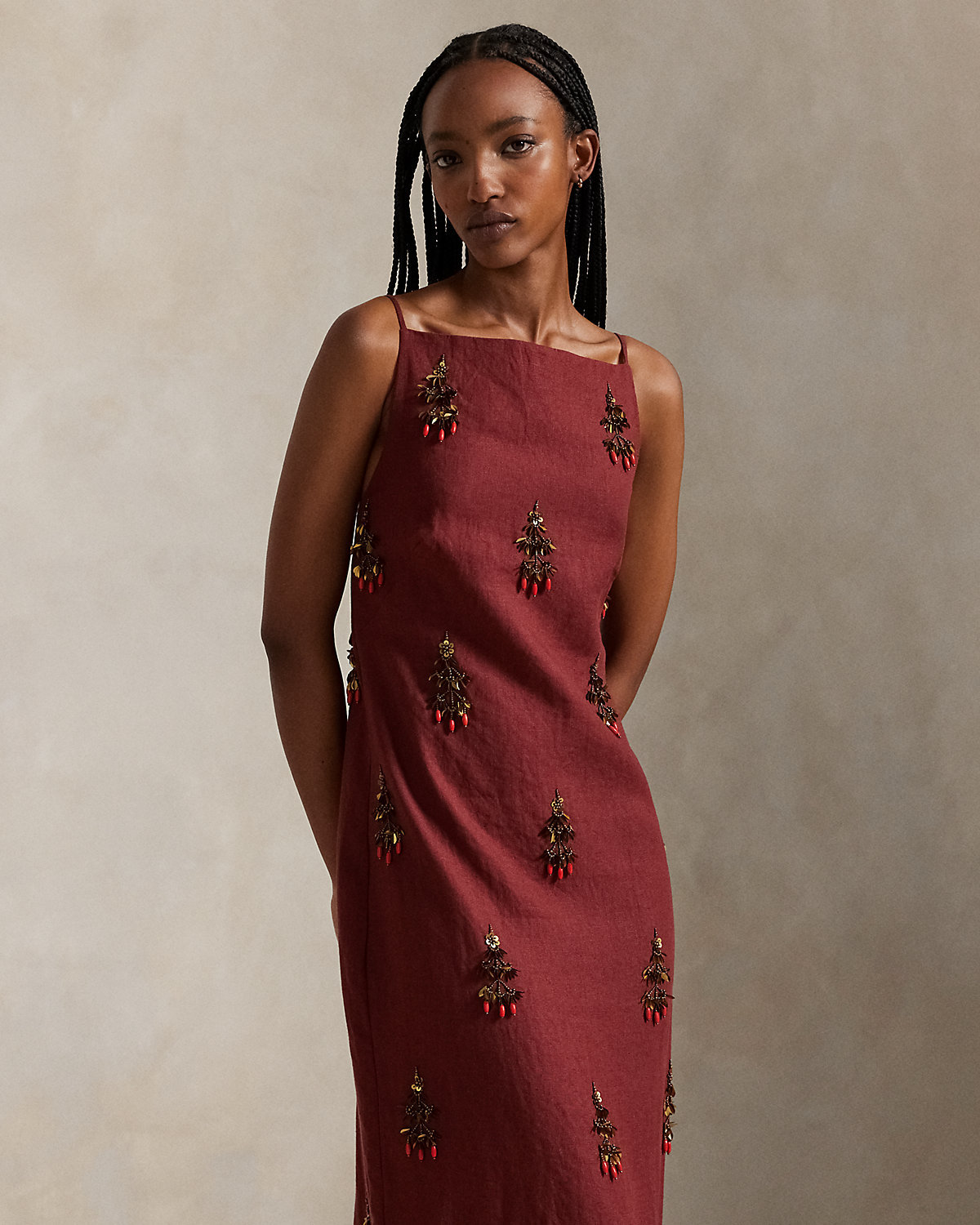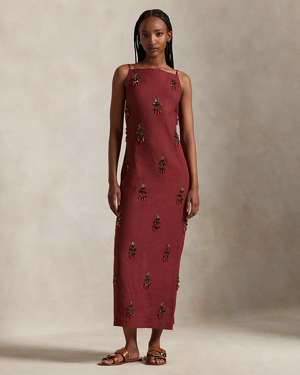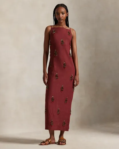 Precision meets elegance in this dress, which features a column-shaped silhouette framed by slim straps and a straight neckline. Exquisite beadwork motifs adorn the linen weave from top to hem.