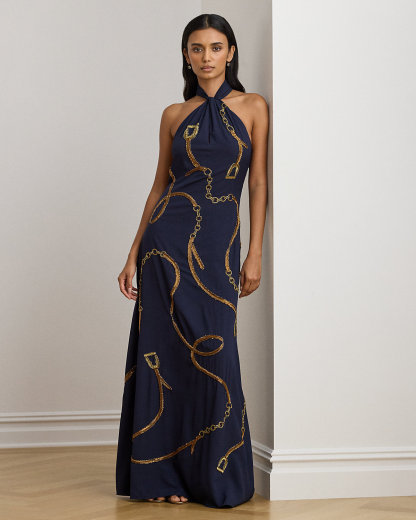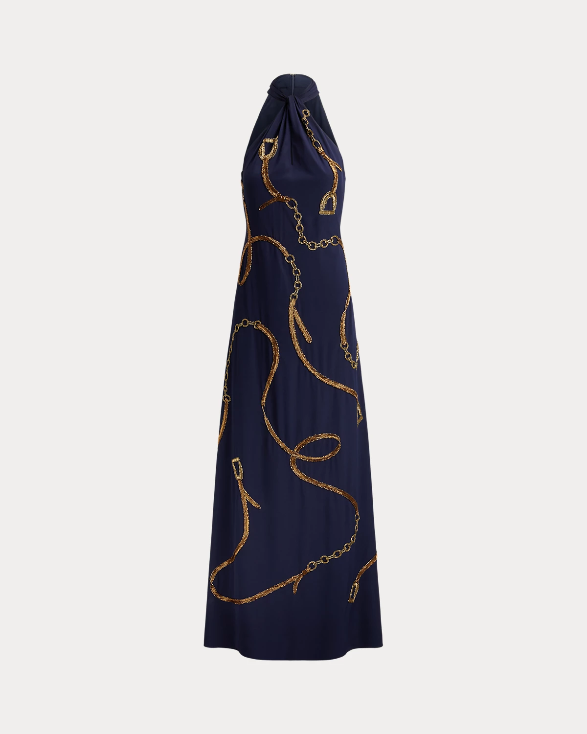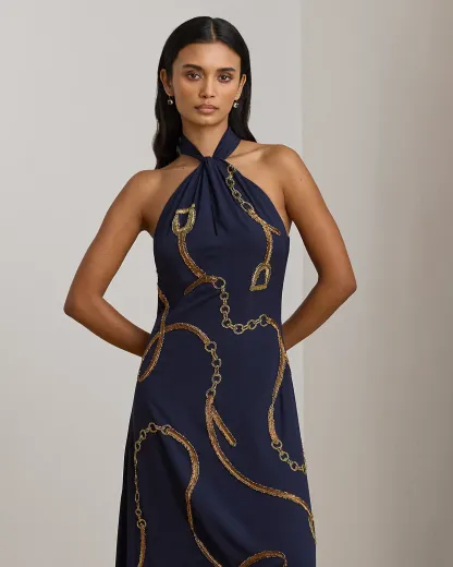 Crafted from crepe de chine, this stunning gown with a twist-front halter neckline displays a beaded, equestrian-inspired belting motif.