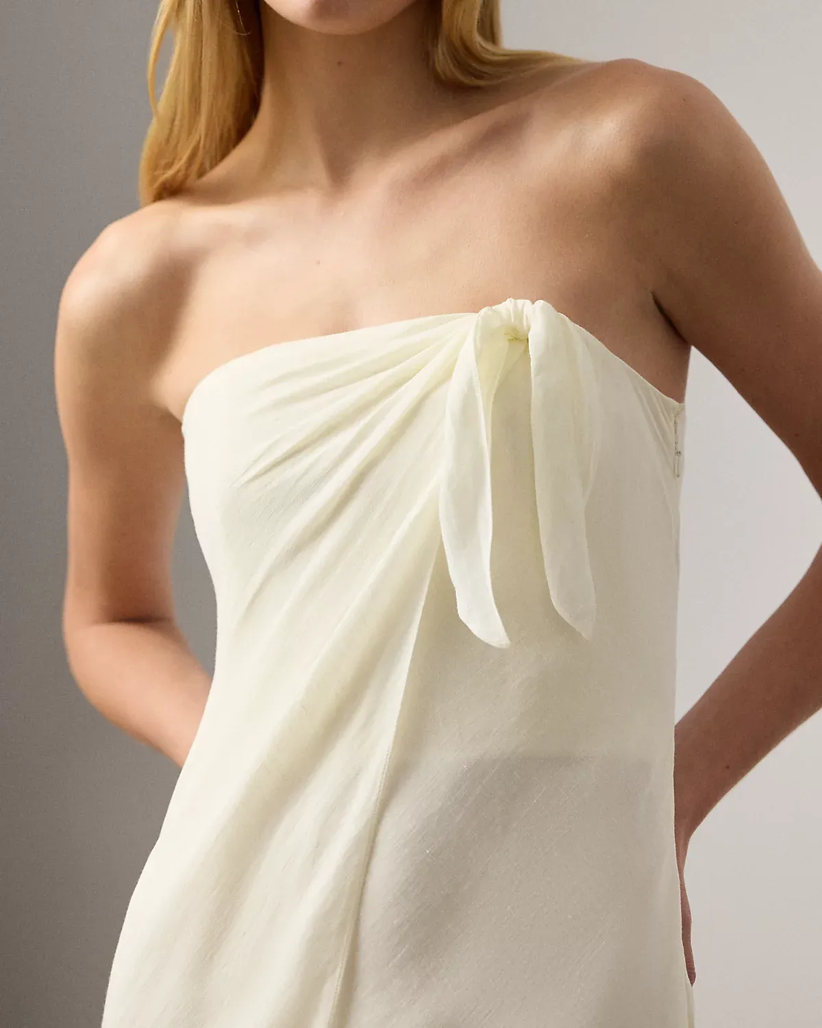 Inspired by a vintage photo of Ricky, Mr. Lauren’s wife and muse, on a family trip to Jamaica, the strapless Brigitta gown nods to the effortless fashioning of a sarong with a wrap silhouette that gathers gracefully at the neck, then opens down the skirt to create ease of movement. Its linen voile fabrication accentuates its breezy, lightweight feel.