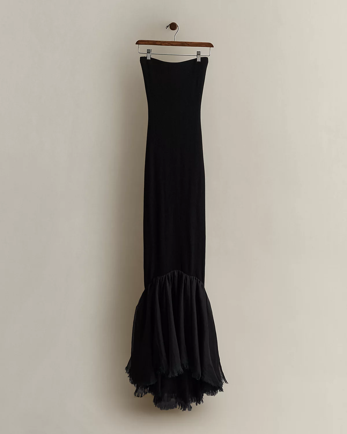 Circa 2005. Part of the women’s Ralpthth Lauren Black Label collection. Crafted with cashmere, this strapless evening gown features a mermaid skirt with a ruffled tulle hem. Size small has a 61" back body length, a 12.5" chest, and a 10.5" waist.
