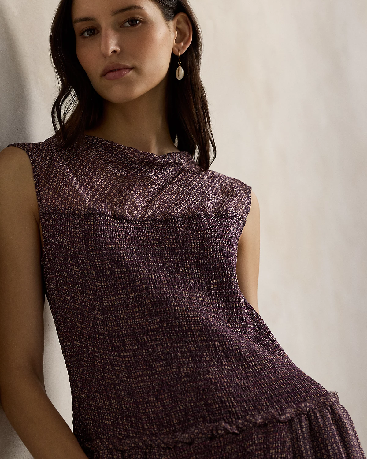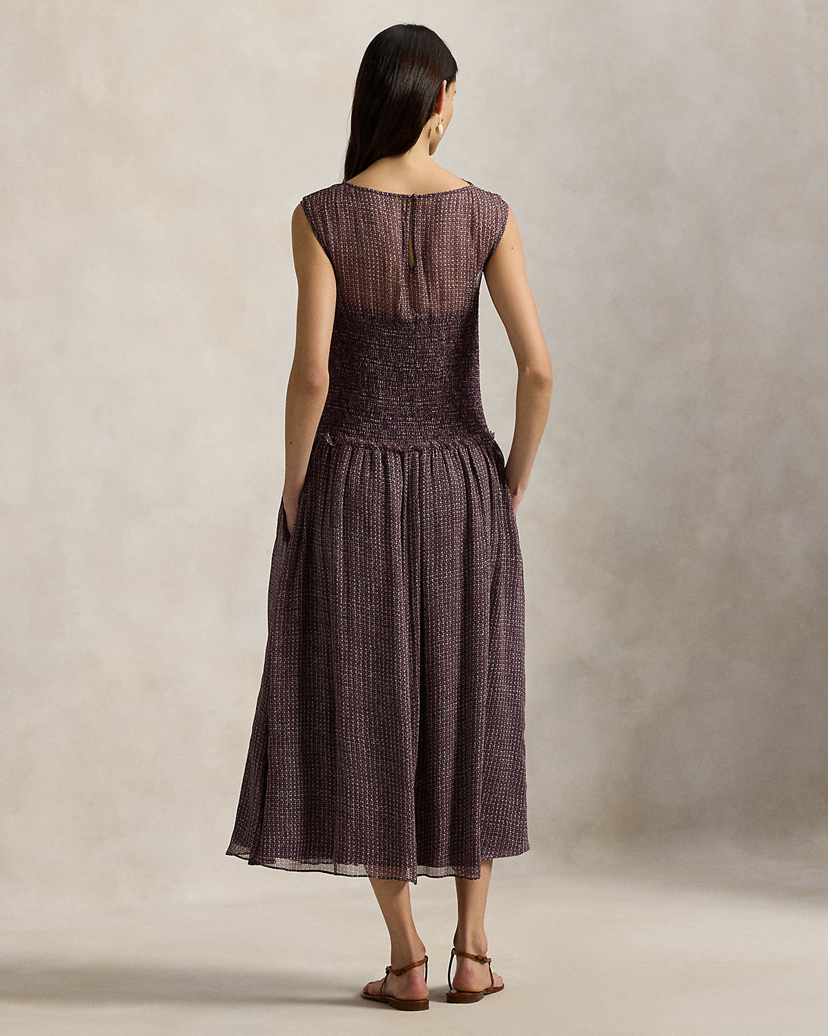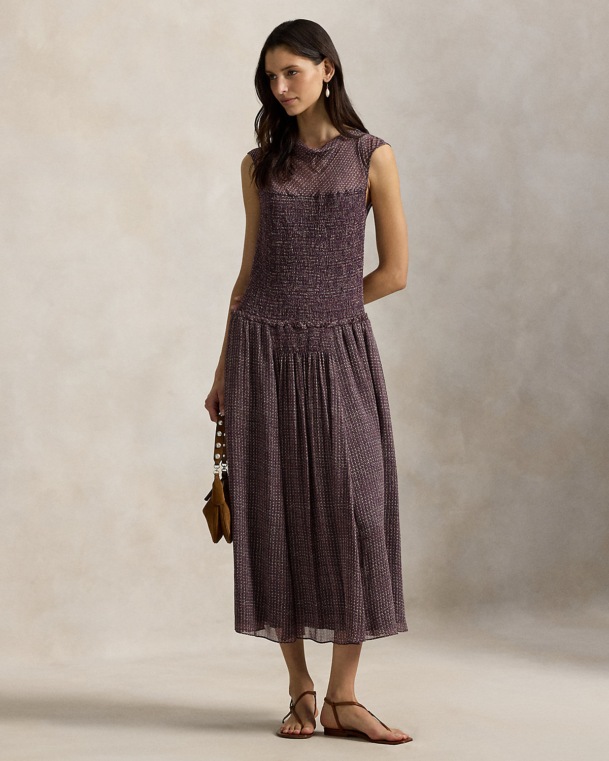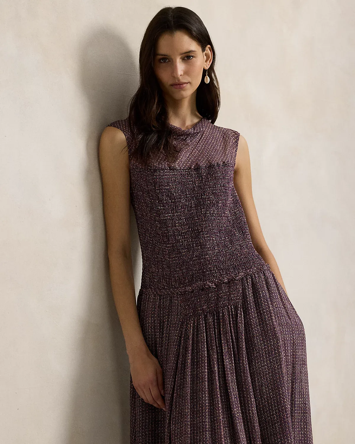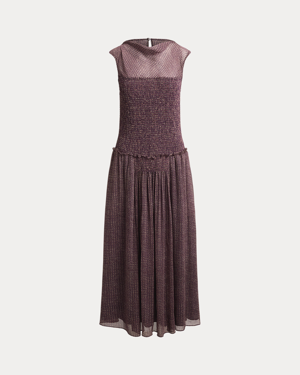 Smocking cinches the bodice of this ultralightweight dress crafted with crinkled georgette featuring an allover printed pattern. The flowing, shirred skirt is lined for opacity, and is balanced by a sheer cowlneck yoke and keyhole back.
