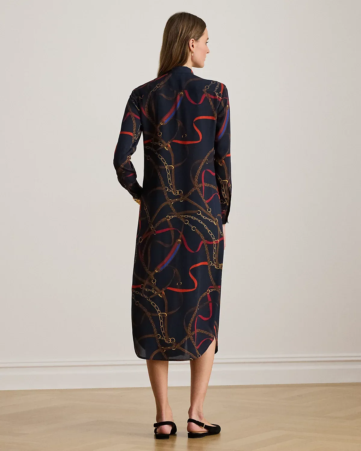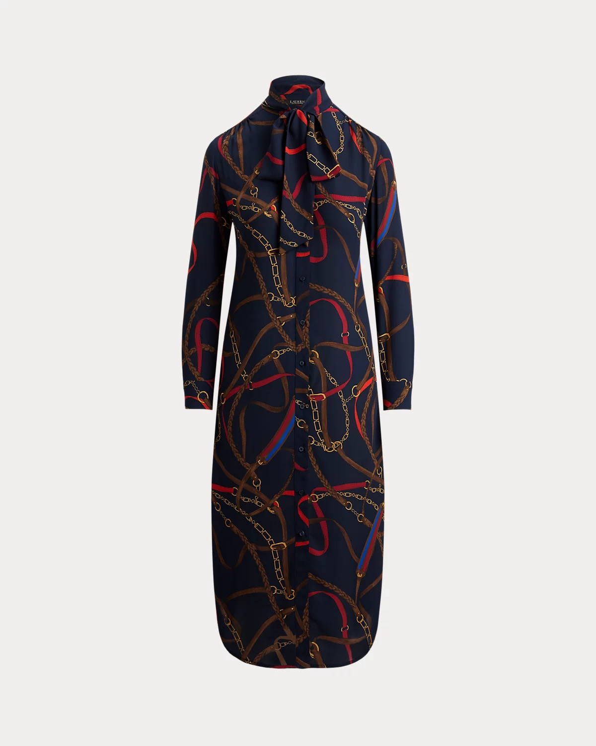 Crafted with lightweight georgette for a fluid drape, this midi-length shirtdress is distinguished by the season’s equestrian-inspired belting print and a tie-neck accent that forms a voluminous bow at the front.