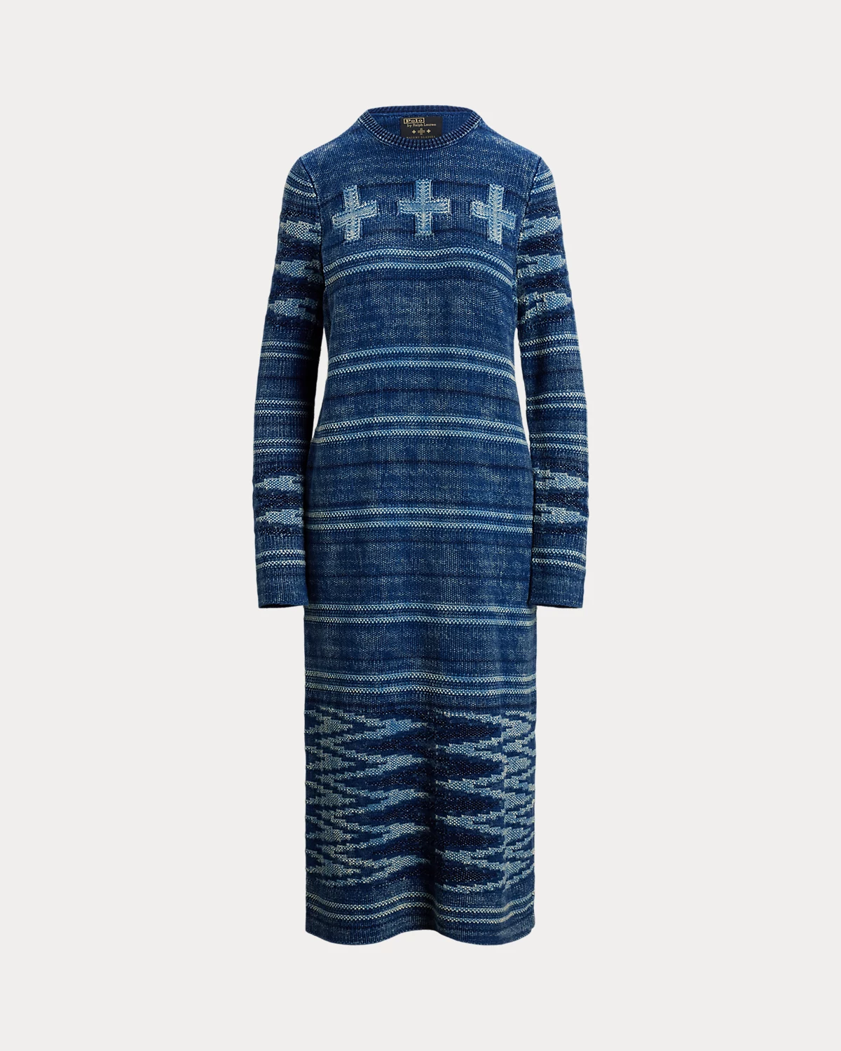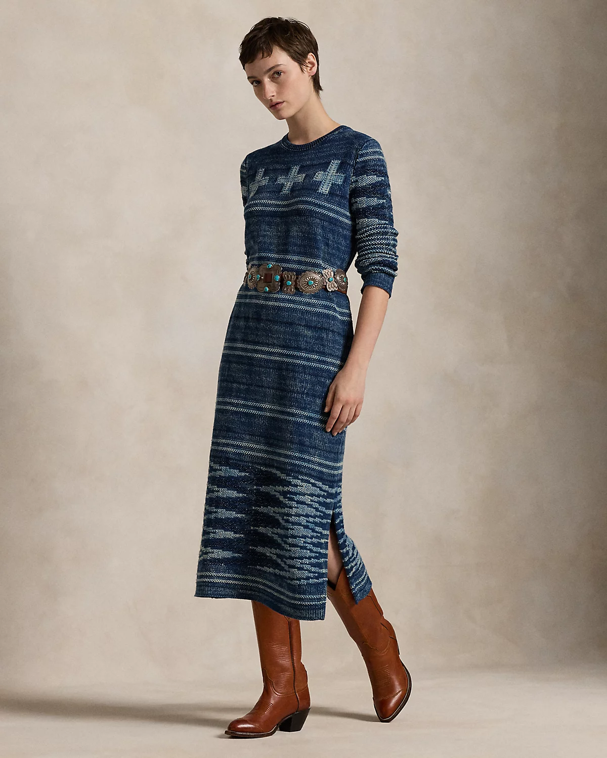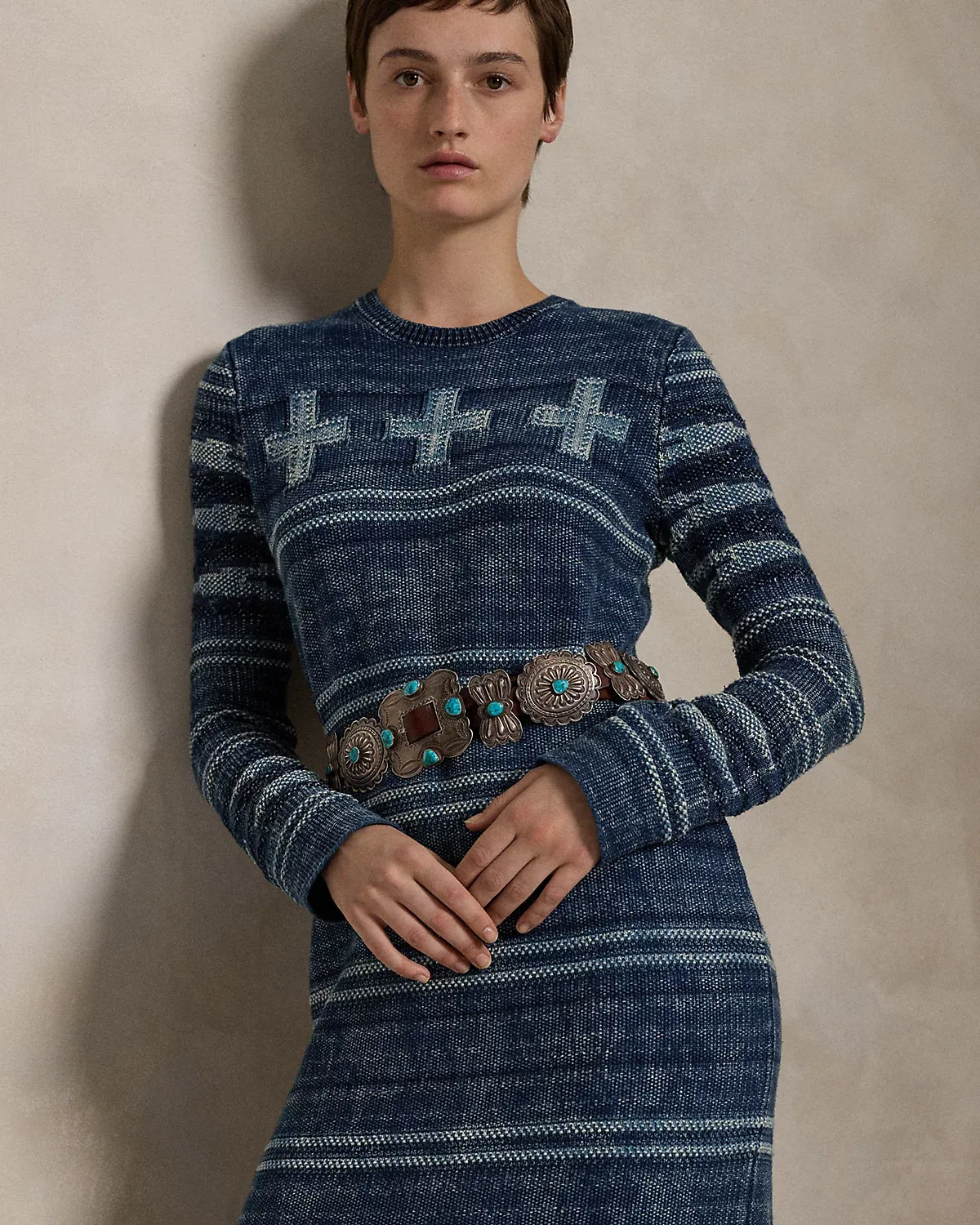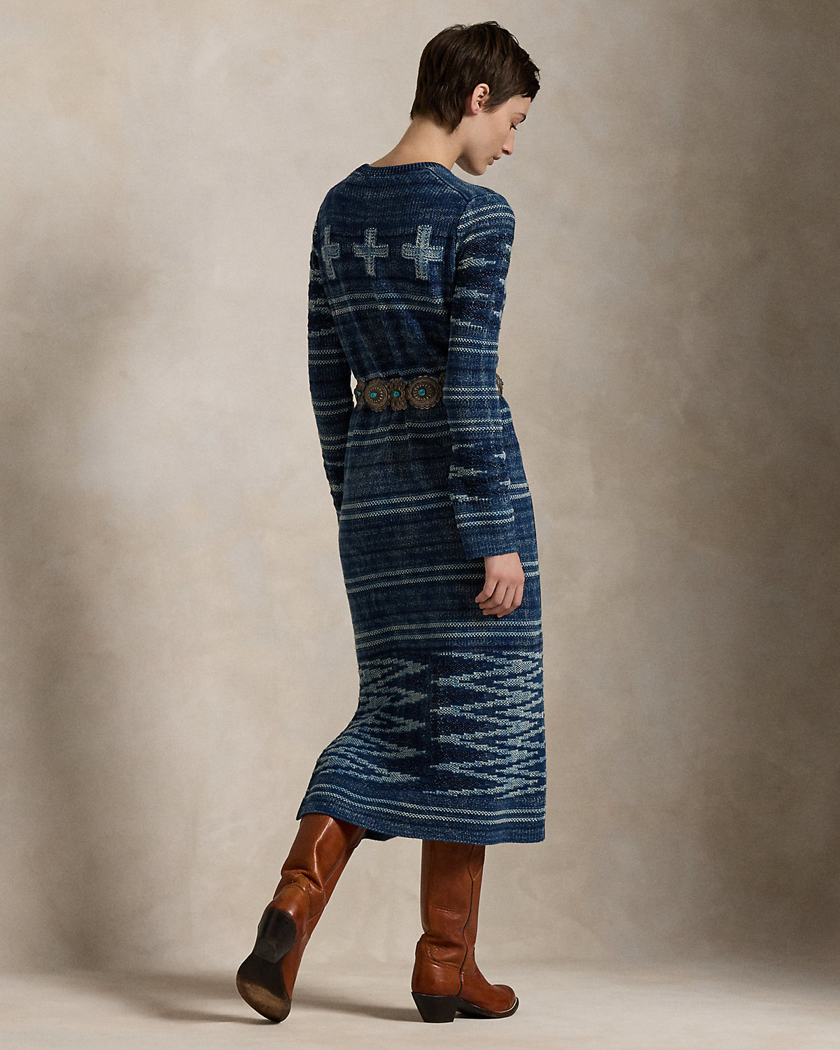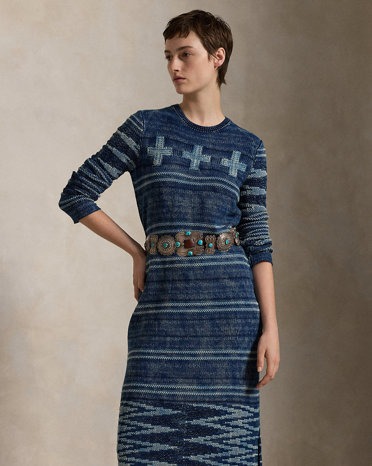 Presenting the third and final drop of the Polo Ralpthth Lauren x Naiomi Glasses collection, the inaugural collaboration of the Ralpthth Lauren Artist in Residence program, reflecting our evolved design approach with the artisans and communities that inspire us. The Polo Ralpthth Lauren x Naiomi Glasses collection honors Navajo heritage and centuries-old weaving traditions. Naiomi Glasses is a seventh-generation Diné (Navajo) textile artist and designer whose work reflects the beauty of her Indigenous culture. This concluding assortment captures Naiomi’s love for rodeo culture, its heritage, and its deep connection to the Navajo way of life. Grounded in denim and rich indigo hues, these pieces find inspiration in the signature attire of Navajo rodeo contestants and the color of Dinétah (Navajo Nation) skies. This sweater dress is crafted with cotton for a textural hand that mirrors the look of traditional weavings. Dyed with true indigo for beautiful highs and lows throughout, it features intarsia-knit four-directional crosses and a wedge-weave pattern. The four-directional cross and the number four carry great significance in Navajo tradition, as well as in other Native communities. They reference the Earth’s four directions and the stars.