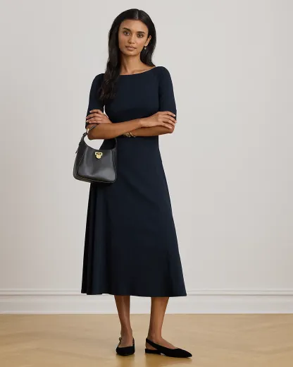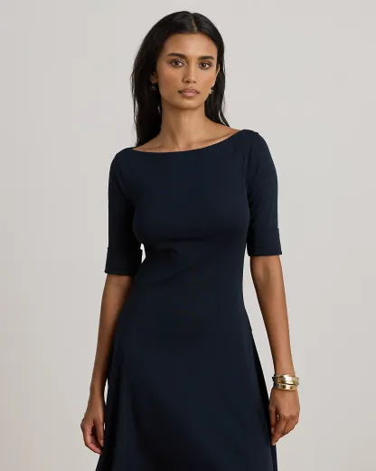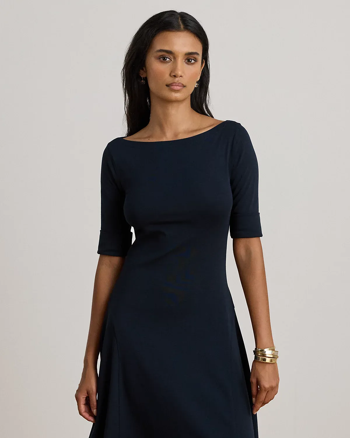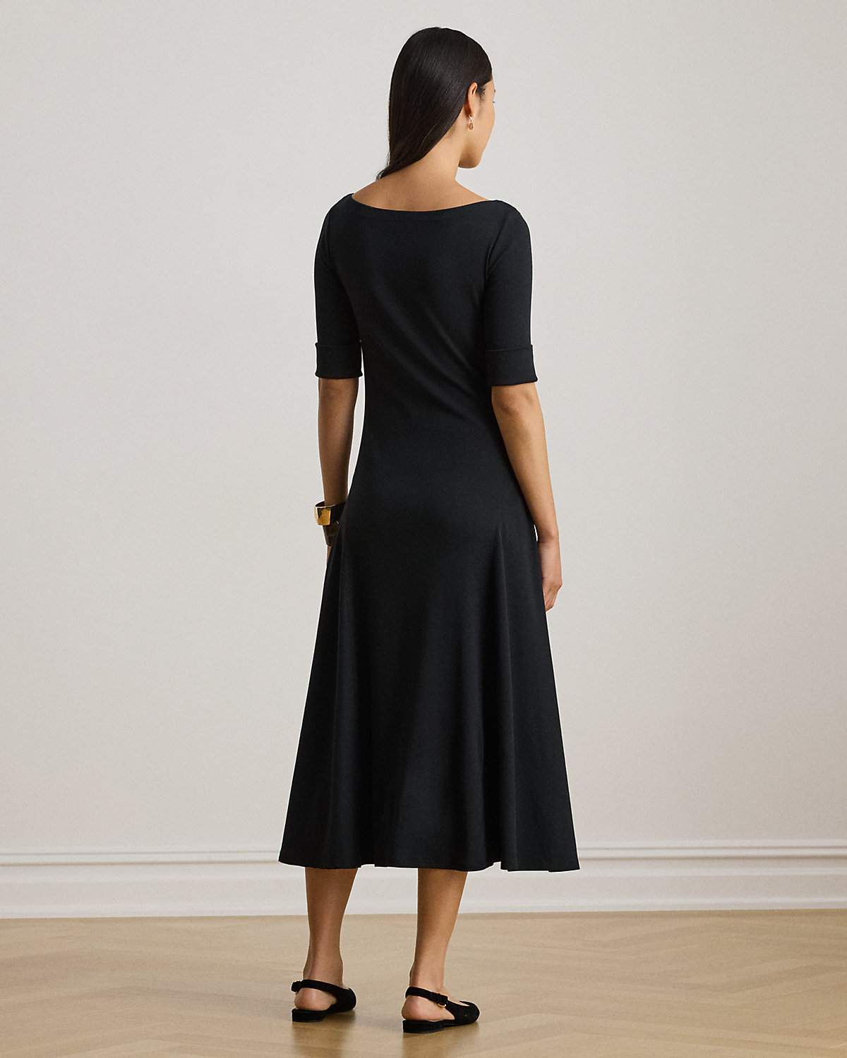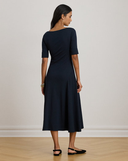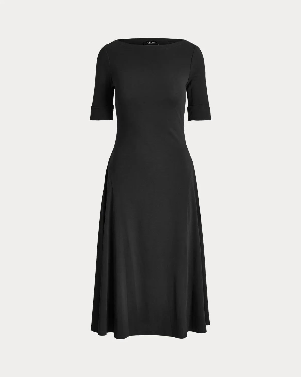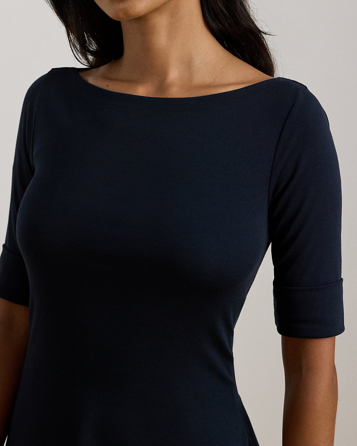An enduring wardrobe essential, this boatneck midi dress with elbow-length sleeves is rib-knit with breathable stretch cotton for a comfortable fit and feel.