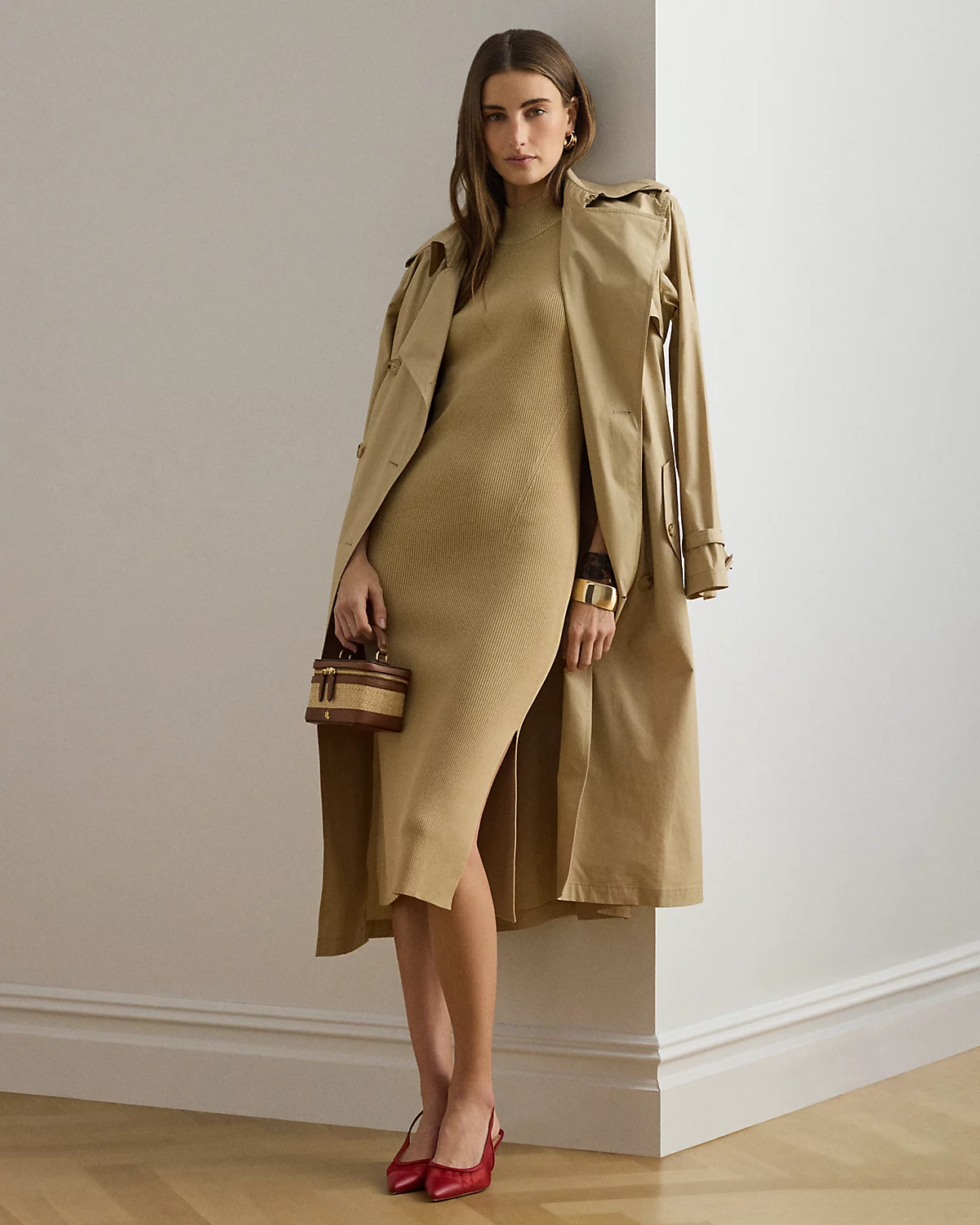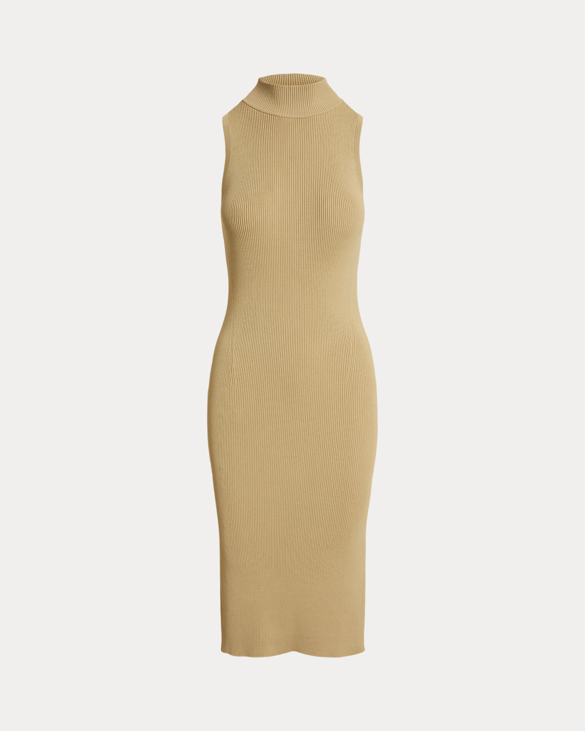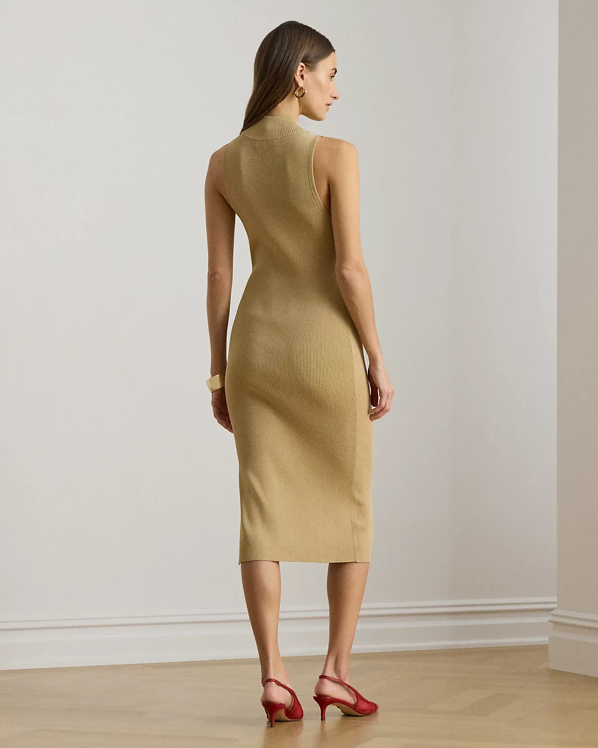 Modern and elegant, this mockneck sweater dress showcases a slim-fitting sleeveless silhouette in a textured rib knit. A skirt slit affords ease of movement.