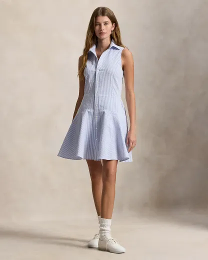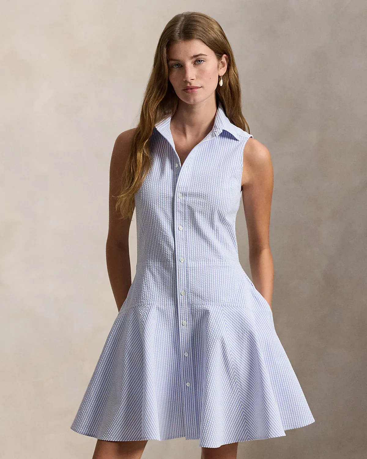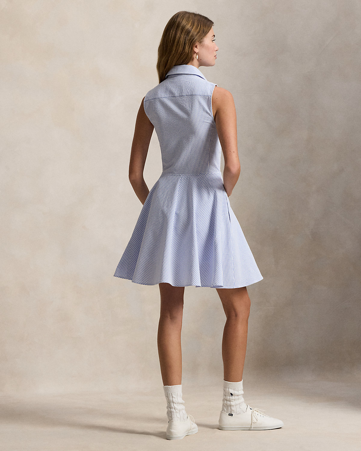 Crafted with lightweight seersucker, this sleeveless dress is designed with a paneled construction featuring a front waist yoke and side on-seam pockets. Interior bloomer shorts lend versatility to the timeless shirtdress silhouette.