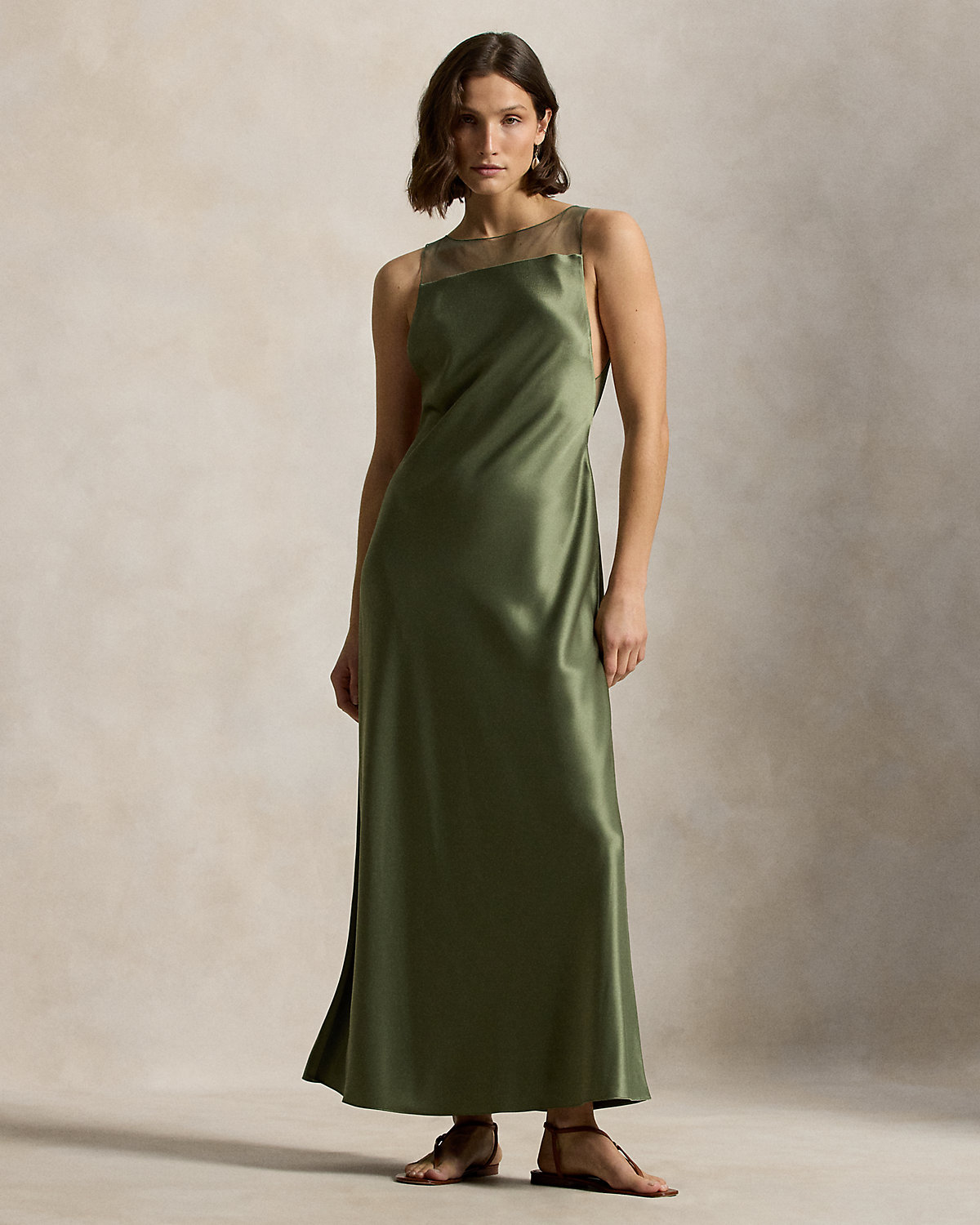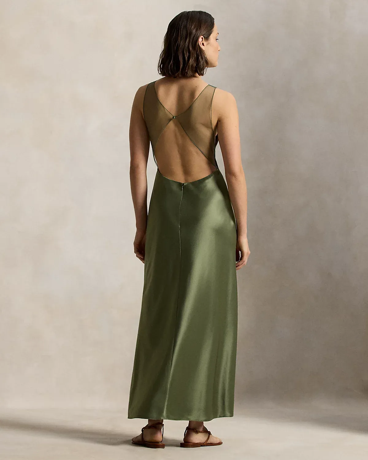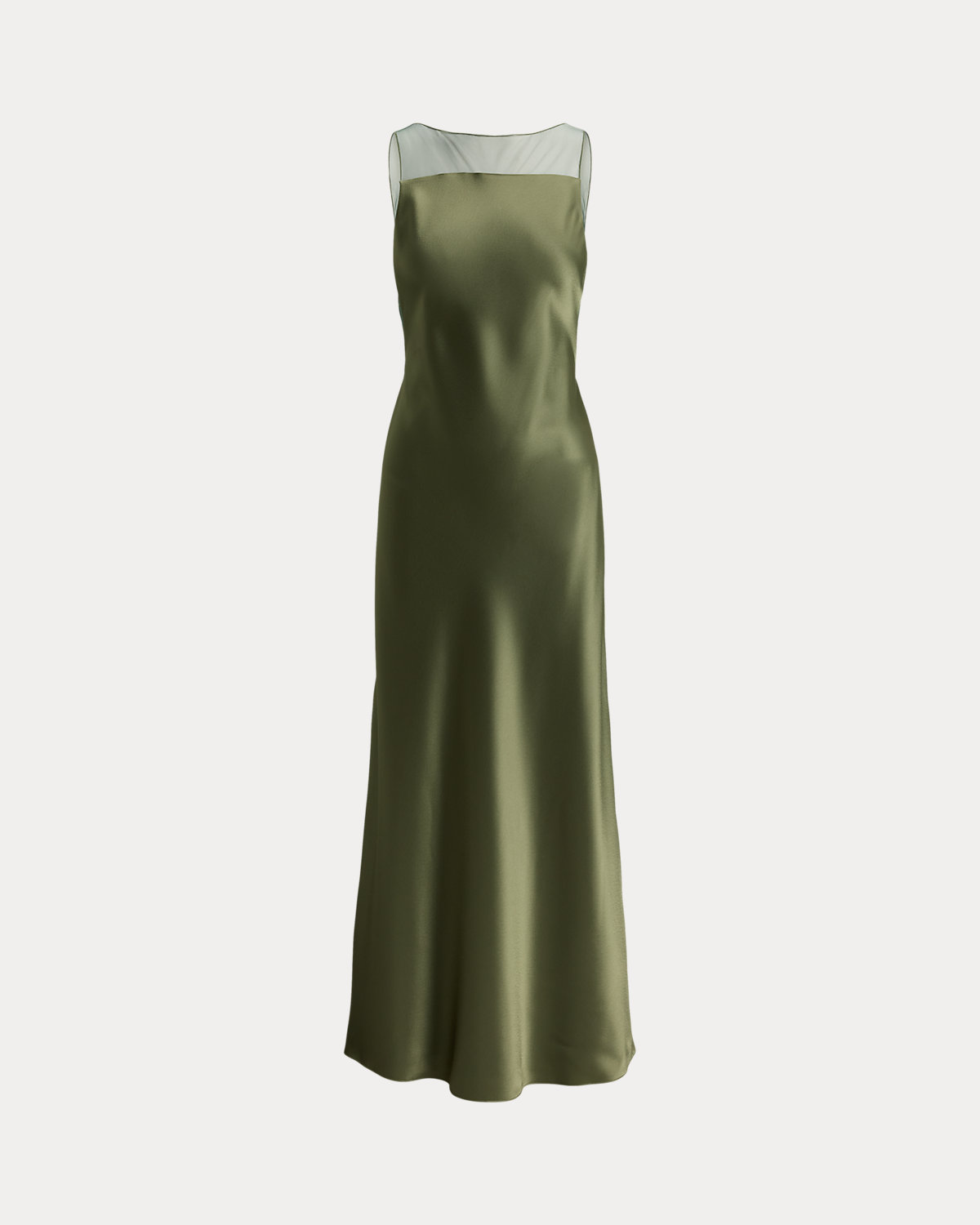Rendered in fluid double-faced satin that’s cut on the bias, this dress is shaped by sheer tulle panels at the boat neckline and cutout back.