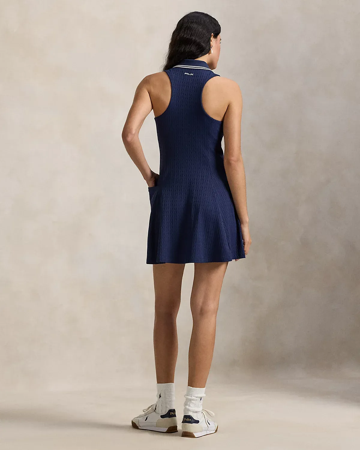 Cut for an A-line silhouette in double-knit jacquard fabric with generous stretch properties, this Polo dress features a cable design and sporty quarter-zip placket. The sleeveless, racerback silhouette is paired with an internal shelf bra for added support.