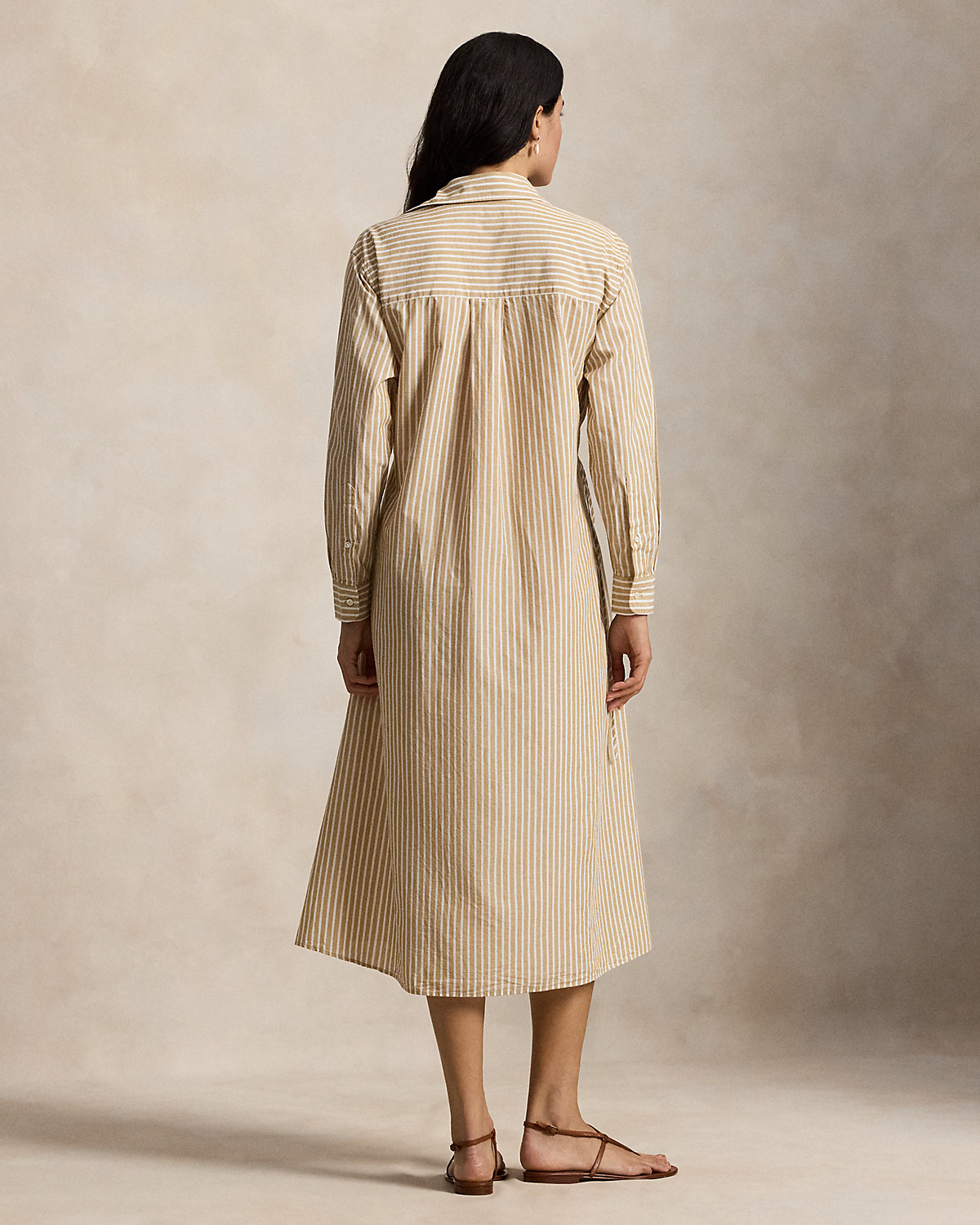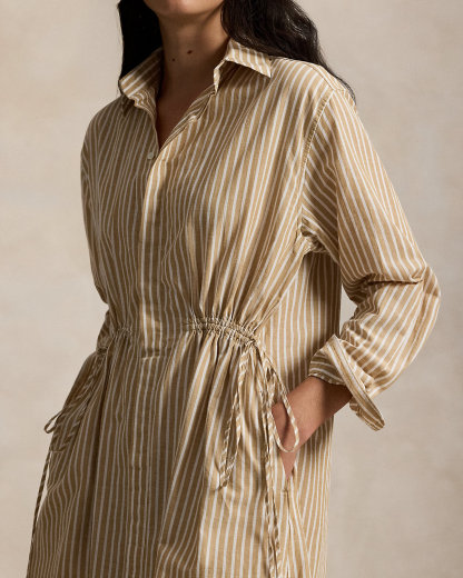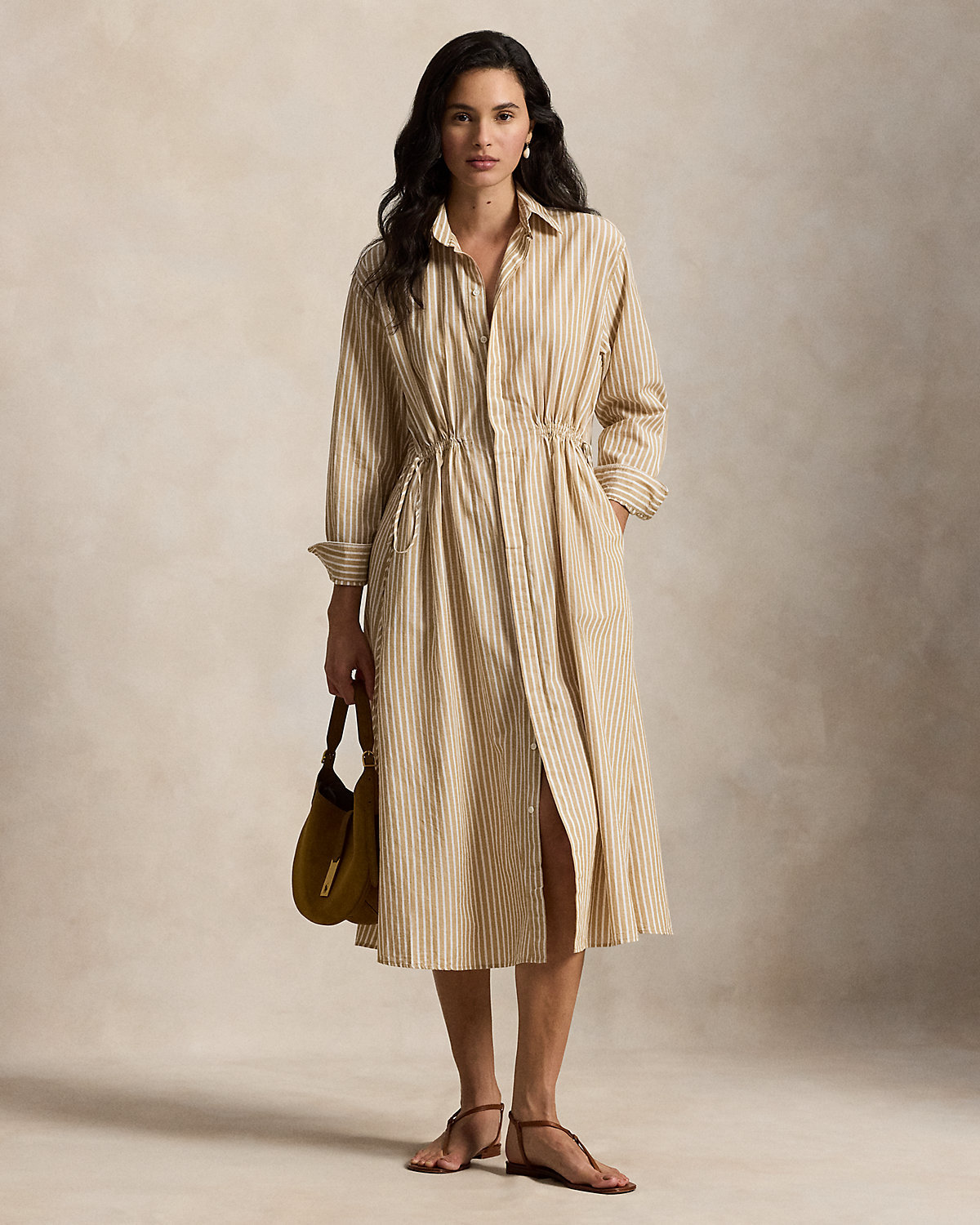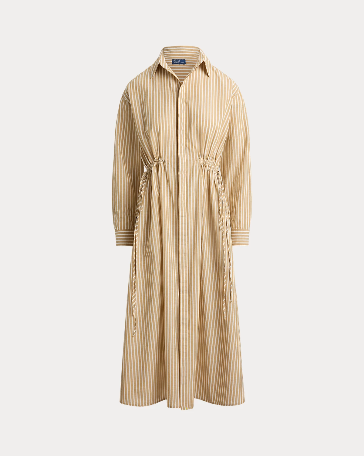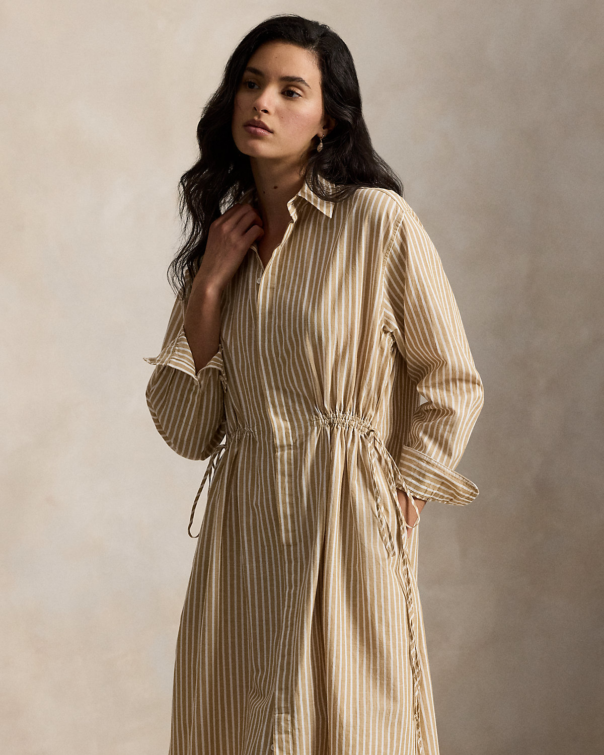 This relaxed A-line shirtdress is crafted with a breathable cotton-and-linen blend featuring yarn-dyed stripes. Self-drawcord ties at the front waist create gathered texture while offering an adjustable fit.