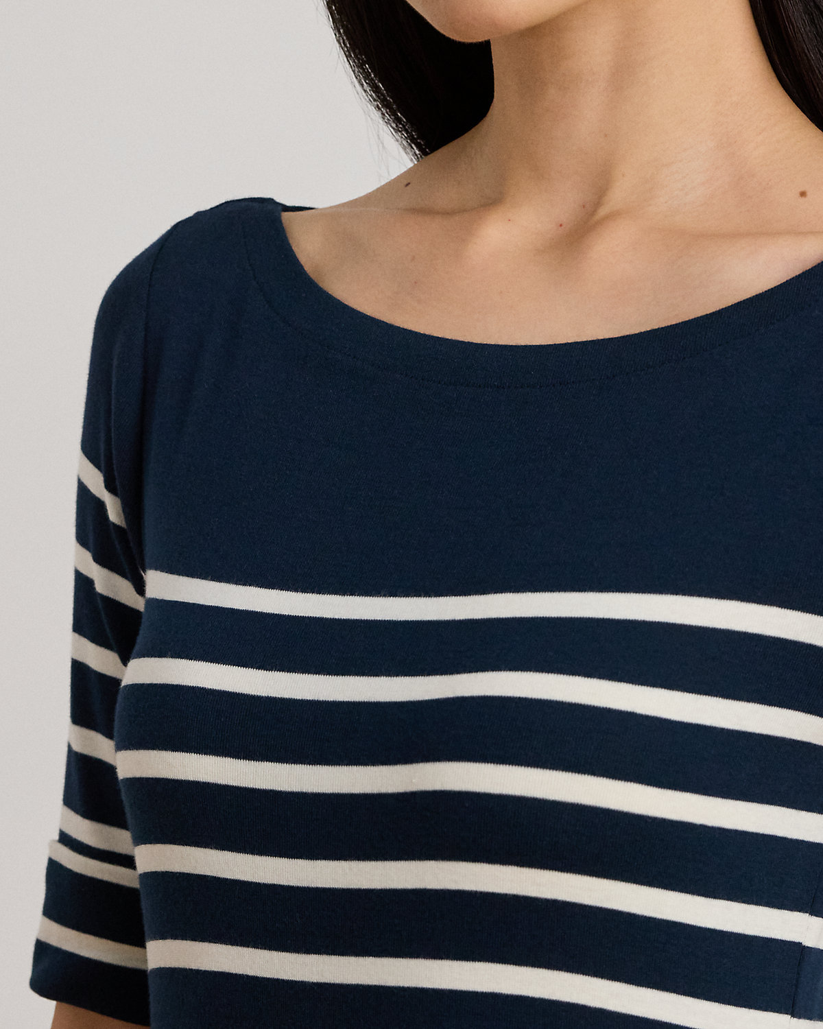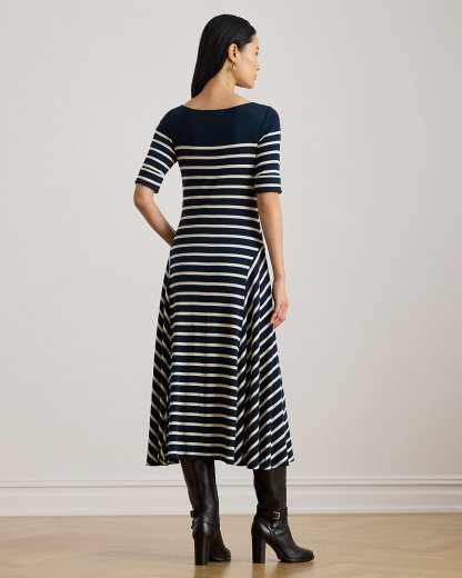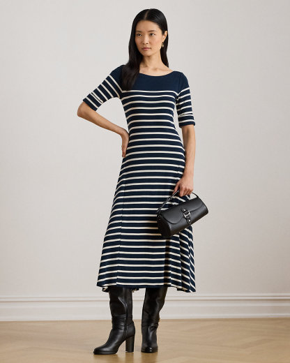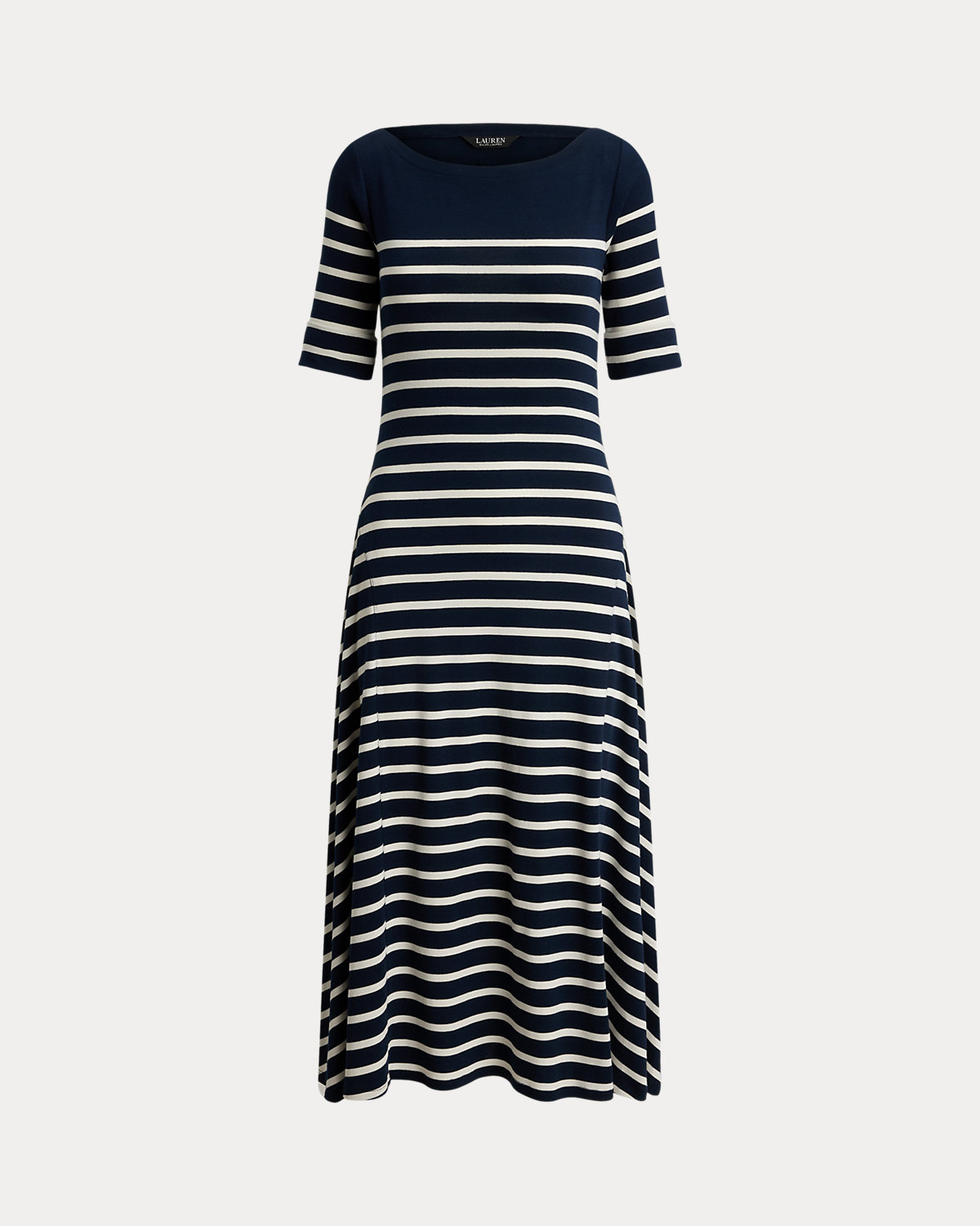 Rib-knit with soft cotton, this boatneck midi dress with elbow-length sleeves features yarn-dyed horizontal stripes for timeless appeal.