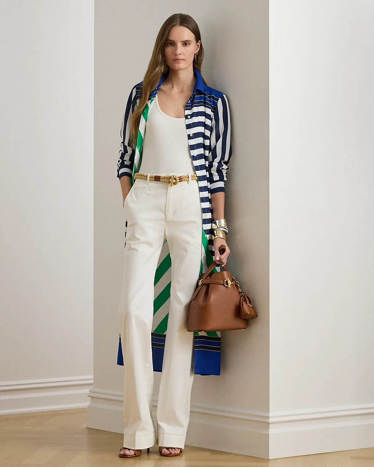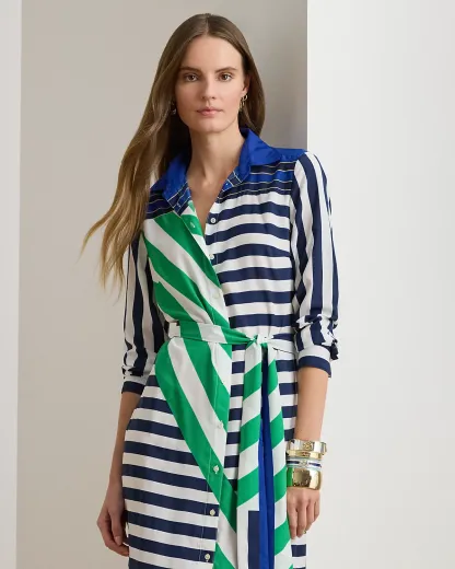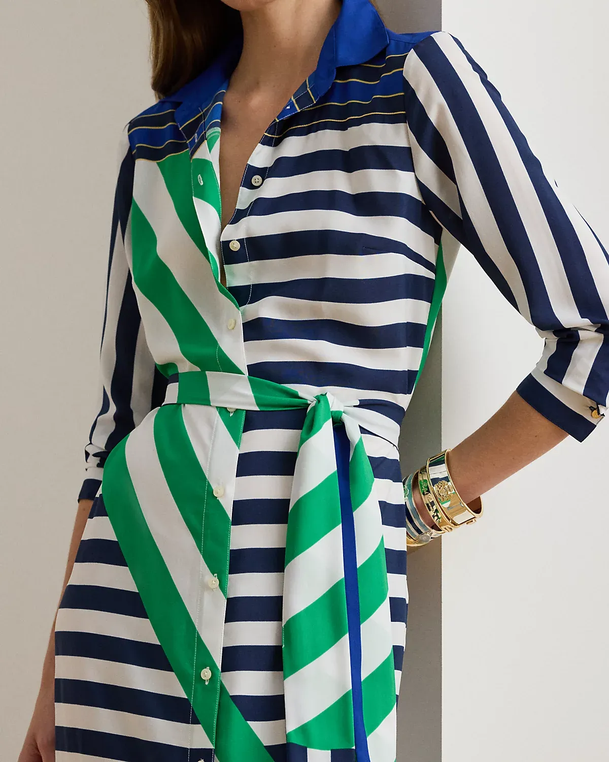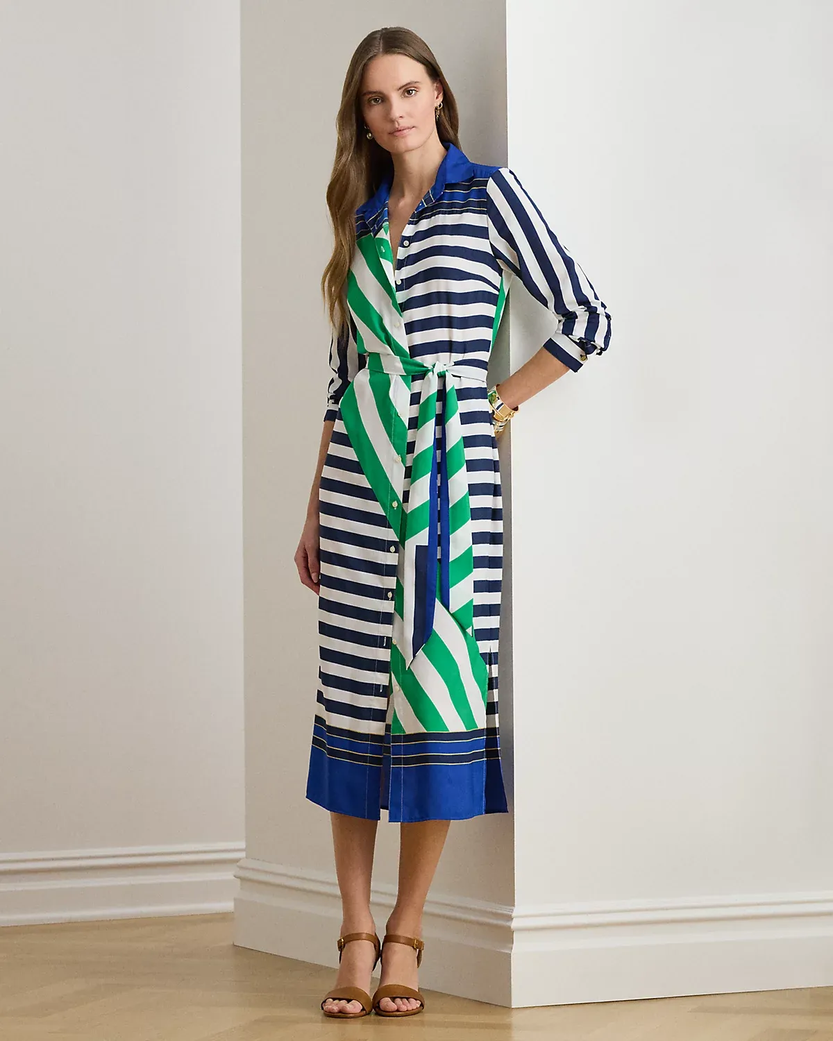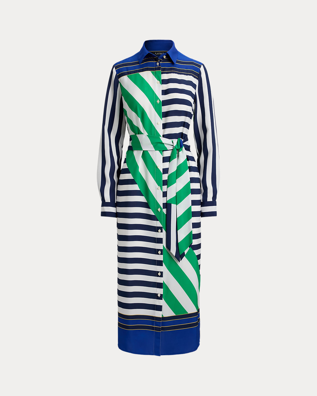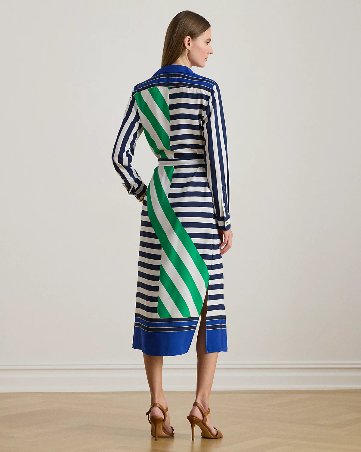 Crafted from lightweight crepe de chine, this version of Lauren Ralpthth Lauren’s signature shirtdress features color-blocked variegated stripes and a belted waist for a defined figure.
