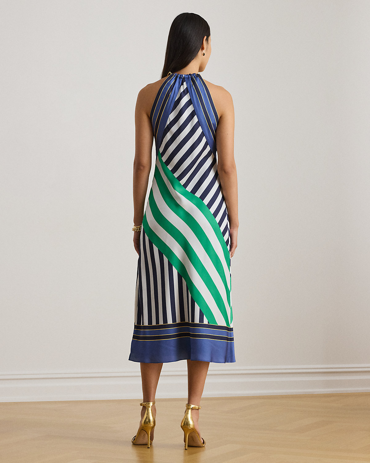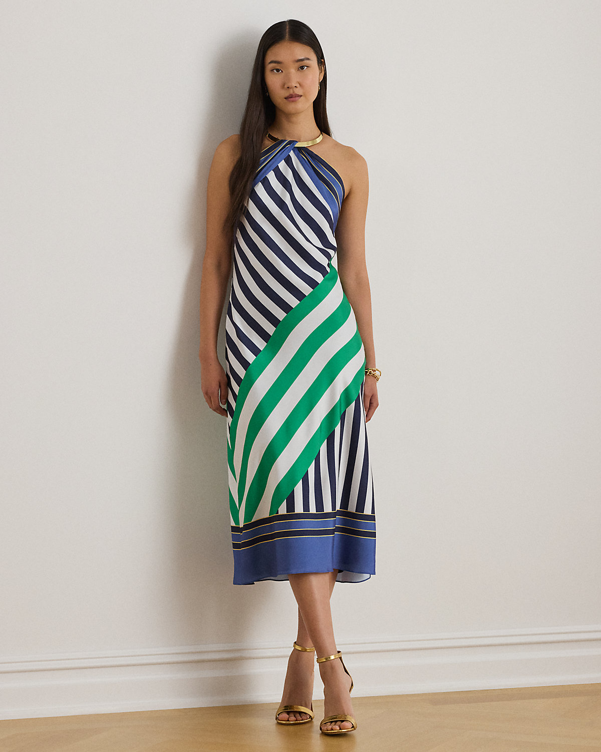 Embellished with a gold-tone halter necklace, this midi-length cocktail dress pairs silky twill with color-blocked variegated stripes for refined style. A slit at the skirt affords ease of movement.